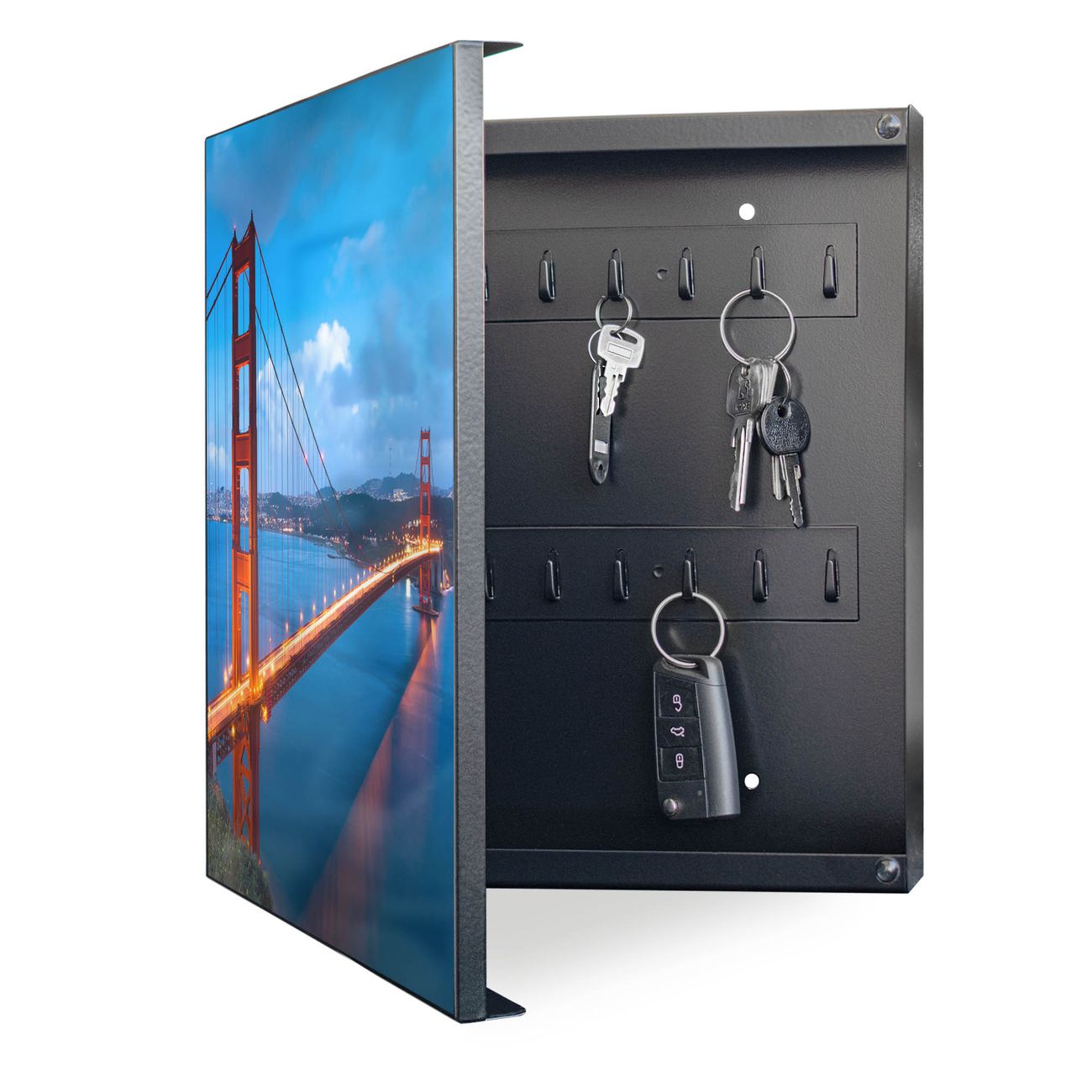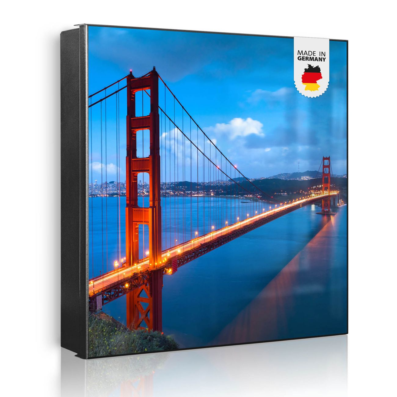 Bringe Ordnung und Eleganz in deinen Eingangsbereich mit dem banjado Schlüsselkasten Motiv Motiv Golden Gate Bridge. Die moderne Schlüsselbox kombiniert funktionales Design mit hochwertiger Verarbeitung und wird so zu einem echten Hingucker in Flur, Büro oder Ferienwohnung. ✅ Stilvolle Schlüsselaufbewahrung mit Motiv Motiv Golden Gate Bridge Der Design-Schlüsselkasten Motiv Motiv Golden Gate Bridge bietet Platz für bis zu 32 Schlüssel, die auf 4 stabilen Reihen mit je 8 Haken übersichtlich verstaut werden. Mit seinen kompakten Maßen von 30 x 30 x 5 cm passt die Schlüsselbox perfekt auch in kleinere Räume. Der schwarz lackierte Stahlkorpus mit links angeschlagenem Türscharnier harmoniert mit gedruckten Folie auf der Front und fügt sich nahtlos in jedes Wohnambiente ein. Ob als Schlüsselorganizer für Zuhause oder als praktische Lösung für Büros, Praxen und Gewerbe, der banjado Schlüsselkasten sorgt für Ordnung und Übersicht. Dank der magnetischen, mit Kreidestiften beschreibbaren Folie auf der Front kannst du Notizen anheften oder Termine direkt auf der Oberfläche festhalten. Die Schlüsselbox Motiv Motiv Golden Gate Bridge zur Wandmontage wird inklusive Befestigungsmaterial geliefert und ist schnell angebracht. So hast du deine Schlüssel jederzeit griffbereit und zugleich stilvoll verstaut. Mit diesem banjado Schlüsselkasten Motiv Motiv Golden Gate Bridge kombinierst du praktische Aufbewahrung mit stilvollem Wohndesign. Ob privat oder geschäftlich, die Schlüsselbox sorgt für mehr Ordnung, Übersicht und ein wohnliches Ambiente.Vorteile im Überblick