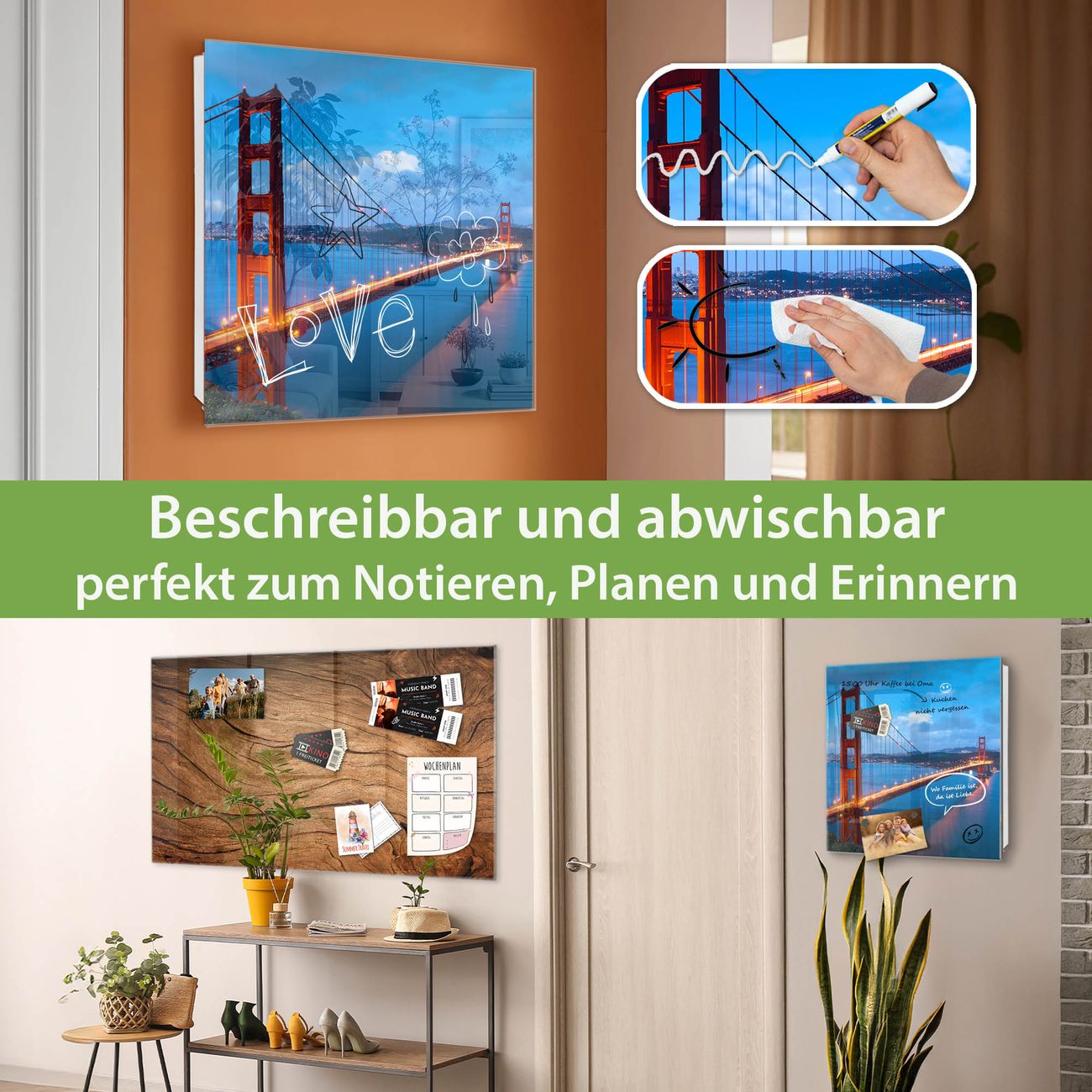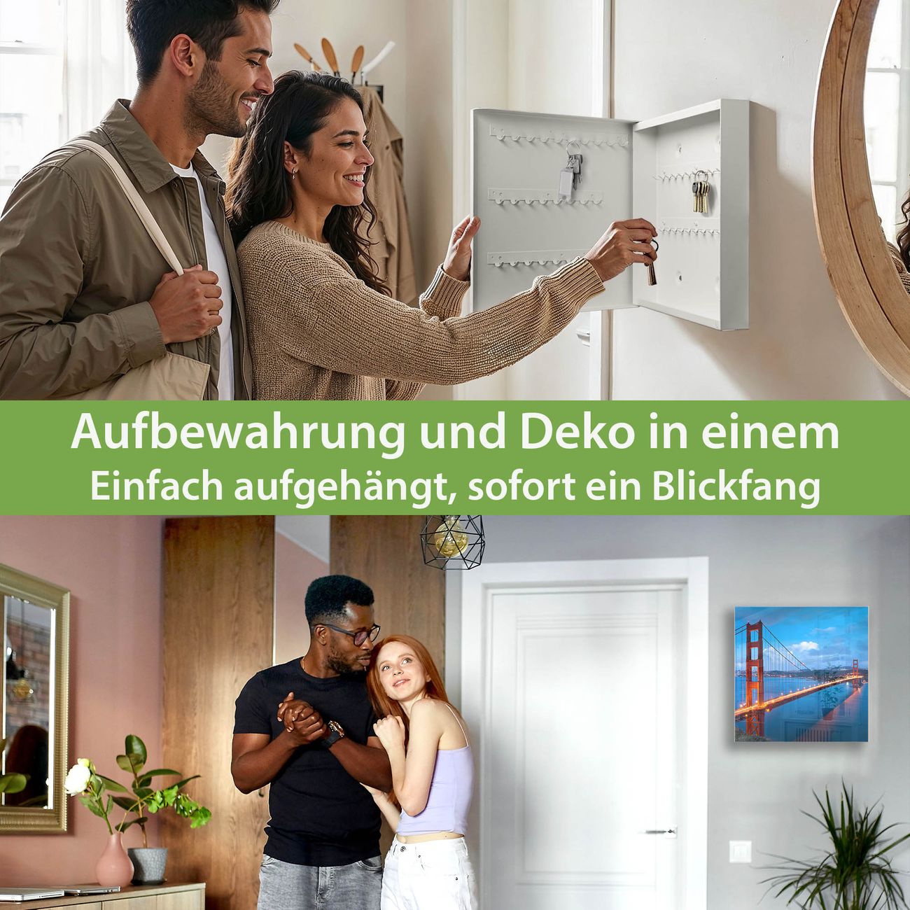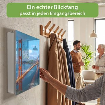 Bringe Ordnung und Eleganz in deinen Eingangsbereich mit dem banjado Schlüsselkasten Motiv Motiv Golden Gate Bridge. Die moderne Schlüsselbox kombiniert funktionales Design mit hochwertiger Verarbeitung und wird so zu einem echten Hingucker in Flur, Büro oder Ferienwohnung. ✅ Stilvolle Schlüsselaufbewahrung mit Glasfront im Motiv Motiv Golden Gate Bridge Der Design-Schlüsselkasten Motiv Motiv Golden Gate Bridge bietet Platz für bis zu 50 Schlüssel, die auf 5 stabilen Reihen mit je 10 Haken übersichtlich verstaut werden. Mit seinen kompakten Maßen von 30 x 30 x 5 cm passt die Schlüsselbox perfekt auch in kleinere Räume. Der weiß lackierte Stahlkorpus mit rechts angeschlagenem Türscharnier harmoniert mit der Glasfront und fügt sich nahtlos in jedes Wohnambiente ein. Ob als Schlüsselorganizer für Zuhause oder als praktische Lösung für Büros, Praxen und Gewerbe, der banjado Schlüsselkasten sorgt für Ordnung und Übersicht. Dank der magnetischen, mit Kreidestiften beschreibbaren Glasfront kannst du Notizen anheften oder Termine direkt auf der Oberfläche festhalten. Die Schlüsselbox Motiv Motiv Golden Gate Bridge zur Wandmontage wird inklusive Befestigungsmaterial geliefert und ist schnell angebracht. So hast du deine Schlüssel jederzeit griffbereit und zugleich stilvoll verstaut. Mit diesem banjado Schlüsselkasten Motiv Motiv Golden Gate Bridge kombinierst du praktische Aufbewahrung mit stilvollem Wohndesign. Ob privat oder geschäftlich, die Schlüsselbox sorgt für mehr Ordnung, Übersicht und ein wohnliches Ambiente.Vorteile im Überblick