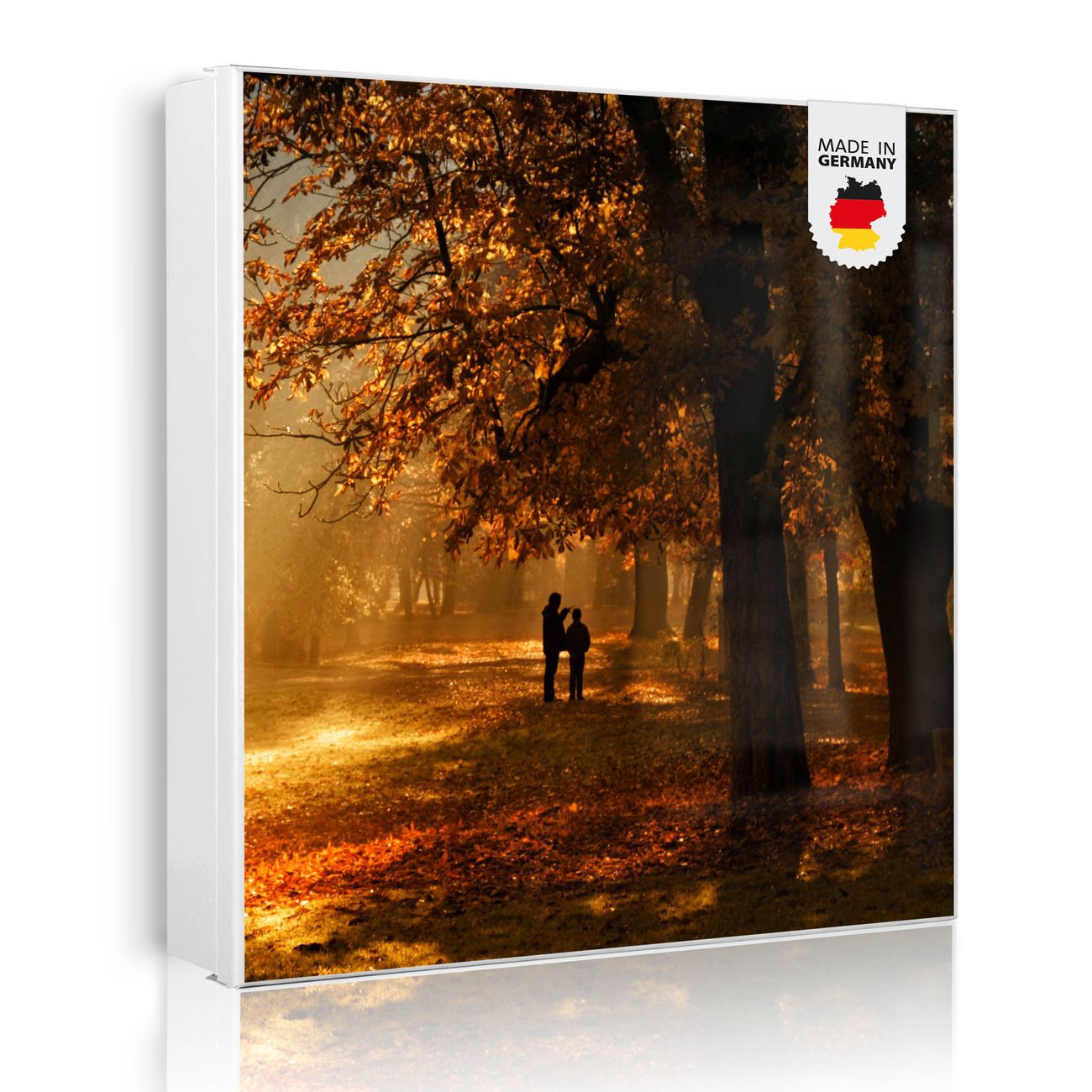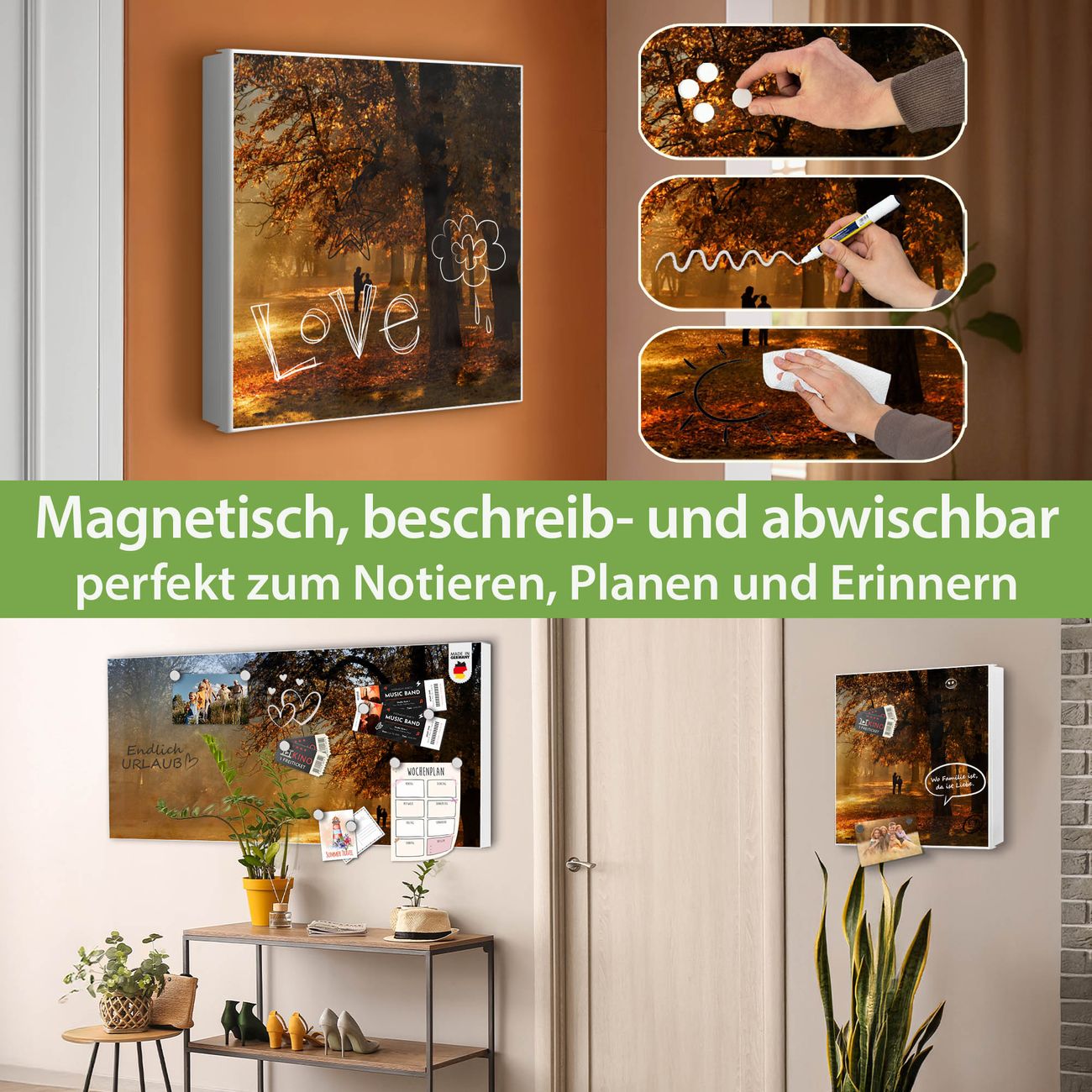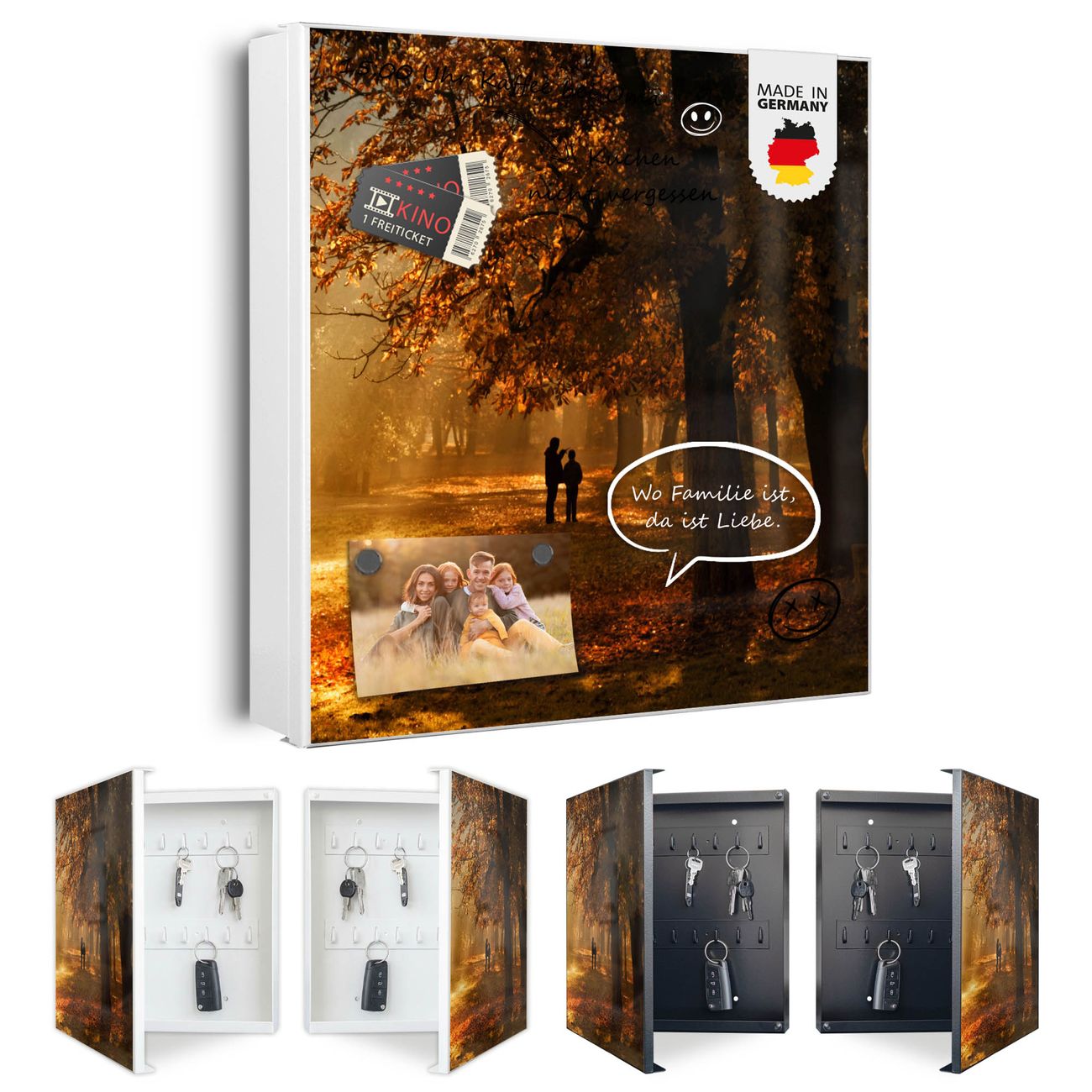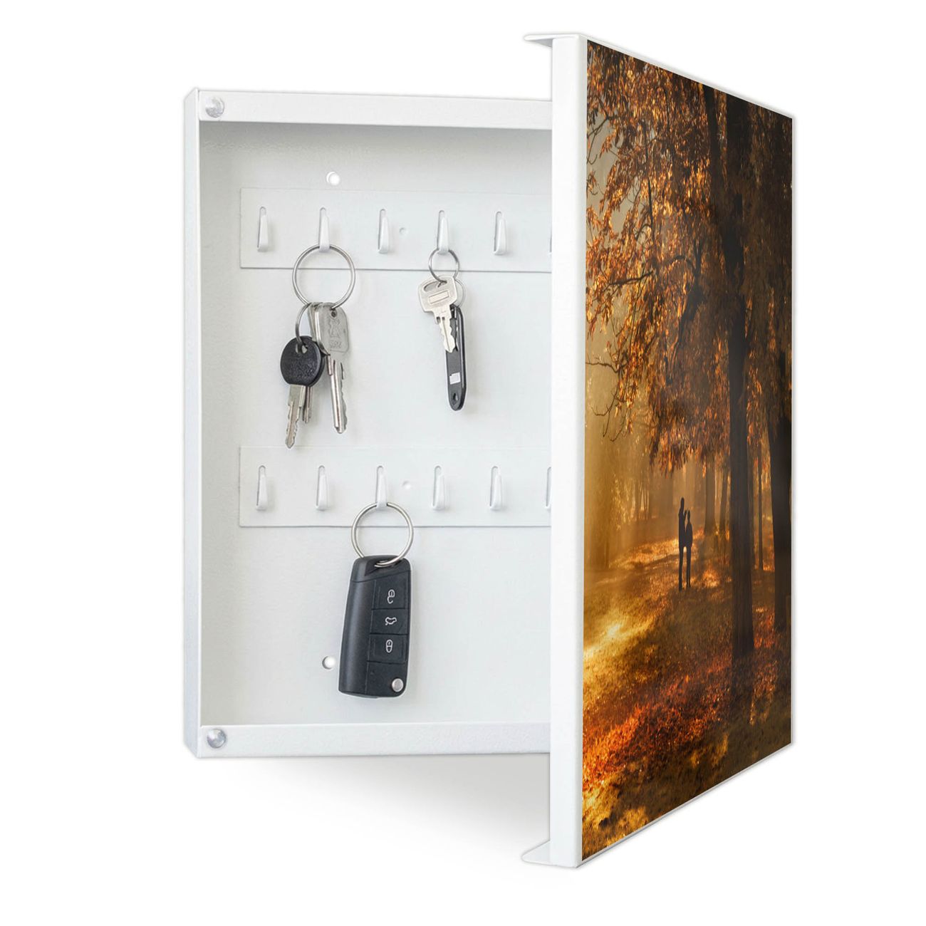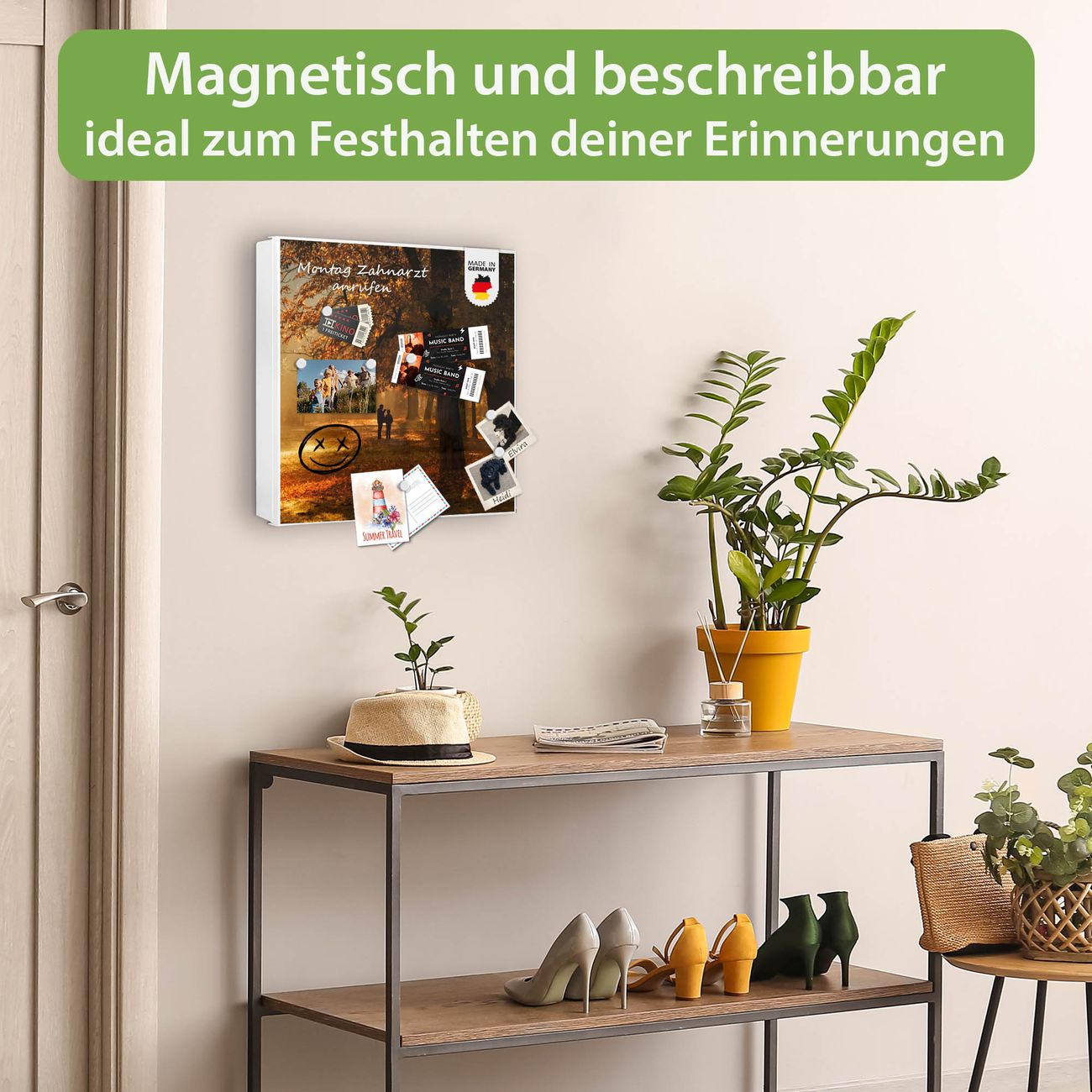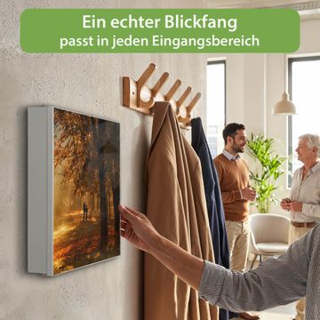 Bringe Ordnung und Eleganz in deinen Eingangsbereich mit dem banjado Schlüsselkasten Motiv Motiv Goldener Herbst. Die moderne Schlüsselbox kombiniert funktionales Design mit hochwertiger Verarbeitung und wird so zu einem echten Hingucker in Flur, Büro oder Ferienwohnung. ✅ Stilvolle Schlüsselaufbewahrung mit Motiv Motiv Goldener Herbst Der Design-Schlüsselkasten Motiv Motiv Goldener Herbst bietet Platz für bis zu 32 Schlüssel, die auf 4 stabilen Reihen mit je 8 Haken übersichtlich verstaut werden. Mit seinen kompakten Maßen von 30 x 30 x 5 cm passt die Schlüsselbox perfekt auch in kleinere Räume. Der weiß lackierte Stahlkorpus mit rechts angeschlagenem Türscharnier harmoniert mit gedruckten Folie auf der Front und fügt sich nahtlos in jedes Wohnambiente ein. Ob als Schlüsselorganizer für Zuhause oder als praktische Lösung für Büros, Praxen und Gewerbe, der banjado Schlüsselkasten sorgt für Ordnung und Übersicht. Dank der magnetischen, mit Kreidestiften beschreibbaren Folie auf der Front kannst du Notizen anheften oder Termine direkt auf der Oberfläche festhalten. Die Schlüsselbox Motiv Motiv Goldener Herbst zur Wandmontage wird inklusive Befestigungsmaterial geliefert und ist schnell angebracht. So hast du deine Schlüssel jederzeit griffbereit und zugleich stilvoll verstaut. Mit diesem banjado Schlüsselkasten Motiv Motiv Goldener Herbst kombinierst du praktische Aufbewahrung mit stilvollem Wohndesign. Ob privat oder geschäftlich, die Schlüsselbox sorgt für mehr Ordnung, Übersicht und ein wohnliches Ambiente.Vorteile im Überblick