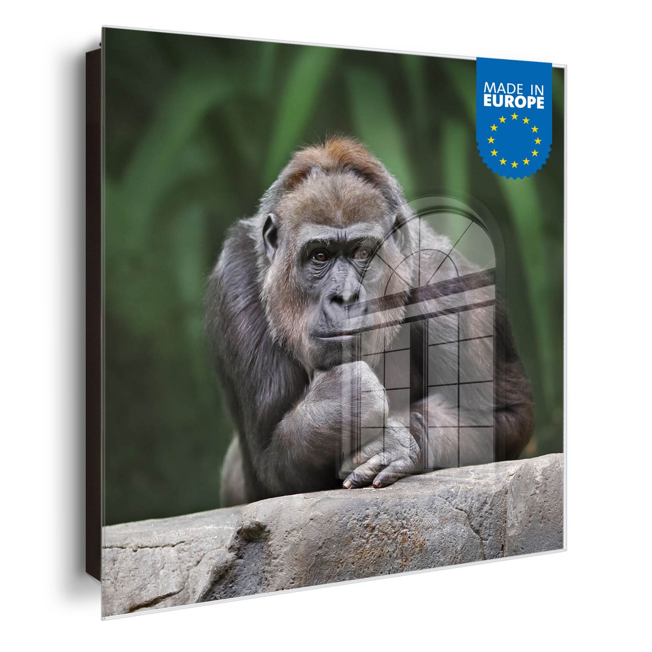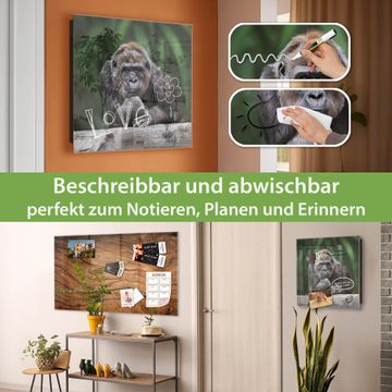 Bringe Ordnung und Eleganz in deinen Eingangsbereich mit dem banjado Schlüsselkasten Motiv Motiv Gorilla. Die moderne Schlüsselbox kombiniert funktionales Design mit hochwertiger Verarbeitung und wird so zu einem echten Hingucker in Flur, Büro oder Ferienwohnung. ✅ Stilvolle Schlüsselaufbewahrung mit Glasfront im Motiv Motiv Gorilla Der Design-Schlüsselkasten Motiv Motiv Gorilla bietet Platz für bis zu 50 Schlüssel, die auf 5 stabilen Reihen mit je 10 Haken übersichtlich verstaut werden. Mit seinen kompakten Maßen von 30 x 30 x 5 cm passt die Schlüsselbox perfekt auch in kleinere Räume. Der schwarz lackierte Stahlkorpus mit rechts angeschlagenem Türscharnier harmoniert mit der Glasfront und fügt sich nahtlos in jedes Wohnambiente ein. Ob als Schlüsselorganizer für Zuhause oder als praktische Lösung für Büros, Praxen und Gewerbe, der banjado Schlüsselkasten sorgt für Ordnung und Übersicht. Dank der magnetischen, mit Kreidestiften beschreibbaren Glasfront kannst du Notizen anheften oder Termine direkt auf der Oberfläche festhalten. Die Schlüsselbox Motiv Motiv Gorilla zur Wandmontage wird inklusive Befestigungsmaterial geliefert und ist schnell angebracht. So hast du deine Schlüssel jederzeit griffbereit und zugleich stilvoll verstaut. Mit diesem banjado Schlüsselkasten Motiv Motiv Gorilla kombinierst du praktische Aufbewahrung mit stilvollem Wohndesign. Ob privat oder geschäftlich, die Schlüsselbox sorgt für mehr Ordnung, Übersicht und ein wohnliches Ambiente.Vorteile im Überblick
