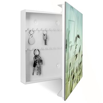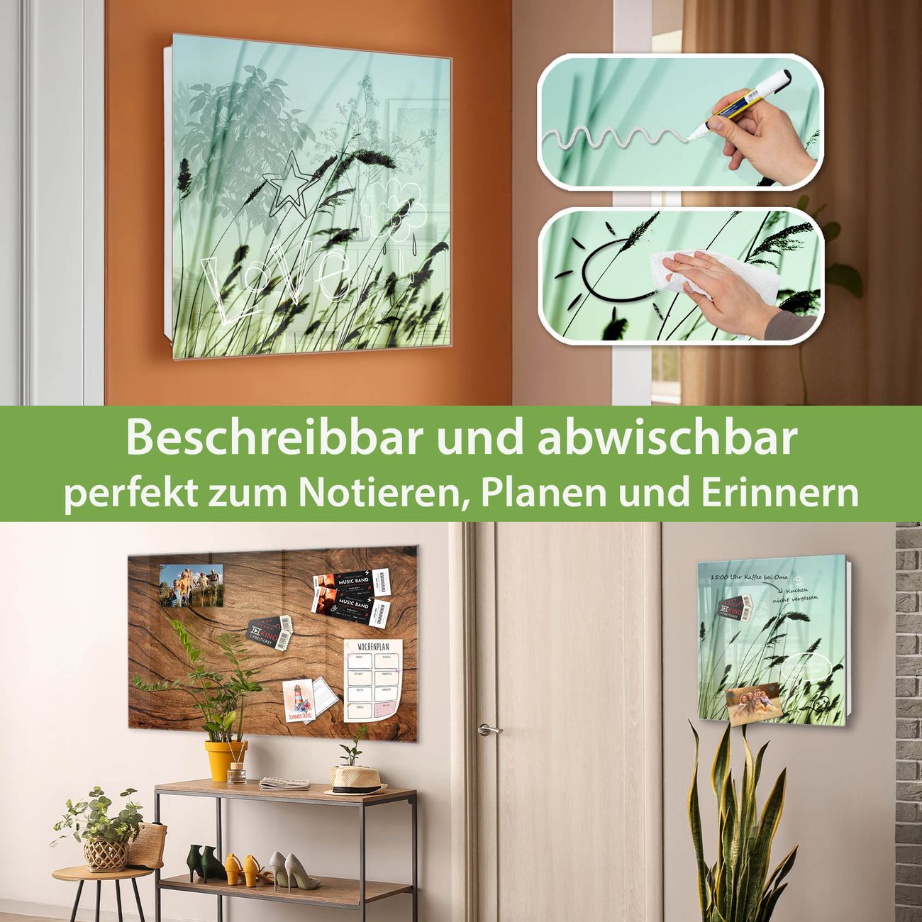 Bringe Ordnung und Eleganz in deinen Eingangsbereich mit dem banjado Schlüsselkasten Motiv Motiv Gräser. Die moderne Schlüsselbox kombiniert funktionales Design mit hochwertiger Verarbeitung und wird so zu einem echten Hingucker in Flur, Büro oder Ferienwohnung. ✅ Stilvolle Schlüsselaufbewahrung mit Glasfront im Motiv Motiv Gräser Der Design-Schlüsselkasten Motiv Motiv Gräser bietet Platz für bis zu 50 Schlüssel, die auf 5 stabilen Reihen mit je 10 Haken übersichtlich verstaut werden. Mit seinen kompakten Maßen von 30 x 30 x 5 cm passt die Schlüsselbox perfekt auch in kleinere Räume. Der weiß lackierte Stahlkorpus mit rechts angeschlagenem Türscharnier harmoniert mit der Glasfront und fügt sich nahtlos in jedes Wohnambiente ein. Ob als Schlüsselorganizer für Zuhause oder als praktische Lösung für Büros, Praxen und Gewerbe, der banjado Schlüsselkasten sorgt für Ordnung und Übersicht. Dank der magnetischen, mit Kreidestiften beschreibbaren Glasfront kannst du Notizen anheften oder Termine direkt auf der Oberfläche festhalten. Die Schlüsselbox Motiv Motiv Gräser zur Wandmontage wird inklusive Befestigungsmaterial geliefert und ist schnell angebracht. So hast du deine Schlüssel jederzeit griffbereit und zugleich stilvoll verstaut. Mit diesem banjado Schlüsselkasten Motiv Motiv Gräser kombinierst du praktische Aufbewahrung mit stilvollem Wohndesign. Ob privat oder geschäftlich, die Schlüsselbox sorgt für mehr Ordnung, Übersicht und ein wohnliches Ambiente.Vorteile im Überblick