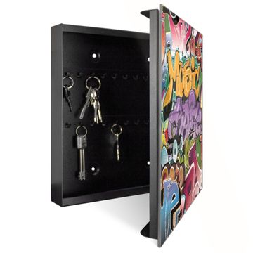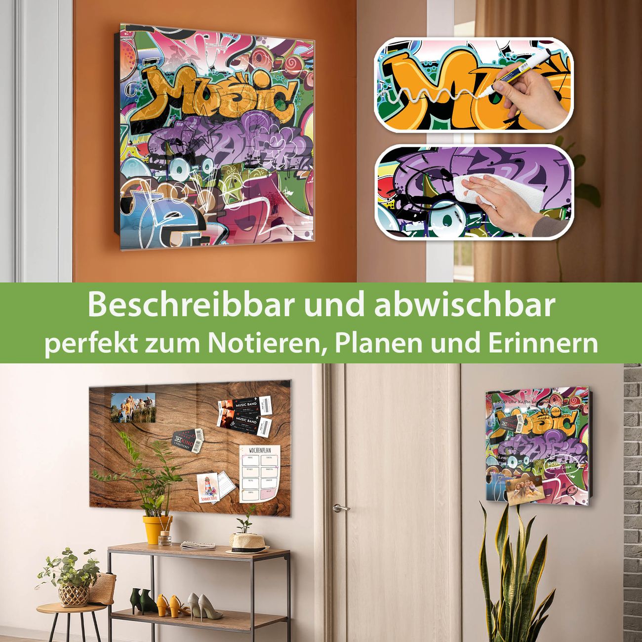 Bringe Ordnung und Eleganz in deinen Eingangsbereich mit dem banjado Schlüsselkasten Motiv Motiv Graffiti. Die moderne Schlüsselbox kombiniert funktionales Design mit hochwertiger Verarbeitung und wird so zu einem echten Hingucker in Flur, Büro oder Ferienwohnung. ✅ Stilvolle Schlüsselaufbewahrung mit Glasfront im Motiv Motiv Graffiti Der Design-Schlüsselkasten Motiv Motiv Graffiti bietet Platz für bis zu 50 Schlüssel, die auf 5 stabilen Reihen mit je 10 Haken übersichtlich verstaut werden. Mit seinen kompakten Maßen von 30 x 30 x 5 cm passt die Schlüsselbox perfekt auch in kleinere Räume. Der schwarz lackierte Stahlkorpus mit rechts angeschlagenem Türscharnier harmoniert mit der Glasfront und fügt sich nahtlos in jedes Wohnambiente ein. Ob als Schlüsselorganizer für Zuhause oder als praktische Lösung für Büros, Praxen und Gewerbe, der banjado Schlüsselkasten sorgt für Ordnung und Übersicht. Dank der magnetischen, mit Kreidestiften beschreibbaren Glasfront kannst du Notizen anheften oder Termine direkt auf der Oberfläche festhalten. Die Schlüsselbox Motiv Motiv Graffiti zur Wandmontage wird inklusive Befestigungsmaterial geliefert und ist schnell angebracht. So hast du deine Schlüssel jederzeit griffbereit und zugleich stilvoll verstaut. Mit diesem banjado Schlüsselkasten Motiv Motiv Graffiti kombinierst du praktische Aufbewahrung mit stilvollem Wohndesign. Ob privat oder geschäftlich, die Schlüsselbox sorgt für mehr Ordnung, Übersicht und ein wohnliches Ambiente.Vorteile im Überblick