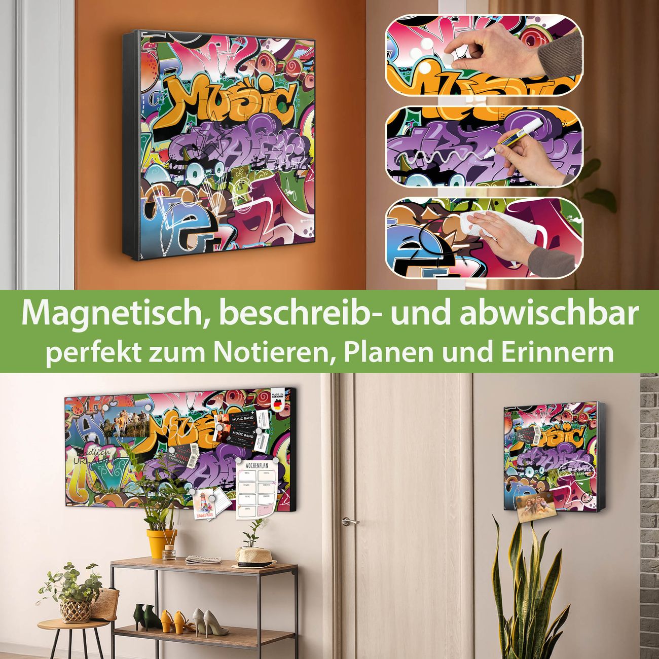 Bringe Ordnung und Eleganz in deinen Eingangsbereich mit dem banjado Schlüsselkasten Motiv Motiv Graffiti. Die moderne Schlüsselbox kombiniert funktionales Design mit hochwertiger Verarbeitung und wird so zu einem echten Hingucker in Flur, Büro oder Ferienwohnung. ✅ Stilvolle Schlüsselaufbewahrung mit Motiv Motiv Graffiti Der Design-Schlüsselkasten Motiv Motiv Graffiti bietet Platz für bis zu 32 Schlüssel, die auf 4 stabilen Reihen mit je 8 Haken übersichtlich verstaut werden. Mit seinen kompakten Maßen von 30 x 30 x 5 cm passt die Schlüsselbox perfekt auch in kleinere Räume. Der schwarz lackierte Stahlkorpus mit rechts angeschlagenem Türscharnier harmoniert mit gedruckten Folie auf der Front und fügt sich nahtlos in jedes Wohnambiente ein. Ob als Schlüsselorganizer für Zuhause oder als praktische Lösung für Büros, Praxen und Gewerbe, der banjado Schlüsselkasten sorgt für Ordnung und Übersicht. Dank der magnetischen, mit Kreidestiften beschreibbaren Folie auf der Front kannst du Notizen anheften oder Termine direkt auf der Oberfläche festhalten. Die Schlüsselbox Motiv Motiv Graffiti zur Wandmontage wird inklusive Befestigungsmaterial geliefert und ist schnell angebracht. So hast du deine Schlüssel jederzeit griffbereit und zugleich stilvoll verstaut. Mit diesem banjado Schlüsselkasten Motiv Motiv Graffiti kombinierst du praktische Aufbewahrung mit stilvollem Wohndesign. Ob privat oder geschäftlich, die Schlüsselbox sorgt für mehr Ordnung, Übersicht und ein wohnliches Ambiente.Vorteile im Überblick