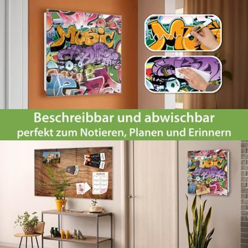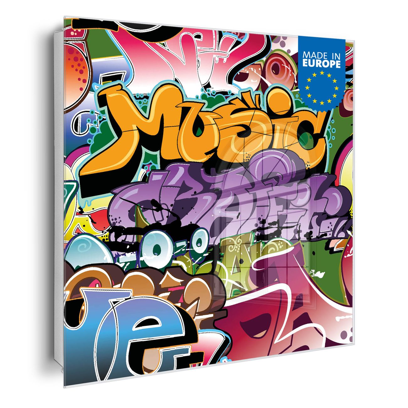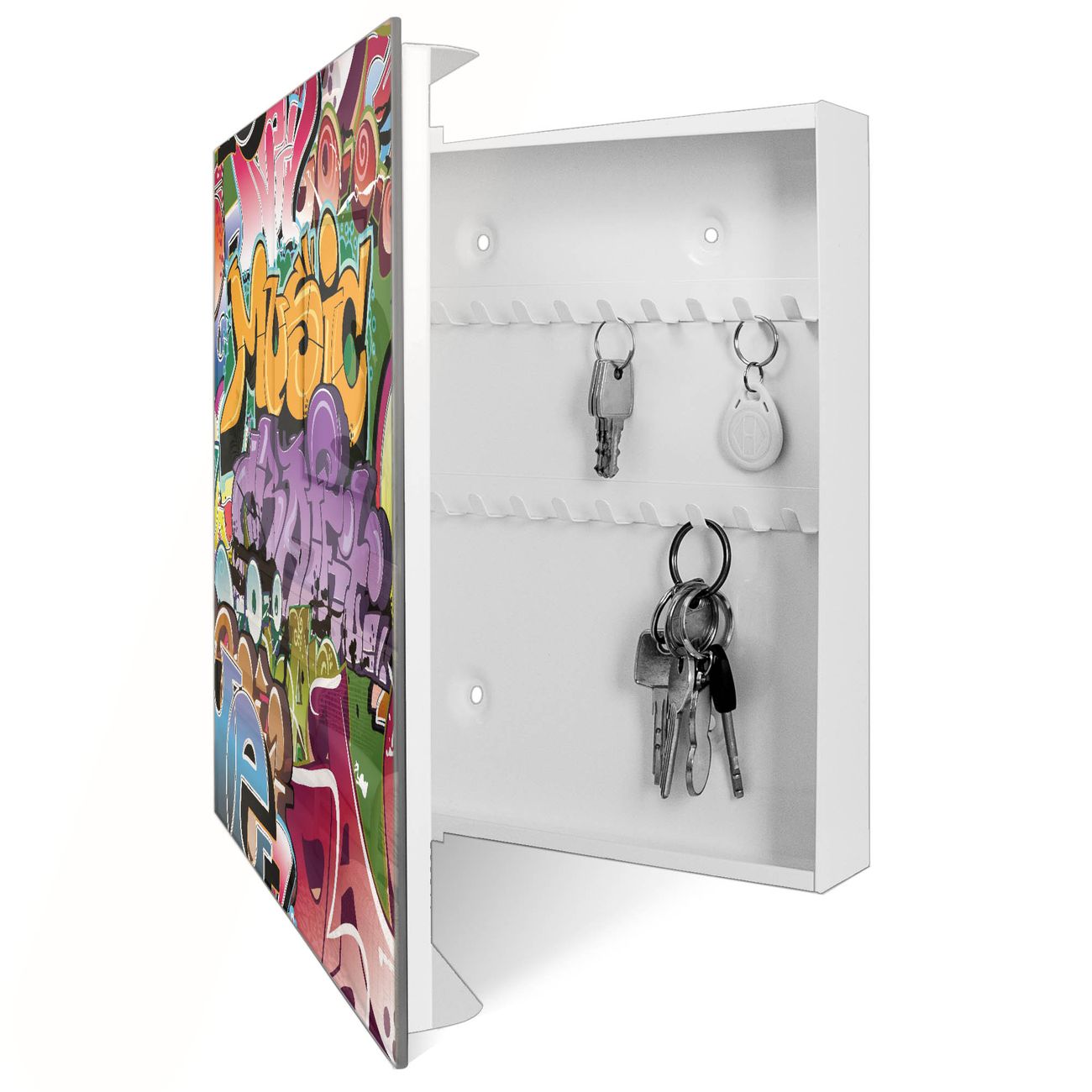Bringe Ordnung und Eleganz in deinen Eingangsbereich mit dem banjado Schlüsselkasten Motiv Motiv Graffiti. Die moderne Schlüsselbox kombiniert funktionales Design mit hochwertiger Verarbeitung und wird so zu einem echten Hingucker in Flur, Büro oder Ferienwohnung. ✅ Stilvolle Schlüsselaufbewahrung mit Glasfront im Motiv Motiv Graffiti Der Design-Schlüsselkasten Motiv Motiv Graffiti bietet Platz für bis zu 50 Schlüssel, die auf 5 stabilen Reihen mit je 10 Haken übersichtlich verstaut werden. Mit seinen kompakten Maßen von 30 x 30 x 5 cm passt die Schlüsselbox perfekt auch in kleinere Räume. Der weiß lackierte Stahlkorpus mit rechts angeschlagenem Türscharnier harmoniert mit der Glasfront und fügt sich nahtlos in jedes Wohnambiente ein. Ob als Schlüsselorganizer für Zuhause oder als praktische Lösung für Büros, Praxen und Gewerbe, der banjado Schlüsselkasten sorgt für Ordnung und Übersicht. Dank der magnetischen, mit Kreidestiften beschreibbaren Glasfront kannst du Notizen anheften oder Termine direkt auf der Oberfläche festhalten. Die Schlüsselbox Motiv Motiv Graffiti zur Wandmontage wird inklusive Befestigungsmaterial geliefert und ist schnell angebracht. So hast du deine Schlüssel jederzeit griffbereit und zugleich stilvoll verstaut. Mit diesem banjado Schlüsselkasten Motiv Motiv Graffiti kombinierst du praktische Aufbewahrung mit stilvollem Wohndesign. Ob privat oder geschäftlich, die Schlüsselbox sorgt für mehr Ordnung, Übersicht und ein wohnliches Ambiente.Vorteile im Überblick