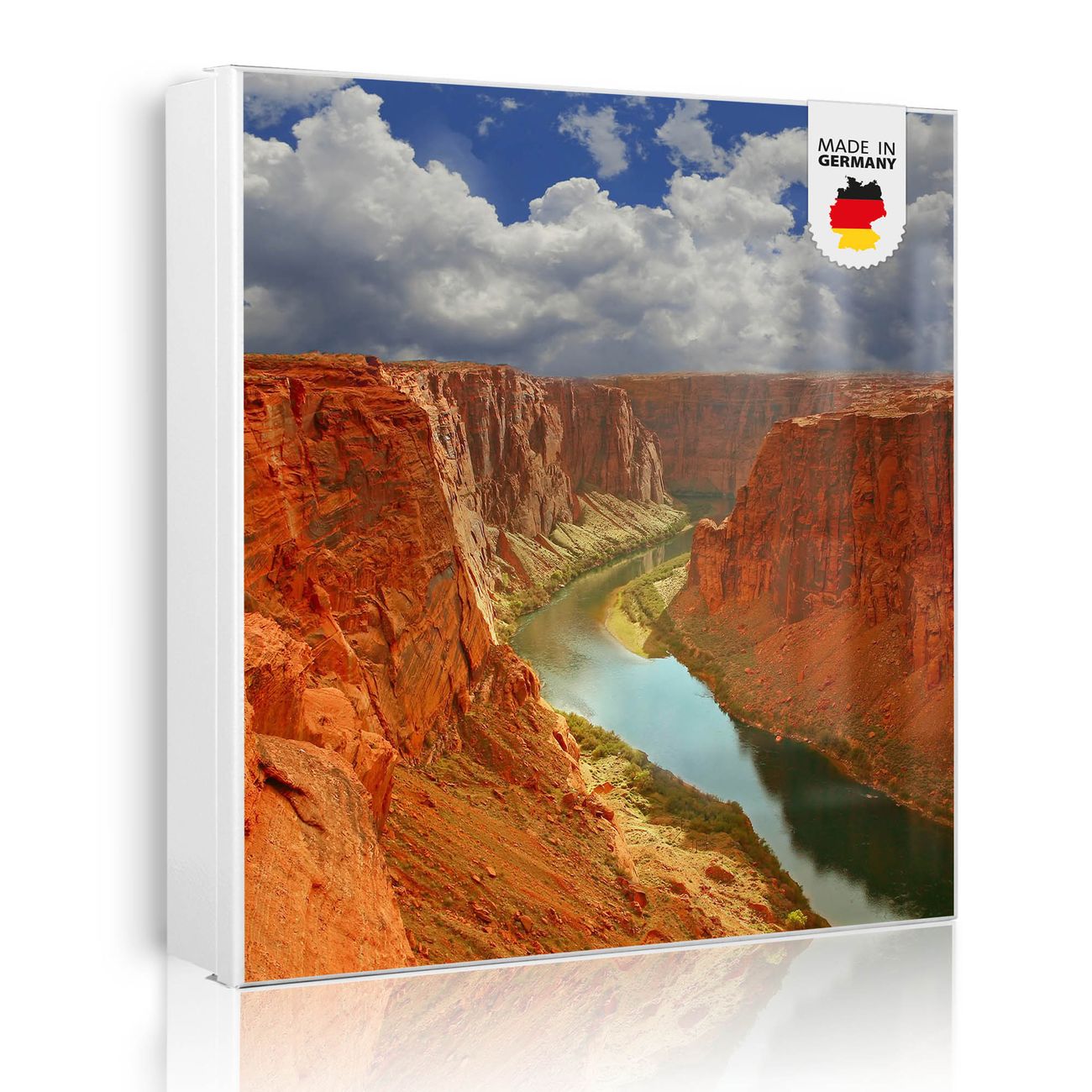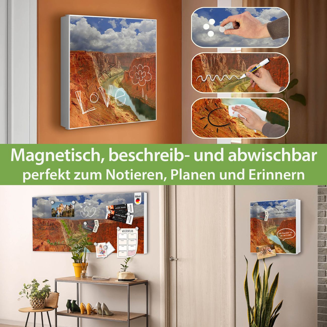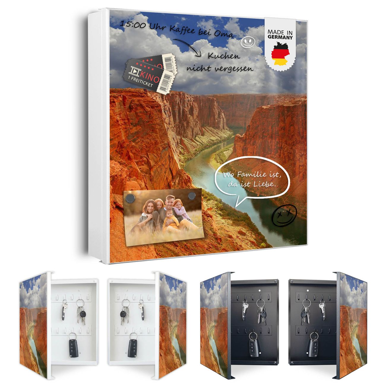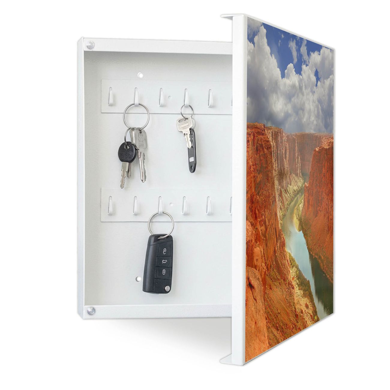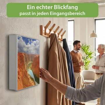 Bringe Ordnung und Eleganz in deinen Eingangsbereich mit dem banjado Schlüsselkasten Motiv Motiv Grand Canyon. Die moderne Schlüsselbox kombiniert funktionales Design mit hochwertiger Verarbeitung und wird so zu einem echten Hingucker in Flur, Büro oder Ferienwohnung. ✅ Stilvolle Schlüsselaufbewahrung mit Motiv Motiv Grand Canyon Der Design-Schlüsselkasten Motiv Motiv Grand Canyon bietet Platz für bis zu 32 Schlüssel, die auf 4 stabilen Reihen mit je 8 Haken übersichtlich verstaut werden. Mit seinen kompakten Maßen von 30 x 30 x 5 cm passt die Schlüsselbox perfekt auch in kleinere Räume. Der weiß lackierte Stahlkorpus mit rechts angeschlagenem Türscharnier harmoniert mit gedruckten Folie auf der Front und fügt sich nahtlos in jedes Wohnambiente ein. Ob als Schlüsselorganizer für Zuhause oder als praktische Lösung für Büros, Praxen und Gewerbe, der banjado Schlüsselkasten sorgt für Ordnung und Übersicht. Dank der magnetischen, mit Kreidestiften beschreibbaren Folie auf der Front kannst du Notizen anheften oder Termine direkt auf der Oberfläche festhalten. Die Schlüsselbox Motiv Motiv Grand Canyon zur Wandmontage wird inklusive Befestigungsmaterial geliefert und ist schnell angebracht. So hast du deine Schlüssel jederzeit griffbereit und zugleich stilvoll verstaut. Mit diesem banjado Schlüsselkasten Motiv Motiv Grand Canyon kombinierst du praktische Aufbewahrung mit stilvollem Wohndesign. Ob privat oder geschäftlich, die Schlüsselbox sorgt für mehr Ordnung, Übersicht und ein wohnliches Ambiente.Vorteile im Überblick