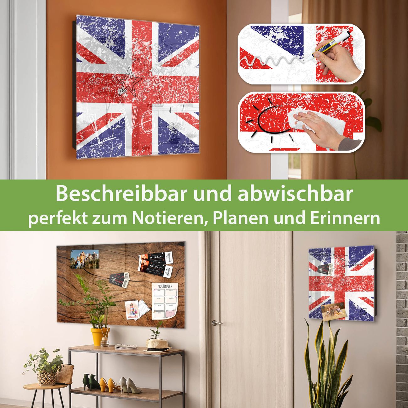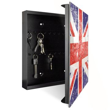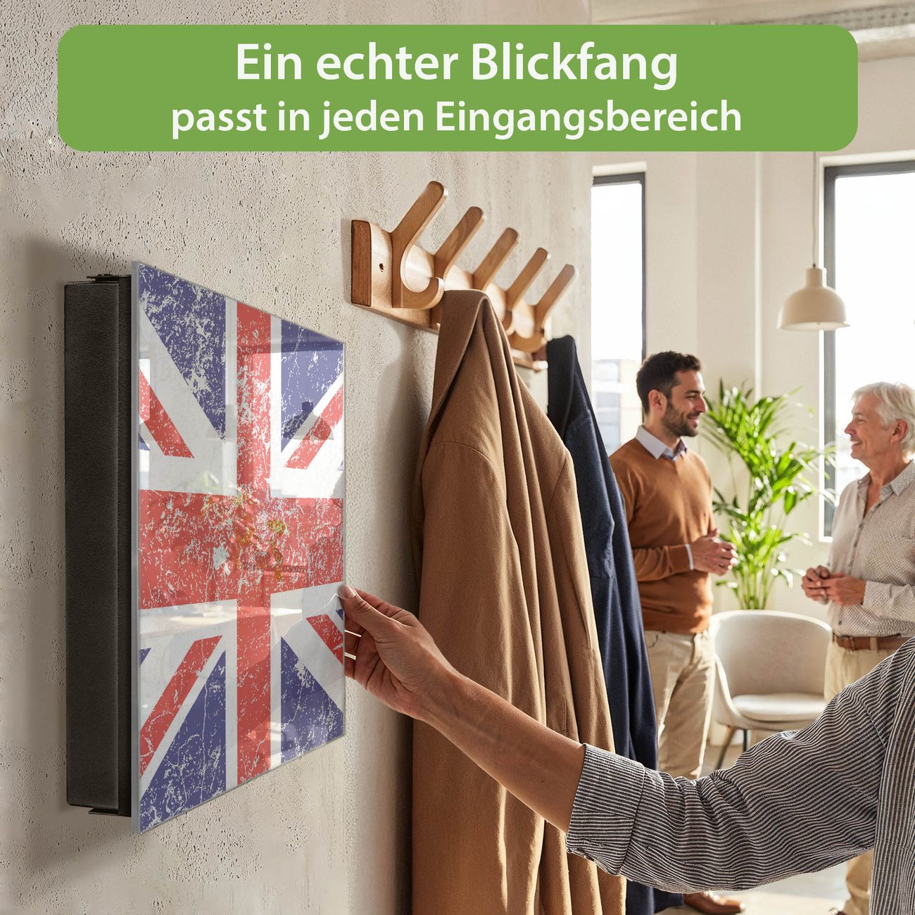 Bringe Ordnung und Eleganz in deinen Eingangsbereich mit dem banjado Schlüsselkasten Motiv Motiv Great Britain. Die moderne Schlüsselbox kombiniert funktionales Design mit hochwertiger Verarbeitung und wird so zu einem echten Hingucker in Flur, Büro oder Ferienwohnung. ✅ Stilvolle Schlüsselaufbewahrung mit Glasfront im Motiv Motiv Great Britain Der Design-Schlüsselkasten Motiv Motiv Great Britain bietet Platz für bis zu 50 Schlüssel, die auf 5 stabilen Reihen mit je 10 Haken übersichtlich verstaut werden. Mit seinen kompakten Maßen von 30 x 30 x 5 cm passt die Schlüsselbox perfekt auch in kleinere Räume. Der schwarz lackierte Stahlkorpus mit rechts angeschlagenem Türscharnier harmoniert mit der Glasfront und fügt sich nahtlos in jedes Wohnambiente ein. Ob als Schlüsselorganizer für Zuhause oder als praktische Lösung für Büros, Praxen und Gewerbe, der banjado Schlüsselkasten sorgt für Ordnung und Übersicht. Dank der magnetischen, mit Kreidestiften beschreibbaren Glasfront kannst du Notizen anheften oder Termine direkt auf der Oberfläche festhalten. Die Schlüsselbox Motiv Motiv Great Britain zur Wandmontage wird inklusive Befestigungsmaterial geliefert und ist schnell angebracht. So hast du deine Schlüssel jederzeit griffbereit und zugleich stilvoll verstaut. Mit diesem banjado Schlüsselkasten Motiv Motiv Great Britain kombinierst du praktische Aufbewahrung mit stilvollem Wohndesign. Ob privat oder geschäftlich, die Schlüsselbox sorgt für mehr Ordnung, Übersicht und ein wohnliches Ambiente.Vorteile im Überblick