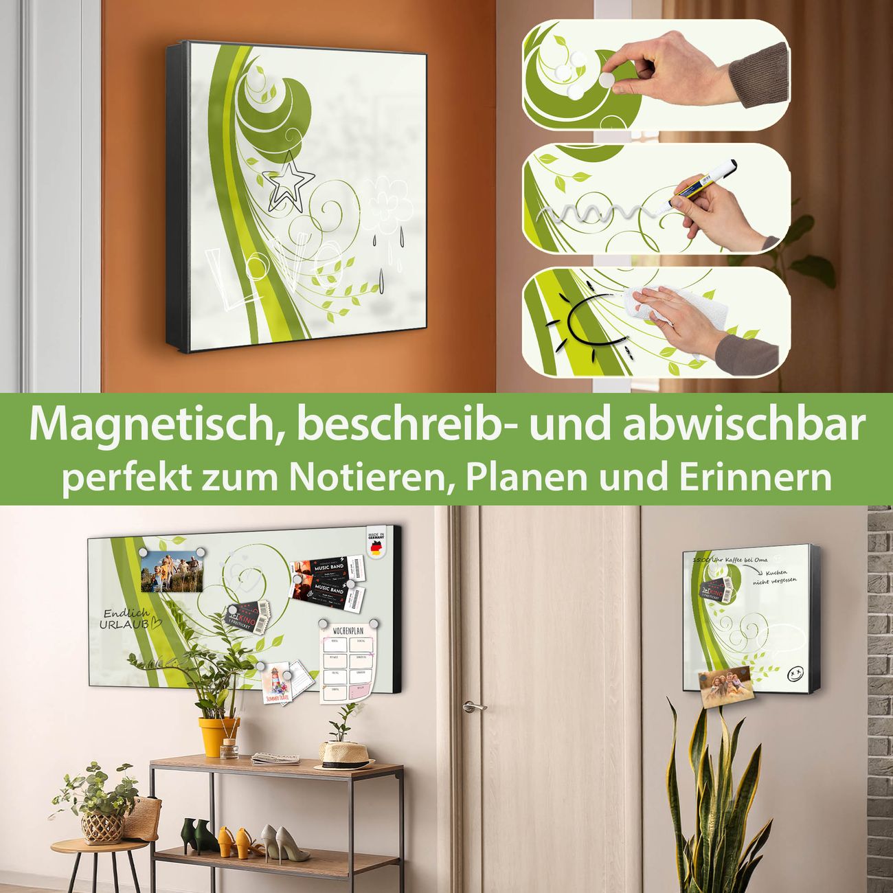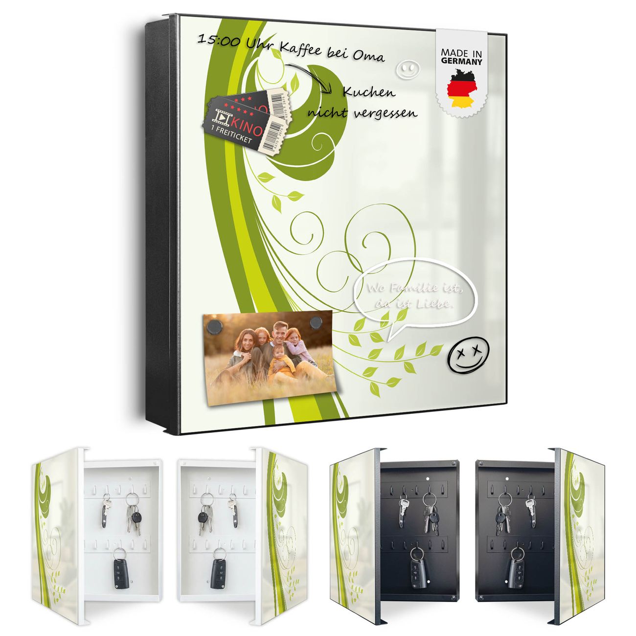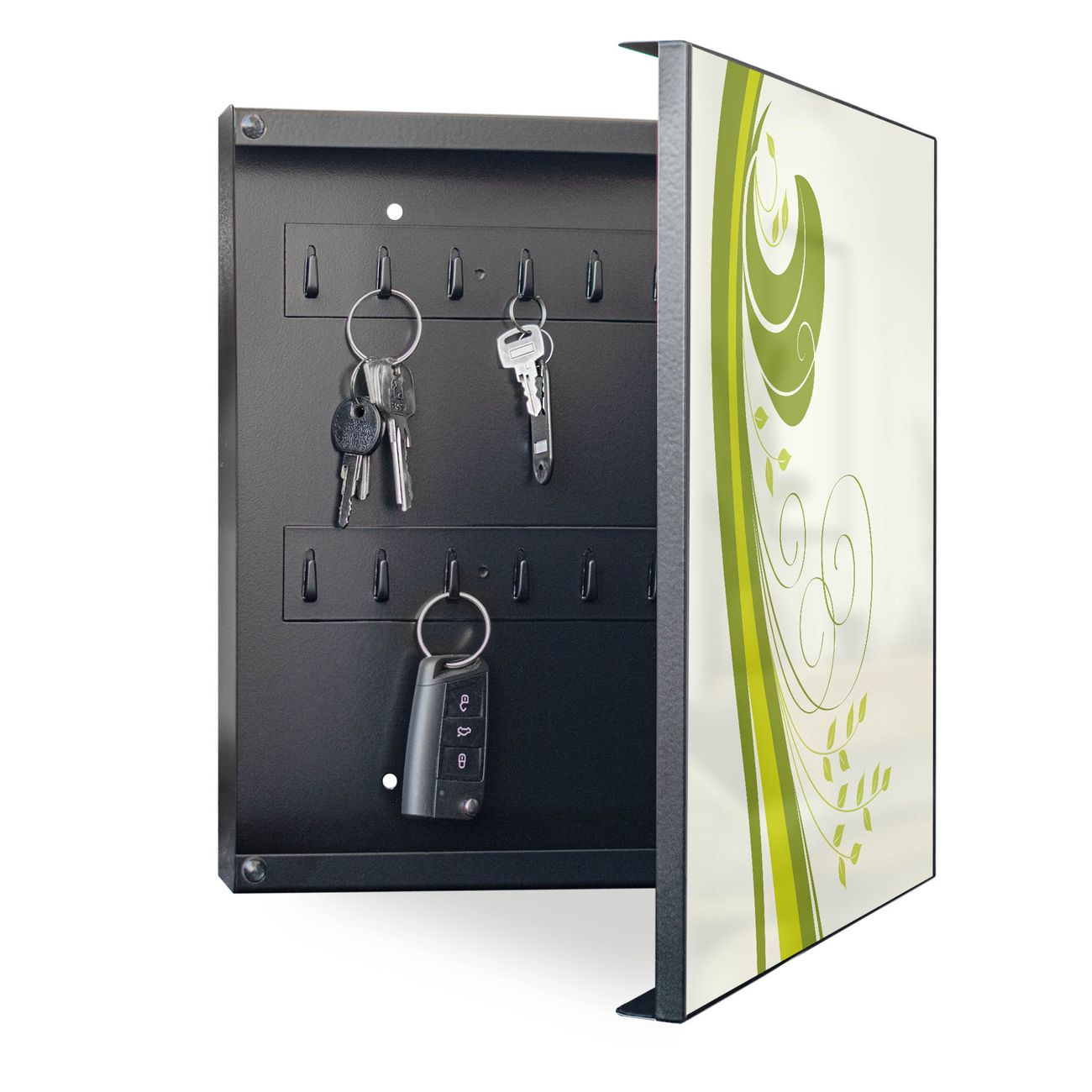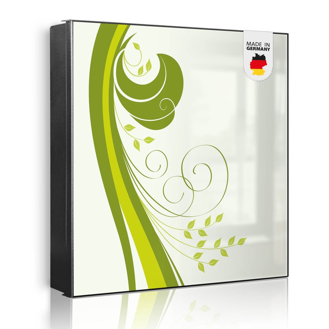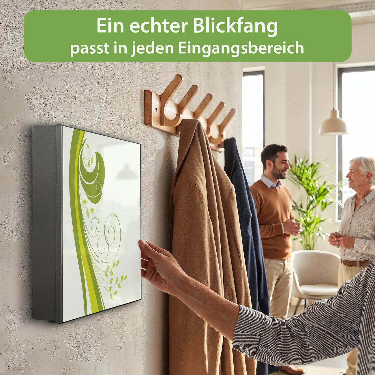 Bringe Ordnung und Eleganz in deinen Eingangsbereich mit dem banjado Schlüsselkasten Motiv Motiv Green Swirl. Die moderne Schlüsselbox kombiniert funktionales Design mit hochwertiger Verarbeitung und wird so zu einem echten Hingucker in Flur, Büro oder Ferienwohnung. ✅ Stilvolle Schlüsselaufbewahrung mit Motiv Motiv Green Swirl Der Design-Schlüsselkasten Motiv Motiv Green Swirl bietet Platz für bis zu 32 Schlüssel, die auf 4 stabilen Reihen mit je 8 Haken übersichtlich verstaut werden. Mit seinen kompakten Maßen von 30 x 30 x 5 cm passt die Schlüsselbox perfekt auch in kleinere Räume. Der schwarz lackierte Stahlkorpus mit rechts angeschlagenem Türscharnier harmoniert mit gedruckten Folie auf der Front und fügt sich nahtlos in jedes Wohnambiente ein. Ob als Schlüsselorganizer für Zuhause oder als praktische Lösung für Büros, Praxen und Gewerbe, der banjado Schlüsselkasten sorgt für Ordnung und Übersicht. Dank der magnetischen, mit Kreidestiften beschreibbaren Folie auf der Front kannst du Notizen anheften oder Termine direkt auf der Oberfläche festhalten. Die Schlüsselbox Motiv Motiv Green Swirl zur Wandmontage wird inklusive Befestigungsmaterial geliefert und ist schnell angebracht. So hast du deine Schlüssel jederzeit griffbereit und zugleich stilvoll verstaut. Mit diesem banjado Schlüsselkasten Motiv Motiv Green Swirl kombinierst du praktische Aufbewahrung mit stilvollem Wohndesign. Ob privat oder geschäftlich, die Schlüsselbox sorgt für mehr Ordnung, Übersicht und ein wohnliches Ambiente.Vorteile im Überblick