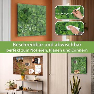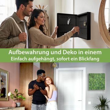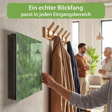Bringe Ordnung und Eleganz in deinen Eingangsbereich mit dem banjado Schlüsselkasten Motiv Motiv Grüne Blätter. Die moderne Schlüsselbox kombiniert funktionales Design mit hochwertiger Verarbeitung und wird so zu einem echten Hingucker in Flur, Büro oder Ferienwohnung. ✅ Stilvolle Schlüsselaufbewahrung mit Glasfront im Motiv Motiv Grüne Blätter Der Design-Schlüsselkasten Motiv Motiv Grüne Blätter bietet Platz für bis zu 50 Schlüssel, die auf 5 stabilen Reihen mit je 10 Haken übersichtlich verstaut werden. Mit seinen kompakten Maßen von 30 x 30 x 5 cm passt die Schlüsselbox perfekt auch in kleinere Räume. Der schwarz lackierte Stahlkorpus mit rechts angeschlagenem Türscharnier harmoniert mit der Glasfront und fügt sich nahtlos in jedes Wohnambiente ein. Ob als Schlüsselorganizer für Zuhause oder als praktische Lösung für Büros, Praxen und Gewerbe, der banjado Schlüsselkasten sorgt für Ordnung und Übersicht. Dank der magnetischen, mit Kreidestiften beschreibbaren Glasfront kannst du Notizen anheften oder Termine direkt auf der Oberfläche festhalten. Die Schlüsselbox Motiv Motiv Grüne Blätter zur Wandmontage wird inklusive Befestigungsmaterial geliefert und ist schnell angebracht. So hast du deine Schlüssel jederzeit griffbereit und zugleich stilvoll verstaut. Mit diesem banjado Schlüsselkasten Motiv Motiv Grüne Blätter kombinierst du praktische Aufbewahrung mit stilvollem Wohndesign. Ob privat oder geschäftlich, die Schlüsselbox sorgt für mehr Ordnung, Übersicht und ein wohnliches Ambiente.Vorteile im Überblick