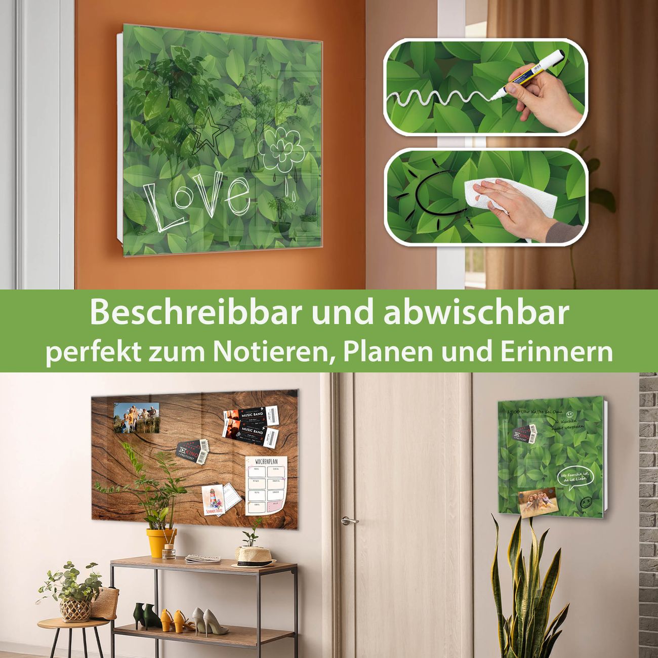 Bringe Ordnung und Eleganz in deinen Eingangsbereich mit dem banjado Schlüsselkasten Motiv Motiv Grüne Blätter. Die moderne Schlüsselbox kombiniert funktionales Design mit hochwertiger Verarbeitung und wird so zu einem echten Hingucker in Flur, Büro oder Ferienwohnung. ✅ Stilvolle Schlüsselaufbewahrung mit Glasfront im Motiv Motiv Grüne Blätter Der Design-Schlüsselkasten Motiv Motiv Grüne Blätter bietet Platz für bis zu 50 Schlüssel, die auf 5 stabilen Reihen mit je 10 Haken übersichtlich verstaut werden. Mit seinen kompakten Maßen von 30 x 30 x 5 cm passt die Schlüsselbox perfekt auch in kleinere Räume. Der weiß lackierte Stahlkorpus mit rechts angeschlagenem Türscharnier harmoniert mit der Glasfront und fügt sich nahtlos in jedes Wohnambiente ein. Ob als Schlüsselorganizer für Zuhause oder als praktische Lösung für Büros, Praxen und Gewerbe, der banjado Schlüsselkasten sorgt für Ordnung und Übersicht. Dank der magnetischen, mit Kreidestiften beschreibbaren Glasfront kannst du Notizen anheften oder Termine direkt auf der Oberfläche festhalten. Die Schlüsselbox Motiv Motiv Grüne Blätter zur Wandmontage wird inklusive Befestigungsmaterial geliefert und ist schnell angebracht. So hast du deine Schlüssel jederzeit griffbereit und zugleich stilvoll verstaut. Mit diesem banjado Schlüsselkasten Motiv Motiv Grüne Blätter kombinierst du praktische Aufbewahrung mit stilvollem Wohndesign. Ob privat oder geschäftlich, die Schlüsselbox sorgt für mehr Ordnung, Übersicht und ein wohnliches Ambiente.Vorteile im Überblick