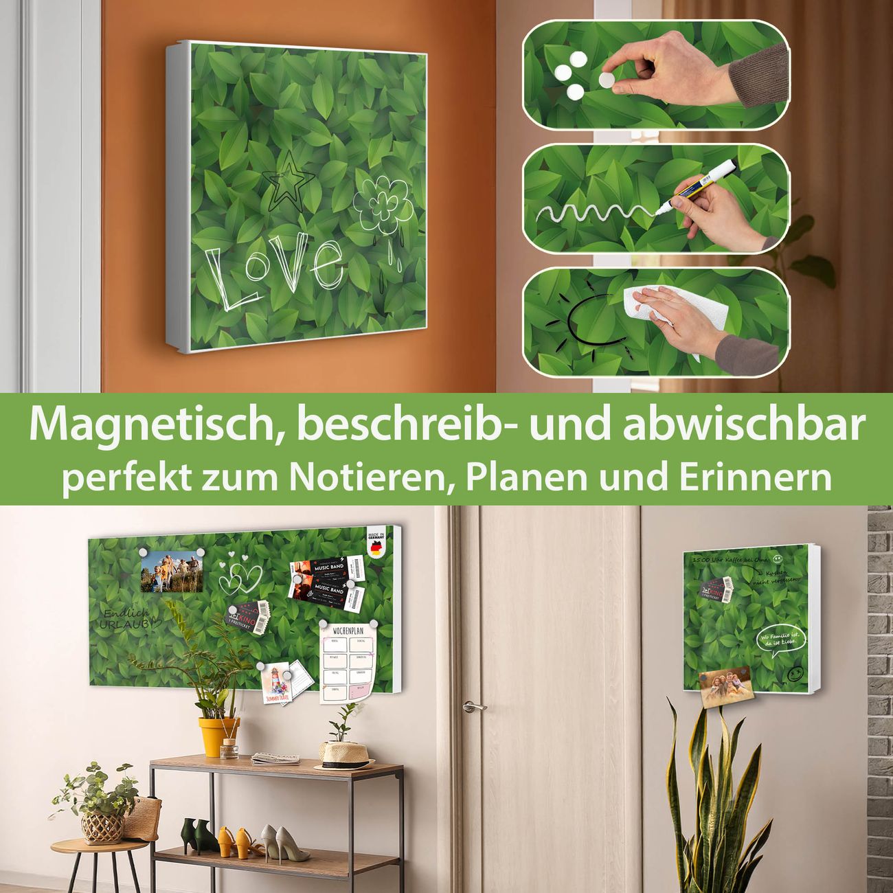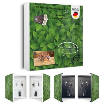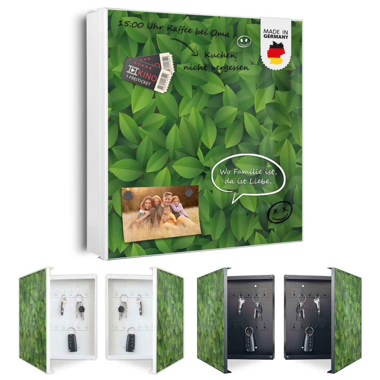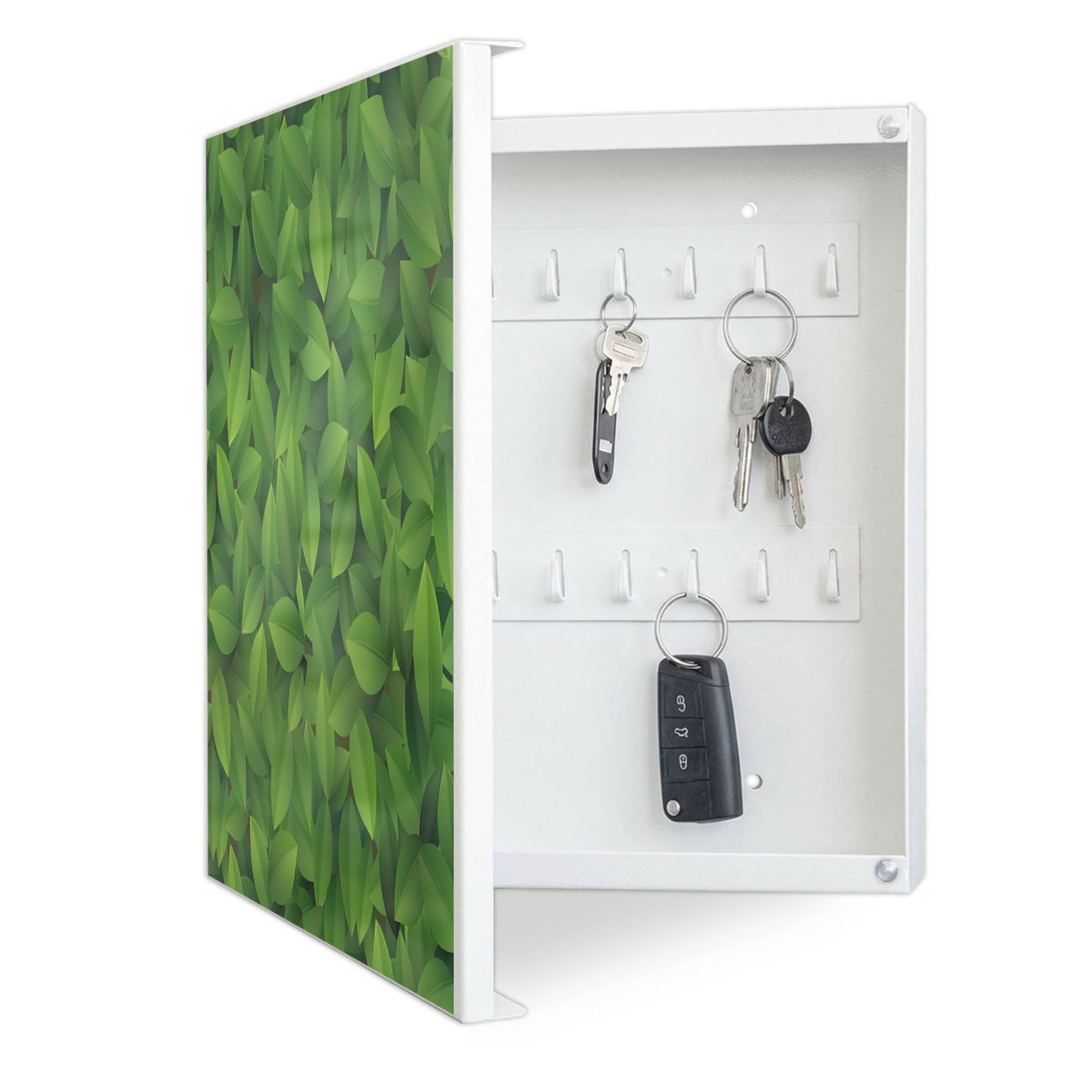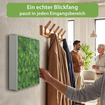 Bringe Ordnung und Eleganz in deinen Eingangsbereich mit dem banjado Schlüsselkasten Motiv Motiv Grüne Blätter. Die moderne Schlüsselbox kombiniert funktionales Design mit hochwertiger Verarbeitung und wird so zu einem echten Hingucker in Flur, Büro oder Ferienwohnung. ✅ Stilvolle Schlüsselaufbewahrung mit Motiv Motiv Grüne Blätter Der Design-Schlüsselkasten Motiv Motiv Grüne Blätter bietet Platz für bis zu 32 Schlüssel, die auf 4 stabilen Reihen mit je 8 Haken übersichtlich verstaut werden. Mit seinen kompakten Maßen von 30 x 30 x 5 cm passt die Schlüsselbox perfekt auch in kleinere Räume. Der weiß lackierte Stahlkorpus mit links angeschlagenem Türscharnier harmoniert mit gedruckten Folie auf der Front und fügt sich nahtlos in jedes Wohnambiente ein. Ob als Schlüsselorganizer für Zuhause oder als praktische Lösung für Büros, Praxen und Gewerbe, der banjado Schlüsselkasten sorgt für Ordnung und Übersicht. Dank der magnetischen, mit Kreidestiften beschreibbaren Folie auf der Front kannst du Notizen anheften oder Termine direkt auf der Oberfläche festhalten. Die Schlüsselbox Motiv Motiv Grüne Blätter zur Wandmontage wird inklusive Befestigungsmaterial geliefert und ist schnell angebracht. So hast du deine Schlüssel jederzeit griffbereit und zugleich stilvoll verstaut. Mit diesem banjado Schlüsselkasten Motiv Motiv Grüne Blätter kombinierst du praktische Aufbewahrung mit stilvollem Wohndesign. Ob privat oder geschäftlich, die Schlüsselbox sorgt für mehr Ordnung, Übersicht und ein wohnliches Ambiente.Vorteile im Überblick