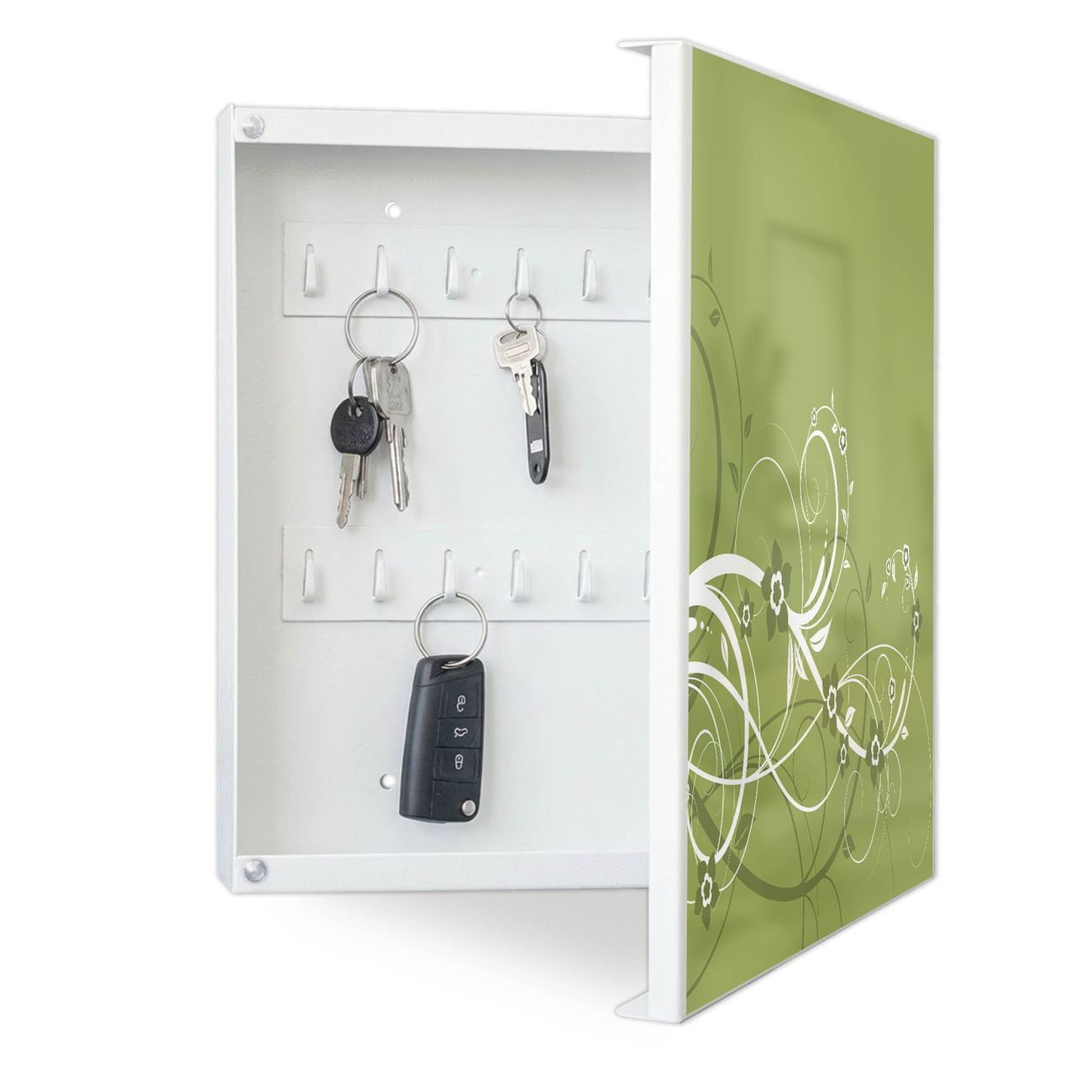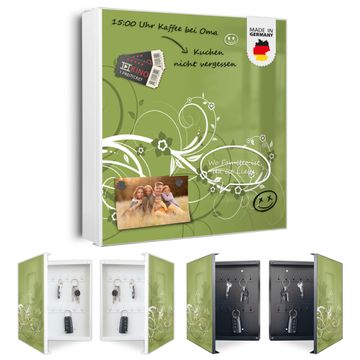 Bringe Ordnung und Eleganz in deinen Eingangsbereich mit dem banjado Schlüsselkasten Motiv Motiv Grüne Blüten. Die moderne Schlüsselbox kombiniert funktionales Design mit hochwertiger Verarbeitung und wird so zu einem echten Hingucker in Flur, Büro oder Ferienwohnung. ✅ Stilvolle Schlüsselaufbewahrung mit Motiv Motiv Grüne Blüten Der Design-Schlüsselkasten Motiv Motiv Grüne Blüten bietet Platz für bis zu 32 Schlüssel, die auf 4 stabilen Reihen mit je 8 Haken übersichtlich verstaut werden. Mit seinen kompakten Maßen von 30 x 30 x 5 cm passt die Schlüsselbox perfekt auch in kleinere Räume. Der weiß lackierte Stahlkorpus mit rechts angeschlagenem Türscharnier harmoniert mit gedruckten Folie auf der Front und fügt sich nahtlos in jedes Wohnambiente ein. Ob als Schlüsselorganizer für Zuhause oder als praktische Lösung für Büros, Praxen und Gewerbe, der banjado Schlüsselkasten sorgt für Ordnung und Übersicht. Dank der magnetischen, mit Kreidestiften beschreibbaren Folie auf der Front kannst du Notizen anheften oder Termine direkt auf der Oberfläche festhalten. Die Schlüsselbox Motiv Motiv Grüne Blüten zur Wandmontage wird inklusive Befestigungsmaterial geliefert und ist schnell angebracht. So hast du deine Schlüssel jederzeit griffbereit und zugleich stilvoll verstaut. Mit diesem banjado Schlüsselkasten Motiv Motiv Grüne Blüten kombinierst du praktische Aufbewahrung mit stilvollem Wohndesign. Ob privat oder geschäftlich, die Schlüsselbox sorgt für mehr Ordnung, Übersicht und ein wohnliches Ambiente.Vorteile im Überblick