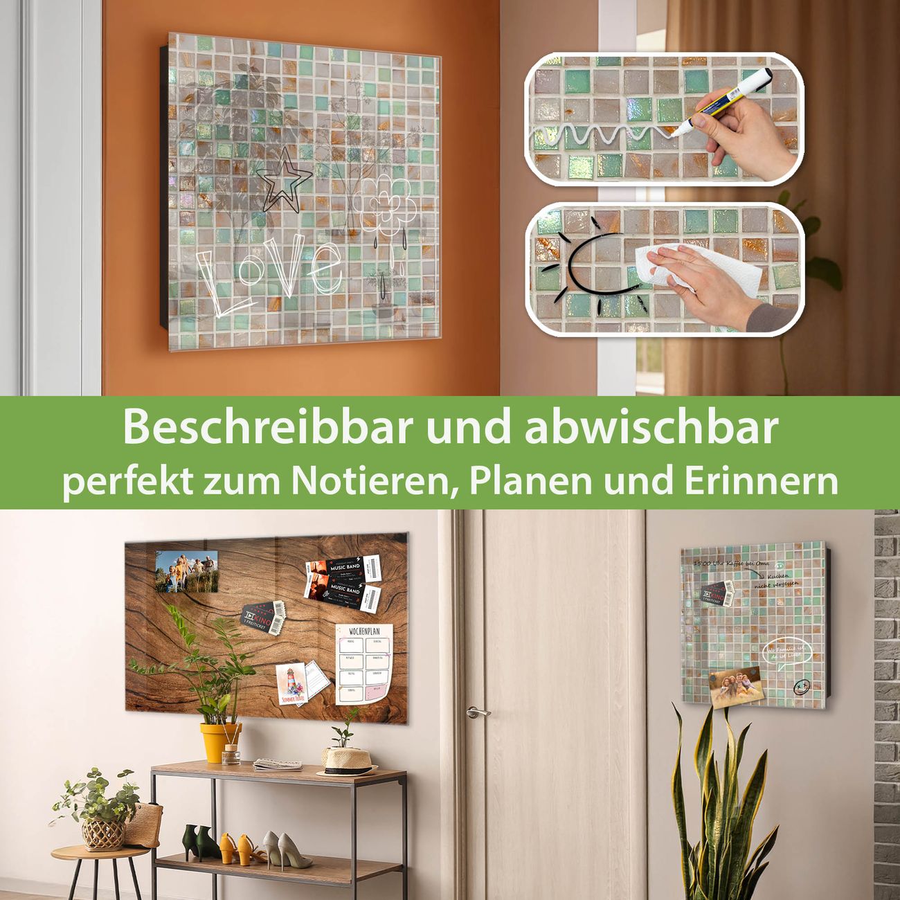 Bringe Ordnung und Eleganz in deinen Eingangsbereich mit dem banjado Schlüsselkasten Motiv Motiv Grüne Fliesen. Die moderne Schlüsselbox kombiniert funktionales Design mit hochwertiger Verarbeitung und wird so zu einem echten Hingucker in Flur, Büro oder Ferienwohnung. ✅ Stilvolle Schlüsselaufbewahrung mit Glasfront im Motiv Motiv Grüne Fliesen Der Design-Schlüsselkasten Motiv Motiv Grüne Fliesen bietet Platz für bis zu 50 Schlüssel, die auf 5 stabilen Reihen mit je 10 Haken übersichtlich verstaut werden. Mit seinen kompakten Maßen von 30 x 30 x 5 cm passt die Schlüsselbox perfekt auch in kleinere Räume. Der schwarz lackierte Stahlkorpus mit rechts angeschlagenem Türscharnier harmoniert mit der Glasfront und fügt sich nahtlos in jedes Wohnambiente ein. Ob als Schlüsselorganizer für Zuhause oder als praktische Lösung für Büros, Praxen und Gewerbe, der banjado Schlüsselkasten sorgt für Ordnung und Übersicht. Dank der magnetischen, mit Kreidestiften beschreibbaren Glasfront kannst du Notizen anheften oder Termine direkt auf der Oberfläche festhalten. Die Schlüsselbox Motiv Motiv Grüne Fliesen zur Wandmontage wird inklusive Befestigungsmaterial geliefert und ist schnell angebracht. So hast du deine Schlüssel jederzeit griffbereit und zugleich stilvoll verstaut. Mit diesem banjado Schlüsselkasten Motiv Motiv Grüne Fliesen kombinierst du praktische Aufbewahrung mit stilvollem Wohndesign. Ob privat oder geschäftlich, die Schlüsselbox sorgt für mehr Ordnung, Übersicht und ein wohnliches Ambiente.Vorteile im Überblick