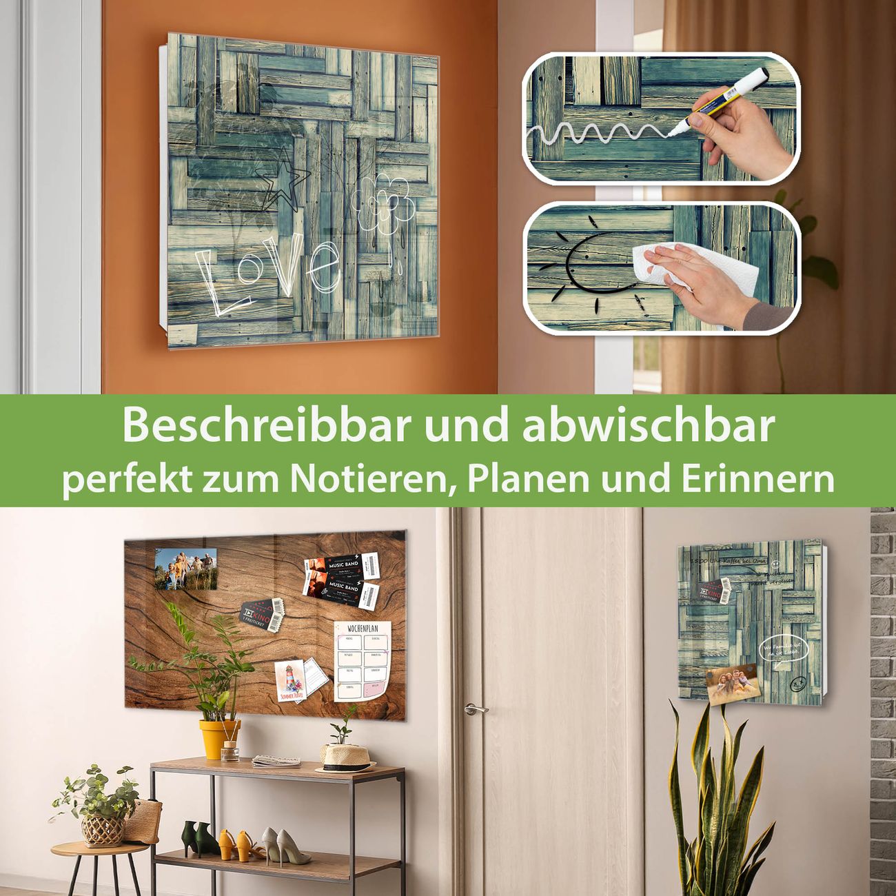 Bringe Ordnung und Eleganz in deinen Eingangsbereich mit dem banjado Schlüsselkasten Motiv Motiv Grüne Planken. Die moderne Schlüsselbox kombiniert funktionales Design mit hochwertiger Verarbeitung und wird so zu einem echten Hingucker in Flur, Büro oder Ferienwohnung. ✅ Stilvolle Schlüsselaufbewahrung mit Glasfront im Motiv Motiv Grüne Planken Der Design-Schlüsselkasten Motiv Motiv Grüne Planken bietet Platz für bis zu 50 Schlüssel, die auf 5 stabilen Reihen mit je 10 Haken übersichtlich verstaut werden. Mit seinen kompakten Maßen von 30 x 30 x 5 cm passt die Schlüsselbox perfekt auch in kleinere Räume. Der weiß lackierte Stahlkorpus mit rechts angeschlagenem Türscharnier harmoniert mit der Glasfront und fügt sich nahtlos in jedes Wohnambiente ein. Ob als Schlüsselorganizer für Zuhause oder als praktische Lösung für Büros, Praxen und Gewerbe, der banjado Schlüsselkasten sorgt für Ordnung und Übersicht. Dank der magnetischen, mit Kreidestiften beschreibbaren Glasfront kannst du Notizen anheften oder Termine direkt auf der Oberfläche festhalten. Die Schlüsselbox Motiv Motiv Grüne Planken zur Wandmontage wird inklusive Befestigungsmaterial geliefert und ist schnell angebracht. So hast du deine Schlüssel jederzeit griffbereit und zugleich stilvoll verstaut. Mit diesem banjado Schlüsselkasten Motiv Motiv Grüne Planken kombinierst du praktische Aufbewahrung mit stilvollem Wohndesign. Ob privat oder geschäftlich, die Schlüsselbox sorgt für mehr Ordnung, Übersicht und ein wohnliches Ambiente.Vorteile im Überblick