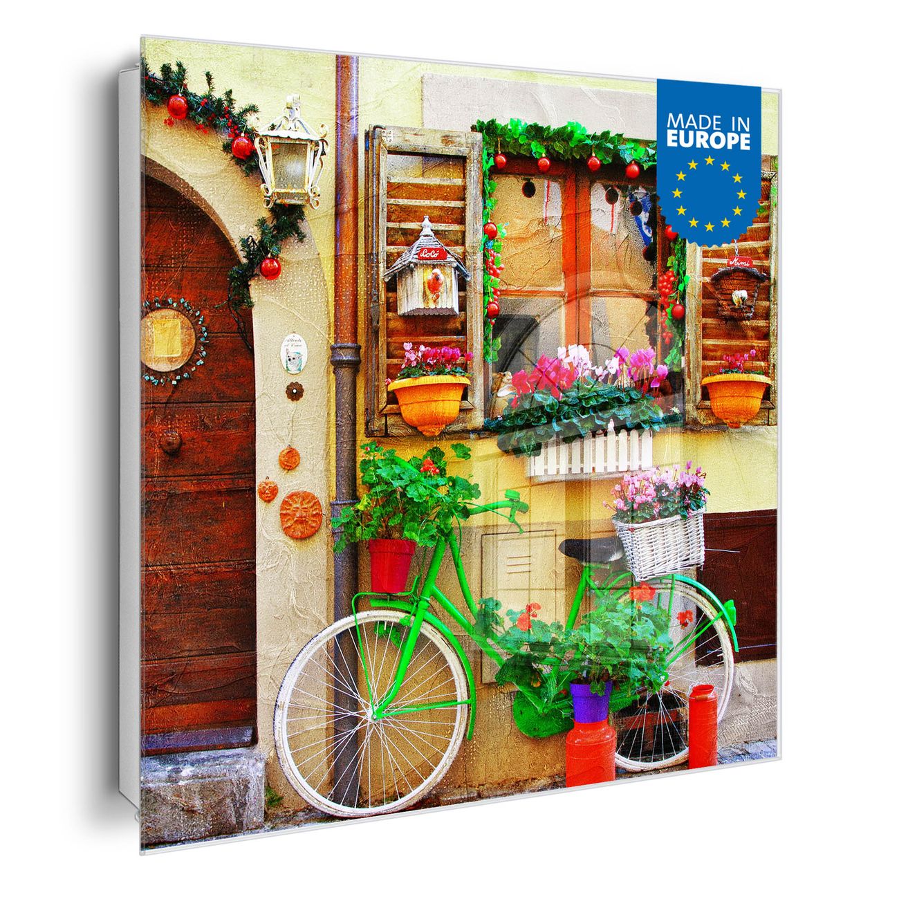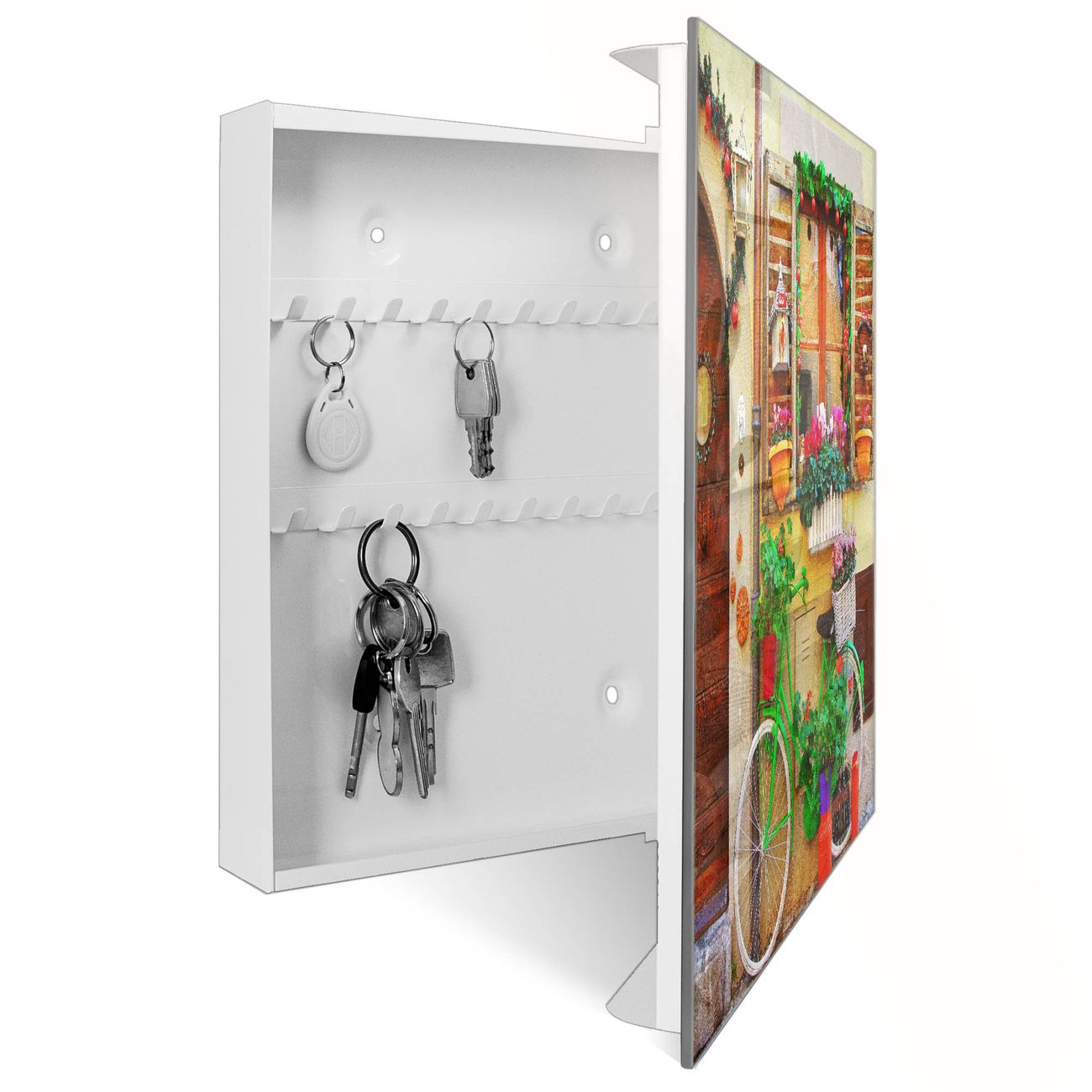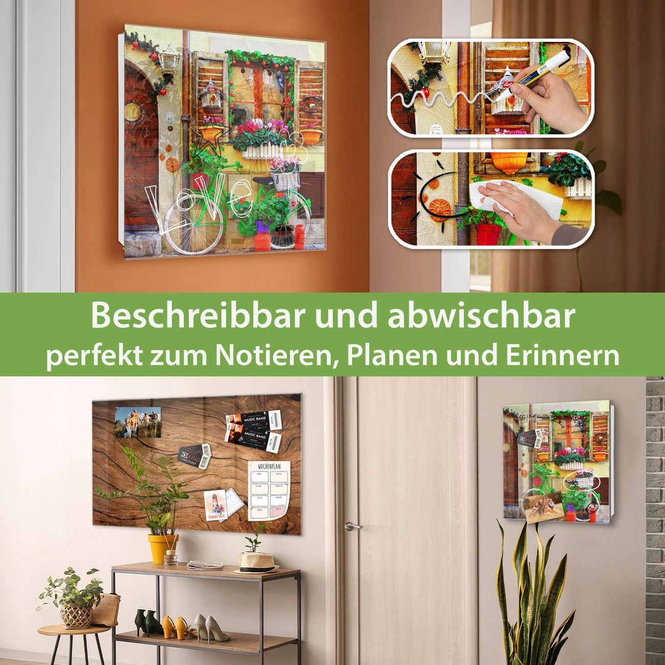 Bringe Ordnung und Eleganz in deinen Eingangsbereich mit dem banjado Schlüsselkasten Motiv Motiv Grünes Fahrrad. Die moderne Schlüsselbox kombiniert funktionales Design mit hochwertiger Verarbeitung und wird so zu einem echten Hingucker in Flur, Büro oder Ferienwohnung. ✅ Stilvolle Schlüsselaufbewahrung mit Glasfront im Motiv Motiv Grünes Fahrrad Der Design-Schlüsselkasten Motiv Motiv Grünes Fahrrad bietet Platz für bis zu 50 Schlüssel, die auf 5 stabilen Reihen mit je 10 Haken übersichtlich verstaut werden. Mit seinen kompakten Maßen von 30 x 30 x 5 cm passt die Schlüsselbox perfekt auch in kleinere Räume. Der weiß lackierte Stahlkorpus mit rechts angeschlagenem Türscharnier harmoniert mit der Glasfront und fügt sich nahtlos in jedes Wohnambiente ein. Ob als Schlüsselorganizer für Zuhause oder als praktische Lösung für Büros, Praxen und Gewerbe, der banjado Schlüsselkasten sorgt für Ordnung und Übersicht. Dank der magnetischen, mit Kreidestiften beschreibbaren Glasfront kannst du Notizen anheften oder Termine direkt auf der Oberfläche festhalten. Die Schlüsselbox Motiv Motiv Grünes Fahrrad zur Wandmontage wird inklusive Befestigungsmaterial geliefert und ist schnell angebracht. So hast du deine Schlüssel jederzeit griffbereit und zugleich stilvoll verstaut. Mit diesem banjado Schlüsselkasten Motiv Motiv Grünes Fahrrad kombinierst du praktische Aufbewahrung mit stilvollem Wohndesign. Ob privat oder geschäftlich, die Schlüsselbox sorgt für mehr Ordnung, Übersicht und ein wohnliches Ambiente.Vorteile im Überblick