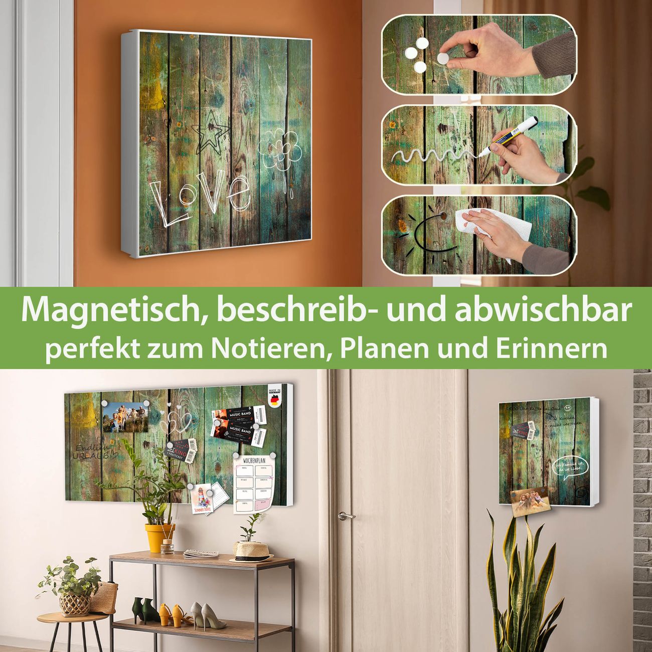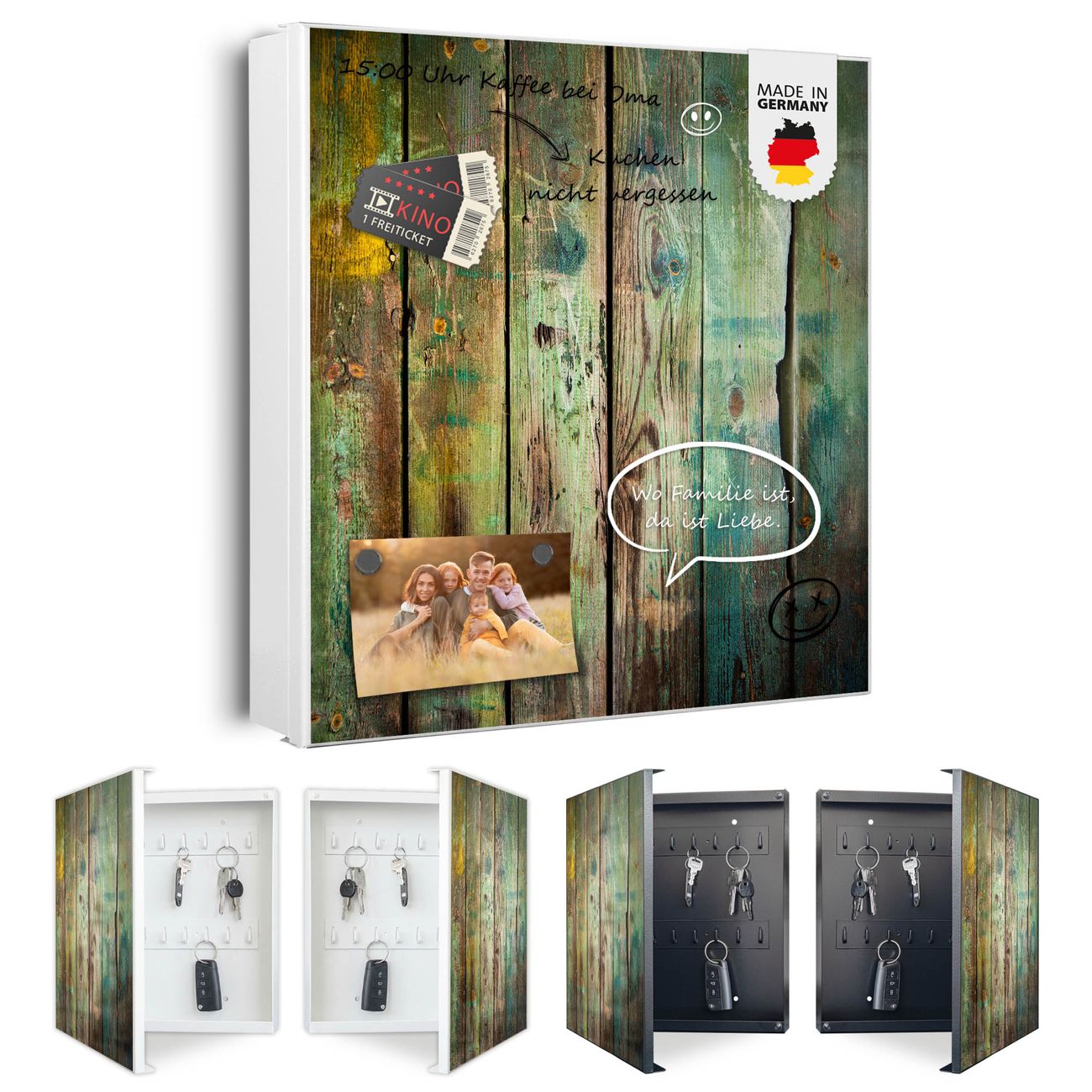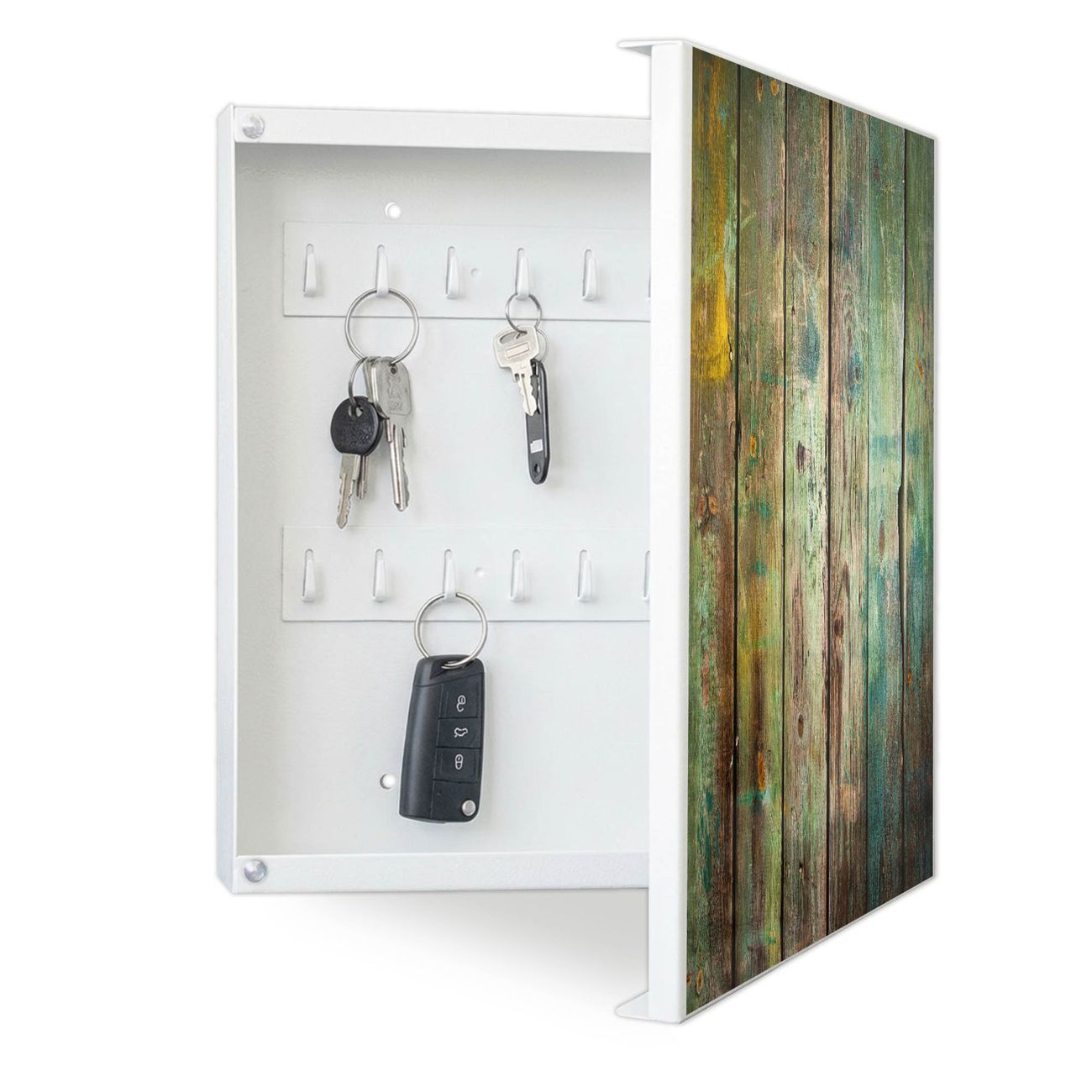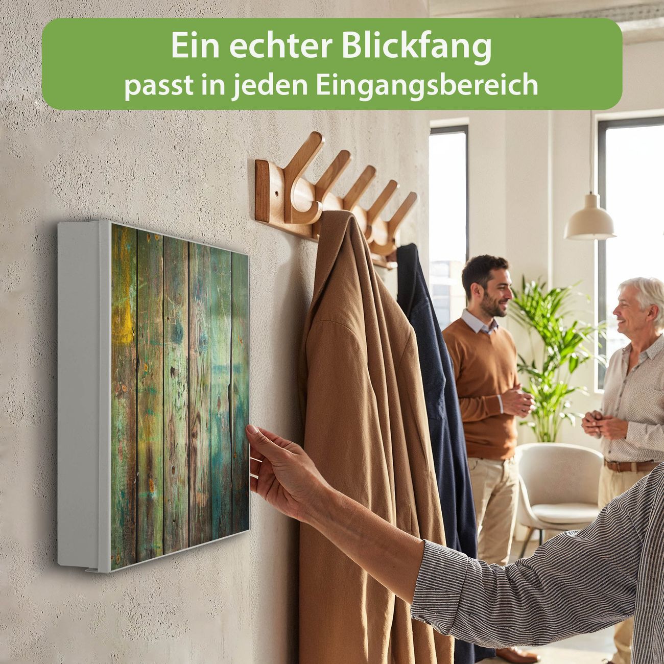 Bringe Ordnung und Eleganz in deinen Eingangsbereich mit dem banjado Schlüsselkasten Motiv Motiv Grünes Holz. Die moderne Schlüsselbox kombiniert funktionales Design mit hochwertiger Verarbeitung und wird so zu einem echten Hingucker in Flur, Büro oder Ferienwohnung. ✅ Stilvolle Schlüsselaufbewahrung mit Motiv Motiv Grünes Holz Der Design-Schlüsselkasten Motiv Motiv Grünes Holz bietet Platz für bis zu 32 Schlüssel, die auf 4 stabilen Reihen mit je 8 Haken übersichtlich verstaut werden. Mit seinen kompakten Maßen von 30 x 30 x 5 cm passt die Schlüsselbox perfekt auch in kleinere Räume. Der weiß lackierte Stahlkorpus mit rechts angeschlagenem Türscharnier harmoniert mit gedruckten Folie auf der Front und fügt sich nahtlos in jedes Wohnambiente ein. Ob als Schlüsselorganizer für Zuhause oder als praktische Lösung für Büros, Praxen und Gewerbe, der banjado Schlüsselkasten sorgt für Ordnung und Übersicht. Dank der magnetischen, mit Kreidestiften beschreibbaren Folie auf der Front kannst du Notizen anheften oder Termine direkt auf der Oberfläche festhalten. Die Schlüsselbox Motiv Motiv Grünes Holz zur Wandmontage wird inklusive Befestigungsmaterial geliefert und ist schnell angebracht. So hast du deine Schlüssel jederzeit griffbereit und zugleich stilvoll verstaut. Mit diesem banjado Schlüsselkasten Motiv Motiv Grünes Holz kombinierst du praktische Aufbewahrung mit stilvollem Wohndesign. Ob privat oder geschäftlich, die Schlüsselbox sorgt für mehr Ordnung, Übersicht und ein wohnliches Ambiente.Vorteile im Überblick