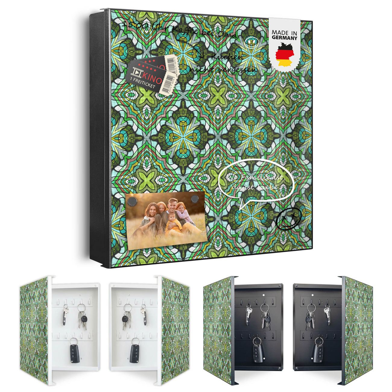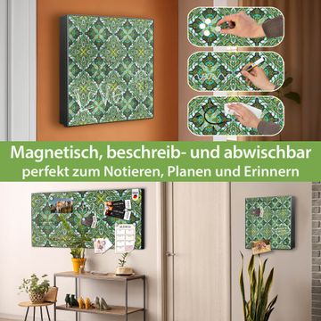 Bringe Ordnung und Eleganz in deinen Eingangsbereich mit dem banjado Schlüsselkasten Motiv Motiv Grünes Muster. Die moderne Schlüsselbox kombiniert funktionales Design mit hochwertiger Verarbeitung und wird so zu einem echten Hingucker in Flur, Büro oder Ferienwohnung. ✅ Stilvolle Schlüsselaufbewahrung mit Motiv Motiv Grünes Muster Der Design-Schlüsselkasten Motiv Motiv Grünes Muster bietet Platz für bis zu 32 Schlüssel, die auf 4 stabilen Reihen mit je 8 Haken übersichtlich verstaut werden. Mit seinen kompakten Maßen von 30 x 30 x 5 cm passt die Schlüsselbox perfekt auch in kleinere Räume. Der schwarz lackierte Stahlkorpus mit rechts angeschlagenem Türscharnier harmoniert mit gedruckten Folie auf der Front und fügt sich nahtlos in jedes Wohnambiente ein. Ob als Schlüsselorganizer für Zuhause oder als praktische Lösung für Büros, Praxen und Gewerbe, der banjado Schlüsselkasten sorgt für Ordnung und Übersicht. Dank der magnetischen, mit Kreidestiften beschreibbaren Folie auf der Front kannst du Notizen anheften oder Termine direkt auf der Oberfläche festhalten. Die Schlüsselbox Motiv Motiv Grünes Muster zur Wandmontage wird inklusive Befestigungsmaterial geliefert und ist schnell angebracht. So hast du deine Schlüssel jederzeit griffbereit und zugleich stilvoll verstaut. Mit diesem banjado Schlüsselkasten Motiv Motiv Grünes Muster kombinierst du praktische Aufbewahrung mit stilvollem Wohndesign. Ob privat oder geschäftlich, die Schlüsselbox sorgt für mehr Ordnung, Übersicht und ein wohnliches Ambiente.Vorteile im Überblick