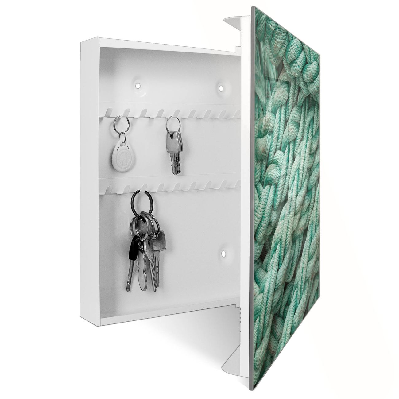 Bringe Ordnung und Eleganz in deinen Eingangsbereich mit dem banjado Schlüsselkasten Motiv Motiv Grünes Tau. Die moderne Schlüsselbox kombiniert funktionales Design mit hochwertiger Verarbeitung und wird so zu einem echten Hingucker in Flur, Büro oder Ferienwohnung. ✅ Stilvolle Schlüsselaufbewahrung mit Glasfront im Motiv Motiv Grünes Tau Der Design-Schlüsselkasten Motiv Motiv Grünes Tau bietet Platz für bis zu 50 Schlüssel, die auf 5 stabilen Reihen mit je 10 Haken übersichtlich verstaut werden. Mit seinen kompakten Maßen von 30 x 30 x 5 cm passt die Schlüsselbox perfekt auch in kleinere Räume. Der weiß lackierte Stahlkorpus mit rechts angeschlagenem Türscharnier harmoniert mit der Glasfront und fügt sich nahtlos in jedes Wohnambiente ein. Ob als Schlüsselorganizer für Zuhause oder als praktische Lösung für Büros, Praxen und Gewerbe, der banjado Schlüsselkasten sorgt für Ordnung und Übersicht. Dank der magnetischen, mit Kreidestiften beschreibbaren Glasfront kannst du Notizen anheften oder Termine direkt auf der Oberfläche festhalten. Die Schlüsselbox Motiv Motiv Grünes Tau zur Wandmontage wird inklusive Befestigungsmaterial geliefert und ist schnell angebracht. So hast du deine Schlüssel jederzeit griffbereit und zugleich stilvoll verstaut. Mit diesem banjado Schlüsselkasten Motiv Motiv Grünes Tau kombinierst du praktische Aufbewahrung mit stilvollem Wohndesign. Ob privat oder geschäftlich, die Schlüsselbox sorgt für mehr Ordnung, Übersicht und ein wohnliches Ambiente.Vorteile im Überblick