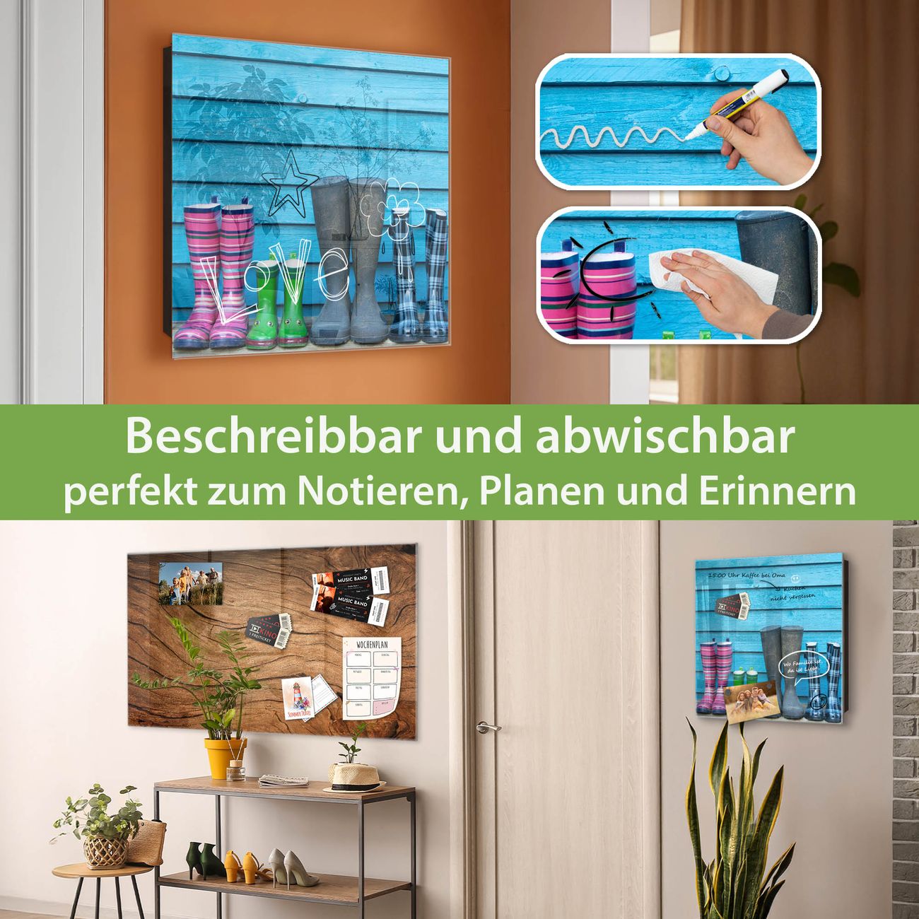 Bringe Ordnung und Eleganz in deinen Eingangsbereich mit dem banjado Schlüsselkasten Motiv Motiv Gummistiefel. Die moderne Schlüsselbox kombiniert funktionales Design mit hochwertiger Verarbeitung und wird so zu einem echten Hingucker in Flur, Büro oder Ferienwohnung. ✅ Stilvolle Schlüsselaufbewahrung mit Glasfront im Motiv Motiv Gummistiefel Der Design-Schlüsselkasten Motiv Motiv Gummistiefel bietet Platz für bis zu 50 Schlüssel, die auf 5 stabilen Reihen mit je 10 Haken übersichtlich verstaut werden. Mit seinen kompakten Maßen von 30 x 30 x 5 cm passt die Schlüsselbox perfekt auch in kleinere Räume. Der schwarz lackierte Stahlkorpus mit rechts angeschlagenem Türscharnier harmoniert mit der Glasfront und fügt sich nahtlos in jedes Wohnambiente ein. Ob als Schlüsselorganizer für Zuhause oder als praktische Lösung für Büros, Praxen und Gewerbe, der banjado Schlüsselkasten sorgt für Ordnung und Übersicht. Dank der magnetischen, mit Kreidestiften beschreibbaren Glasfront kannst du Notizen anheften oder Termine direkt auf der Oberfläche festhalten. Die Schlüsselbox Motiv Motiv Gummistiefel zur Wandmontage wird inklusive Befestigungsmaterial geliefert und ist schnell angebracht. So hast du deine Schlüssel jederzeit griffbereit und zugleich stilvoll verstaut. Mit diesem banjado Schlüsselkasten Motiv Motiv Gummistiefel kombinierst du praktische Aufbewahrung mit stilvollem Wohndesign. Ob privat oder geschäftlich, die Schlüsselbox sorgt für mehr Ordnung, Übersicht und ein wohnliches Ambiente.Vorteile im Überblick