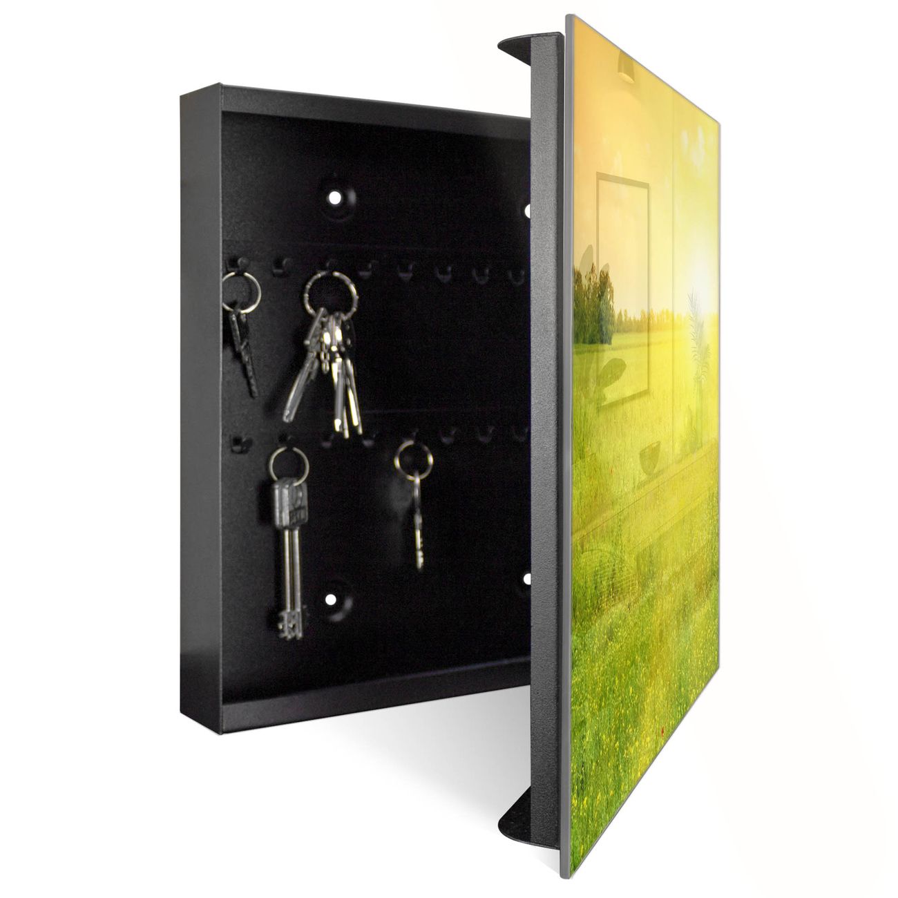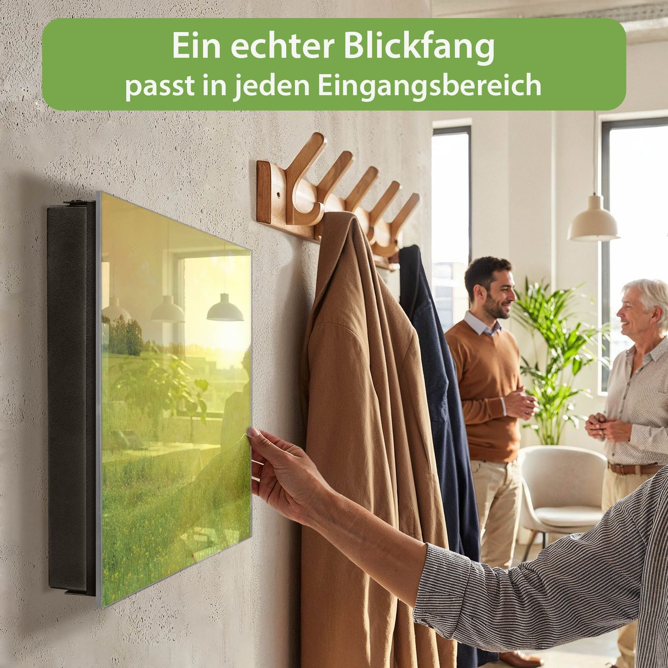 Bringe Ordnung und Eleganz in deinen Eingangsbereich mit dem banjado Schlüsselkasten Motiv Motiv Guten Morgen 2. Die moderne Schlüsselbox kombiniert funktionales Design mit hochwertiger Verarbeitung und wird so zu einem echten Hingucker in Flur, Büro oder Ferienwohnung. ✅ Stilvolle Schlüsselaufbewahrung mit Glasfront im Motiv Motiv Guten Morgen 2 Der Design-Schlüsselkasten Motiv Motiv Guten Morgen 2 bietet Platz für bis zu 50 Schlüssel, die auf 5 stabilen Reihen mit je 10 Haken übersichtlich verstaut werden. Mit seinen kompakten Maßen von 30 x 30 x 5 cm passt die Schlüsselbox perfekt auch in kleinere Räume. Der schwarz lackierte Stahlkorpus mit rechts angeschlagenem Türscharnier harmoniert mit der Glasfront und fügt sich nahtlos in jedes Wohnambiente ein. Ob als Schlüsselorganizer für Zuhause oder als praktische Lösung für Büros, Praxen und Gewerbe, der banjado Schlüsselkasten sorgt für Ordnung und Übersicht. Dank der magnetischen, mit Kreidestiften beschreibbaren Glasfront kannst du Notizen anheften oder Termine direkt auf der Oberfläche festhalten. Die Schlüsselbox Motiv Motiv Guten Morgen 2 zur Wandmontage wird inklusive Befestigungsmaterial geliefert und ist schnell angebracht. So hast du deine Schlüssel jederzeit griffbereit und zugleich stilvoll verstaut. Mit diesem banjado Schlüsselkasten Motiv Motiv Guten Morgen 2 kombinierst du praktische Aufbewahrung mit stilvollem Wohndesign. Ob privat oder geschäftlich, die Schlüsselbox sorgt für mehr Ordnung, Übersicht und ein wohnliches Ambiente.Vorteile im Überblick