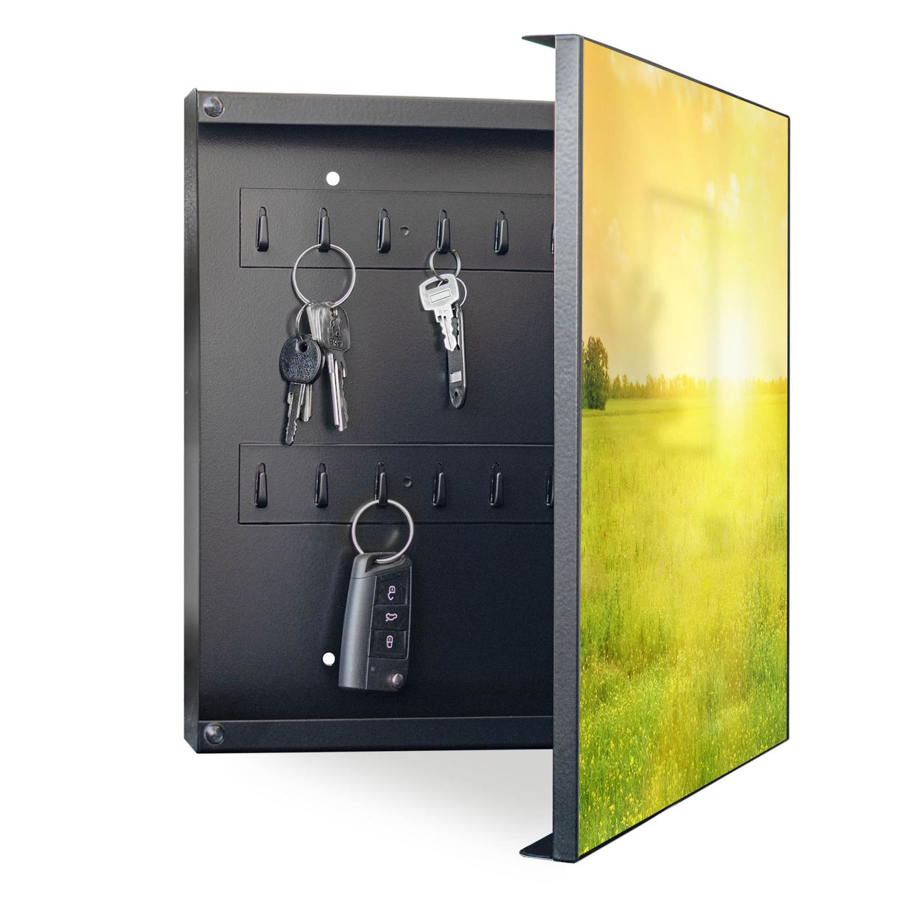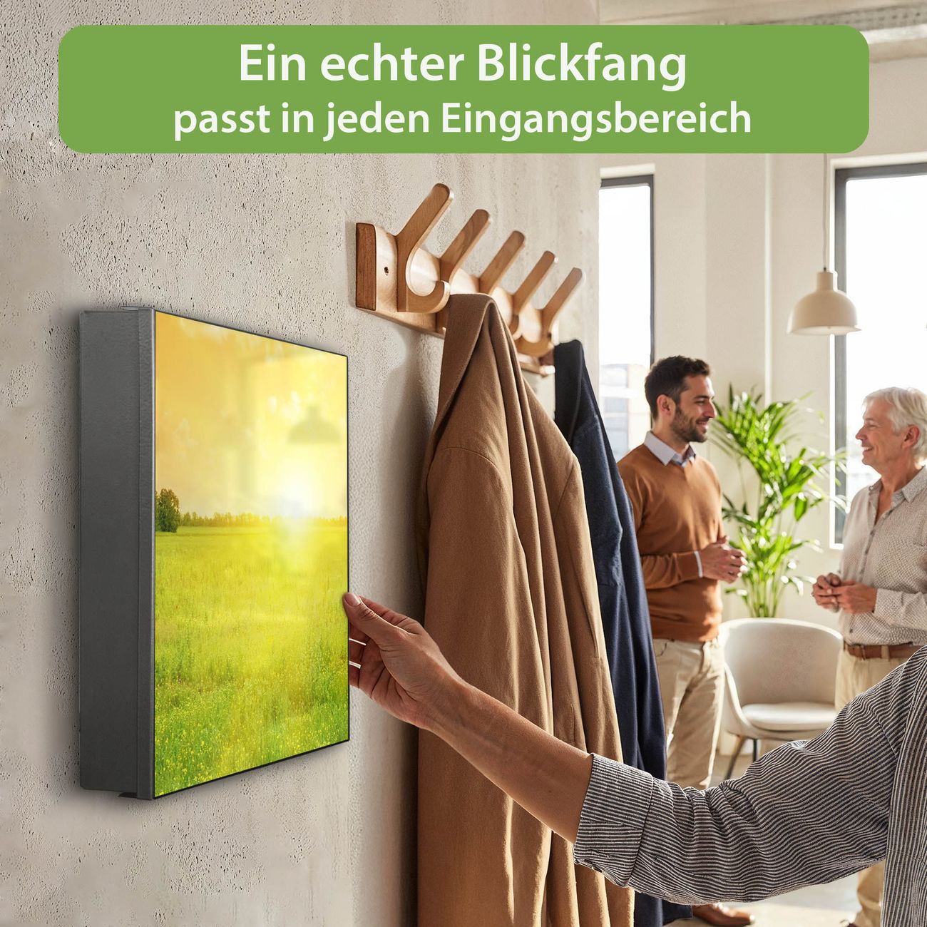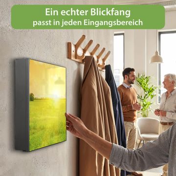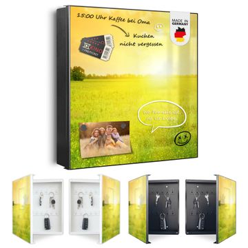 Bringe Ordnung und Eleganz in deinen Eingangsbereich mit dem banjado Schlüsselkasten Motiv Motiv Guten Morgen 2. Die moderne Schlüsselbox kombiniert funktionales Design mit hochwertiger Verarbeitung und wird so zu einem echten Hingucker in Flur, Büro oder Ferienwohnung. ✅ Stilvolle Schlüsselaufbewahrung mit Motiv Motiv Guten Morgen 2 Der Design-Schlüsselkasten Motiv Motiv Guten Morgen 2 bietet Platz für bis zu 32 Schlüssel, die auf 4 stabilen Reihen mit je 8 Haken übersichtlich verstaut werden. Mit seinen kompakten Maßen von 30 x 30 x 5 cm passt die Schlüsselbox perfekt auch in kleinere Räume. Der schwarz lackierte Stahlkorpus mit rechts angeschlagenem Türscharnier harmoniert mit gedruckten Folie auf der Front und fügt sich nahtlos in jedes Wohnambiente ein. Ob als Schlüsselorganizer für Zuhause oder als praktische Lösung für Büros, Praxen und Gewerbe, der banjado Schlüsselkasten sorgt für Ordnung und Übersicht. Dank der magnetischen, mit Kreidestiften beschreibbaren Folie auf der Front kannst du Notizen anheften oder Termine direkt auf der Oberfläche festhalten. Die Schlüsselbox Motiv Motiv Guten Morgen 2 zur Wandmontage wird inklusive Befestigungsmaterial geliefert und ist schnell angebracht. So hast du deine Schlüssel jederzeit griffbereit und zugleich stilvoll verstaut. Mit diesem banjado Schlüsselkasten Motiv Motiv Guten Morgen 2 kombinierst du praktische Aufbewahrung mit stilvollem Wohndesign. Ob privat oder geschäftlich, die Schlüsselbox sorgt für mehr Ordnung, Übersicht und ein wohnliches Ambiente.Vorteile im Überblick