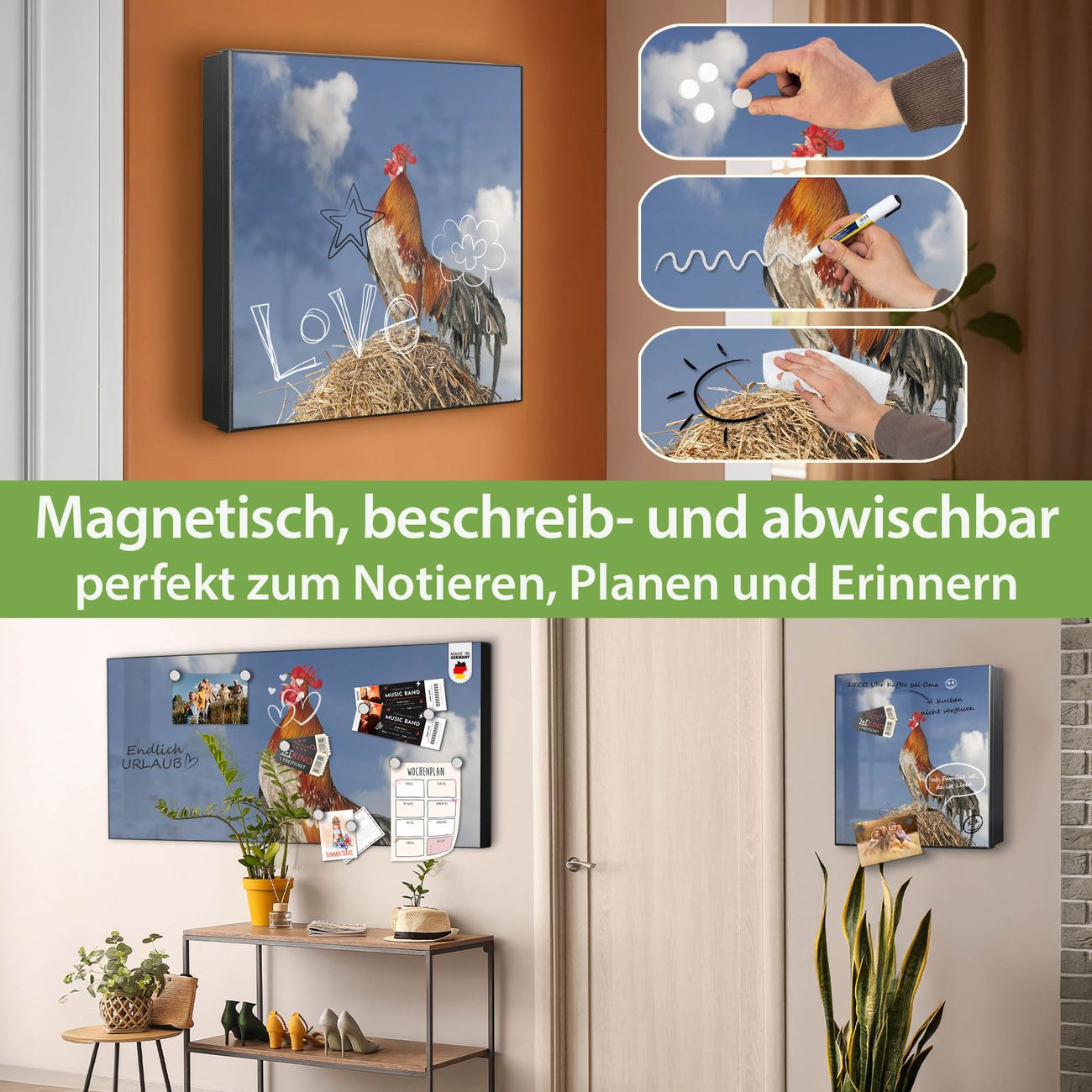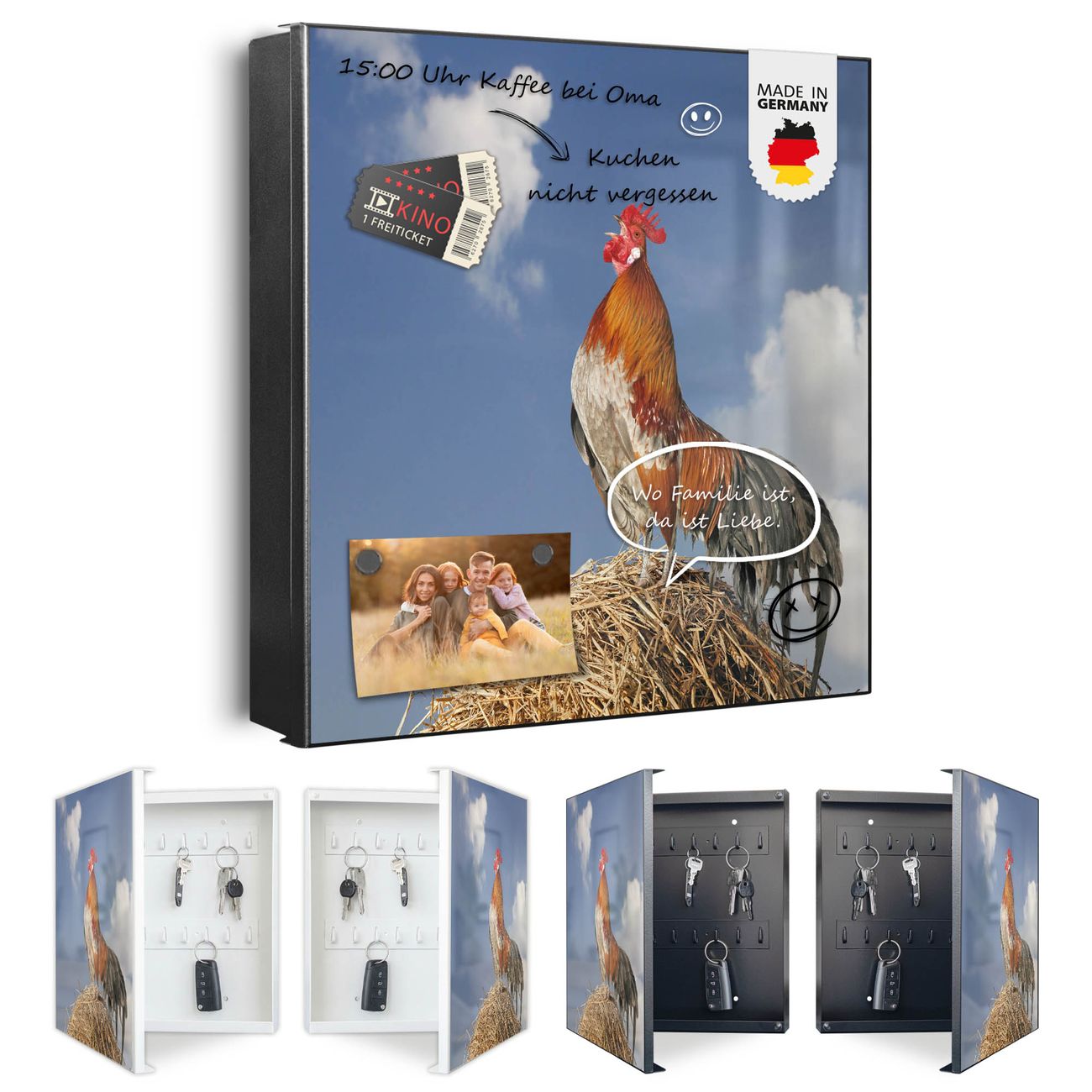 Bringe Ordnung und Eleganz in deinen Eingangsbereich mit dem banjado Schlüsselkasten Motiv Motiv Hahn. Die moderne Schlüsselbox kombiniert funktionales Design mit hochwertiger Verarbeitung und wird so zu einem echten Hingucker in Flur, Büro oder Ferienwohnung. ✅ Stilvolle Schlüsselaufbewahrung mit Motiv Motiv Hahn Der Design-Schlüsselkasten Motiv Motiv Hahn bietet Platz für bis zu 32 Schlüssel, die auf 4 stabilen Reihen mit je 8 Haken übersichtlich verstaut werden. Mit seinen kompakten Maßen von 30 x 30 x 5 cm passt die Schlüsselbox perfekt auch in kleinere Räume. Der schwarz lackierte Stahlkorpus mit rechts angeschlagenem Türscharnier harmoniert mit gedruckten Folie auf der Front und fügt sich nahtlos in jedes Wohnambiente ein. Ob als Schlüsselorganizer für Zuhause oder als praktische Lösung für Büros, Praxen und Gewerbe, der banjado Schlüsselkasten sorgt für Ordnung und Übersicht. Dank der magnetischen, mit Kreidestiften beschreibbaren Folie auf der Front kannst du Notizen anheften oder Termine direkt auf der Oberfläche festhalten. Die Schlüsselbox Motiv Motiv Hahn zur Wandmontage wird inklusive Befestigungsmaterial geliefert und ist schnell angebracht. So hast du deine Schlüssel jederzeit griffbereit und zugleich stilvoll verstaut. Mit diesem banjado Schlüsselkasten Motiv Motiv Hahn kombinierst du praktische Aufbewahrung mit stilvollem Wohndesign. Ob privat oder geschäftlich, die Schlüsselbox sorgt für mehr Ordnung, Übersicht und ein wohnliches Ambiente.Vorteile im Überblick
