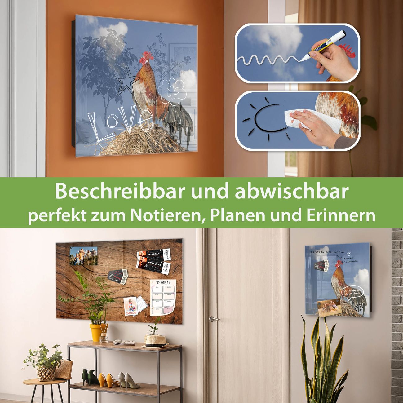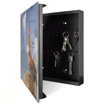 Bringe Ordnung und Eleganz in deinen Eingangsbereich mit dem banjado Schlüsselkasten Motiv Motiv Hahn. Die moderne Schlüsselbox kombiniert funktionales Design mit hochwertiger Verarbeitung und wird so zu einem echten Hingucker in Flur, Büro oder Ferienwohnung. ✅ Stilvolle Schlüsselaufbewahrung mit Glasfront im Motiv Motiv Hahn Der Design-Schlüsselkasten Motiv Motiv Hahn bietet Platz für bis zu 50 Schlüssel, die auf 5 stabilen Reihen mit je 10 Haken übersichtlich verstaut werden. Mit seinen kompakten Maßen von 30 x 30 x 5 cm passt die Schlüsselbox perfekt auch in kleinere Räume. Der schwarz lackierte Stahlkorpus mit rechts angeschlagenem Türscharnier harmoniert mit der Glasfront und fügt sich nahtlos in jedes Wohnambiente ein. Ob als Schlüsselorganizer für Zuhause oder als praktische Lösung für Büros, Praxen und Gewerbe, der banjado Schlüsselkasten sorgt für Ordnung und Übersicht. Dank der magnetischen, mit Kreidestiften beschreibbaren Glasfront kannst du Notizen anheften oder Termine direkt auf der Oberfläche festhalten. Die Schlüsselbox Motiv Motiv Hahn zur Wandmontage wird inklusive Befestigungsmaterial geliefert und ist schnell angebracht. So hast du deine Schlüssel jederzeit griffbereit und zugleich stilvoll verstaut. Mit diesem banjado Schlüsselkasten Motiv Motiv Hahn kombinierst du praktische Aufbewahrung mit stilvollem Wohndesign. Ob privat oder geschäftlich, die Schlüsselbox sorgt für mehr Ordnung, Übersicht und ein wohnliches Ambiente.Vorteile im Überblick