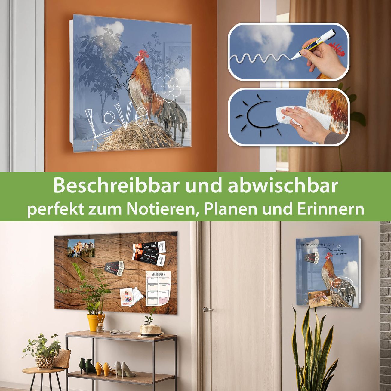 Bringe Ordnung und Eleganz in deinen Eingangsbereich mit dem banjado Schlüsselkasten Motiv Motiv Hahn. Die moderne Schlüsselbox kombiniert funktionales Design mit hochwertiger Verarbeitung und wird so zu einem echten Hingucker in Flur, Büro oder Ferienwohnung. ✅ Stilvolle Schlüsselaufbewahrung mit Glasfront im Motiv Motiv Hahn Der Design-Schlüsselkasten Motiv Motiv Hahn bietet Platz für bis zu 50 Schlüssel, die auf 5 stabilen Reihen mit je 10 Haken übersichtlich verstaut werden. Mit seinen kompakten Maßen von 30 x 30 x 5 cm passt die Schlüsselbox perfekt auch in kleinere Räume. Der weiß lackierte Stahlkorpus mit rechts angeschlagenem Türscharnier harmoniert mit der Glasfront und fügt sich nahtlos in jedes Wohnambiente ein. Ob als Schlüsselorganizer für Zuhause oder als praktische Lösung für Büros, Praxen und Gewerbe, der banjado Schlüsselkasten sorgt für Ordnung und Übersicht. Dank der magnetischen, mit Kreidestiften beschreibbaren Glasfront kannst du Notizen anheften oder Termine direkt auf der Oberfläche festhalten. Die Schlüsselbox Motiv Motiv Hahn zur Wandmontage wird inklusive Befestigungsmaterial geliefert und ist schnell angebracht. So hast du deine Schlüssel jederzeit griffbereit und zugleich stilvoll verstaut. Mit diesem banjado Schlüsselkasten Motiv Motiv Hahn kombinierst du praktische Aufbewahrung mit stilvollem Wohndesign. Ob privat oder geschäftlich, die Schlüsselbox sorgt für mehr Ordnung, Übersicht und ein wohnliches Ambiente.Vorteile im Überblick