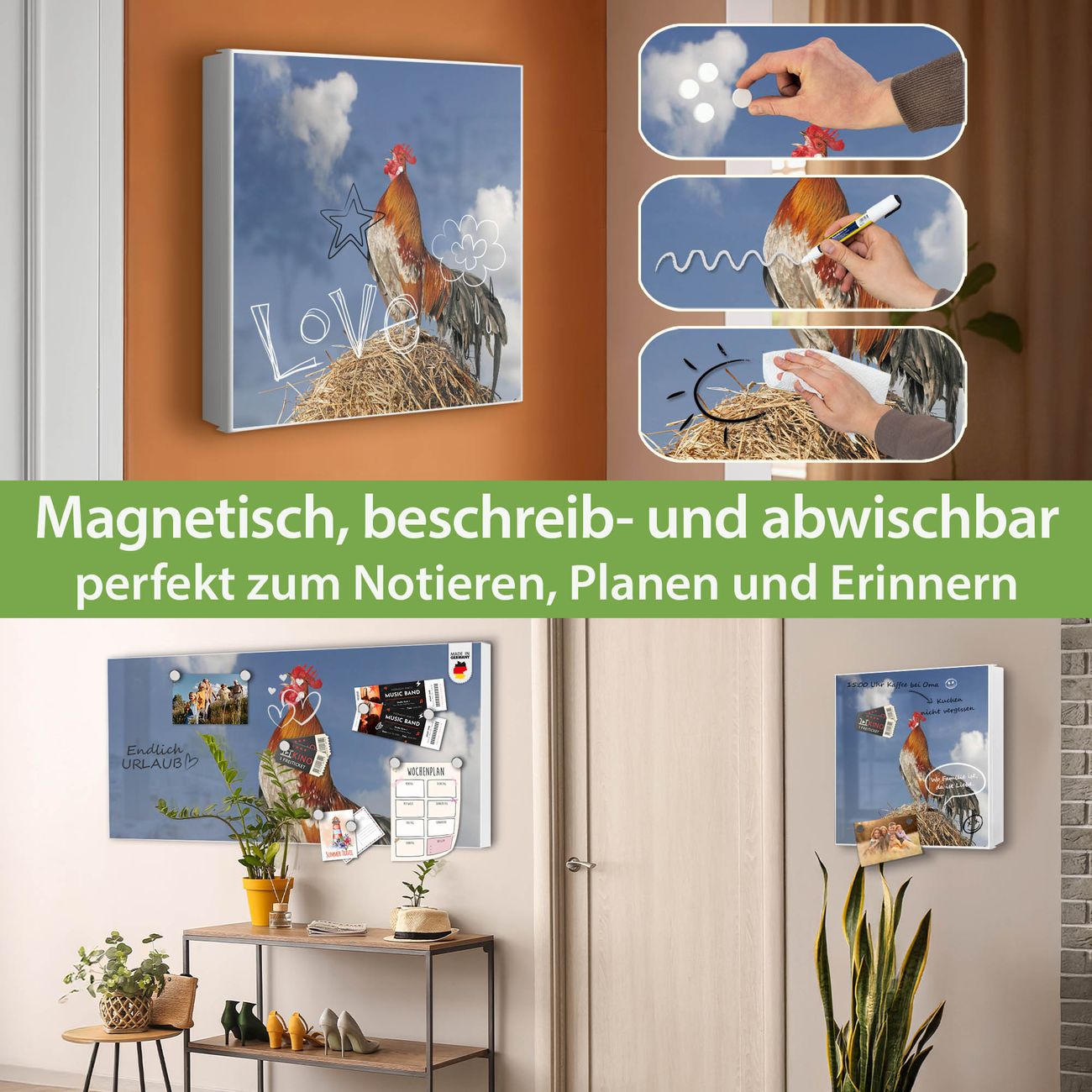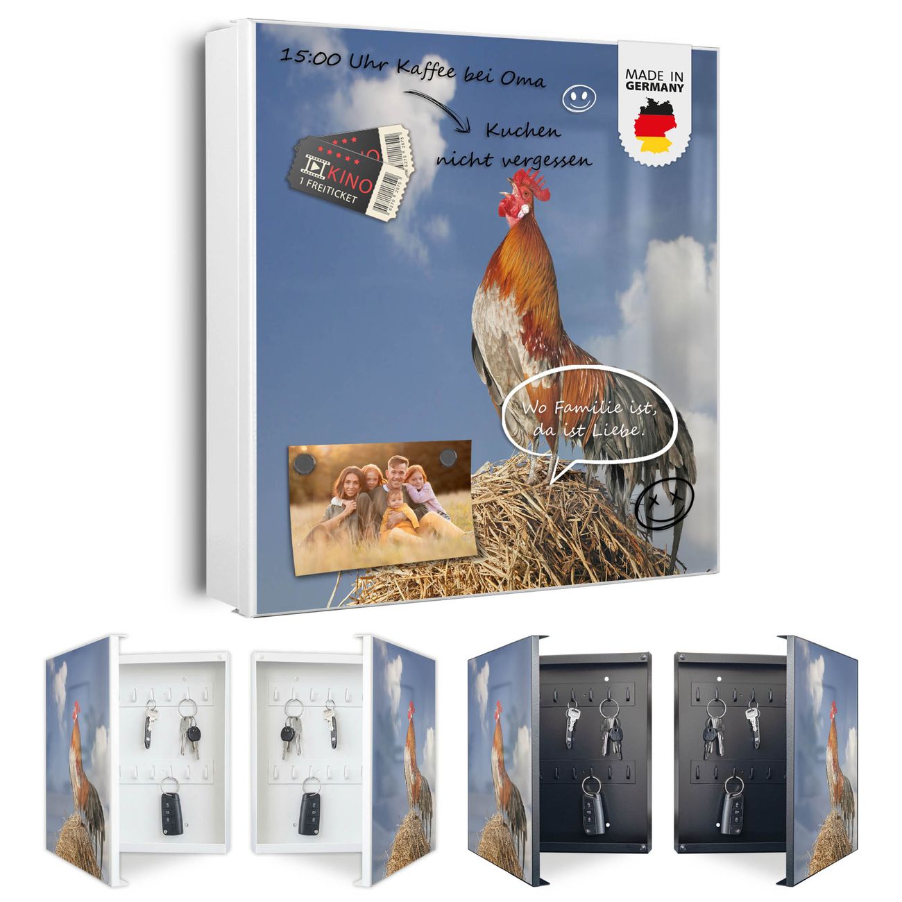 Bringe Ordnung und Eleganz in deinen Eingangsbereich mit dem banjado Schlüsselkasten Motiv Motiv Hahn. Die moderne Schlüsselbox kombiniert funktionales Design mit hochwertiger Verarbeitung und wird so zu einem echten Hingucker in Flur, Büro oder Ferienwohnung. ✅ Stilvolle Schlüsselaufbewahrung mit Motiv Motiv Hahn Der Design-Schlüsselkasten Motiv Motiv Hahn bietet Platz für bis zu 32 Schlüssel, die auf 4 stabilen Reihen mit je 8 Haken übersichtlich verstaut werden. Mit seinen kompakten Maßen von 30 x 30 x 5 cm passt die Schlüsselbox perfekt auch in kleinere Räume. Der weiß lackierte Stahlkorpus mit links angeschlagenem Türscharnier harmoniert mit gedruckten Folie auf der Front und fügt sich nahtlos in jedes Wohnambiente ein. Ob als Schlüsselorganizer für Zuhause oder als praktische Lösung für Büros, Praxen und Gewerbe, der banjado Schlüsselkasten sorgt für Ordnung und Übersicht. Dank der magnetischen, mit Kreidestiften beschreibbaren Folie auf der Front kannst du Notizen anheften oder Termine direkt auf der Oberfläche festhalten. Die Schlüsselbox Motiv Motiv Hahn zur Wandmontage wird inklusive Befestigungsmaterial geliefert und ist schnell angebracht. So hast du deine Schlüssel jederzeit griffbereit und zugleich stilvoll verstaut. Mit diesem banjado Schlüsselkasten Motiv Motiv Hahn kombinierst du praktische Aufbewahrung mit stilvollem Wohndesign. Ob privat oder geschäftlich, die Schlüsselbox sorgt für mehr Ordnung, Übersicht und ein wohnliches Ambiente.Vorteile im Überblick