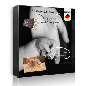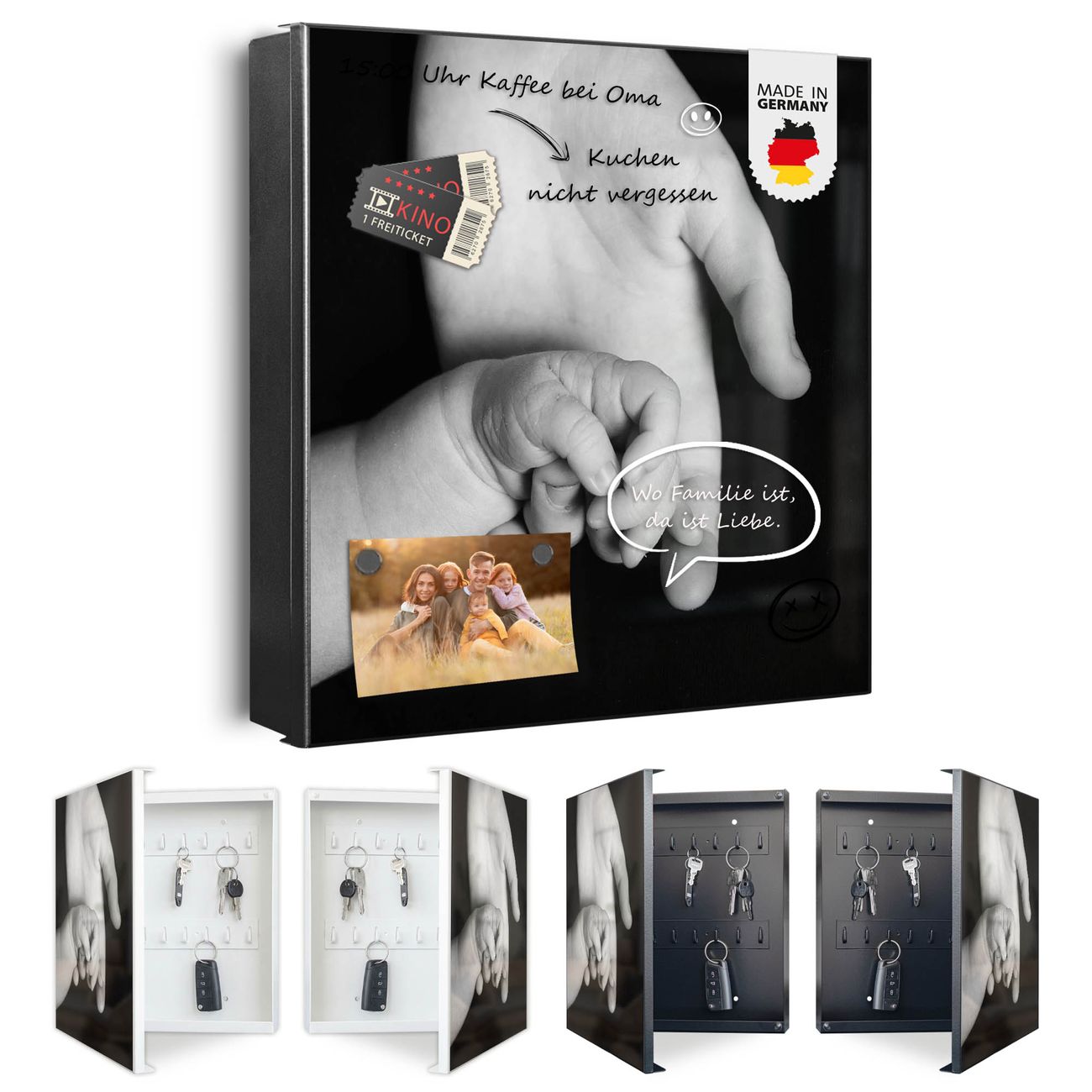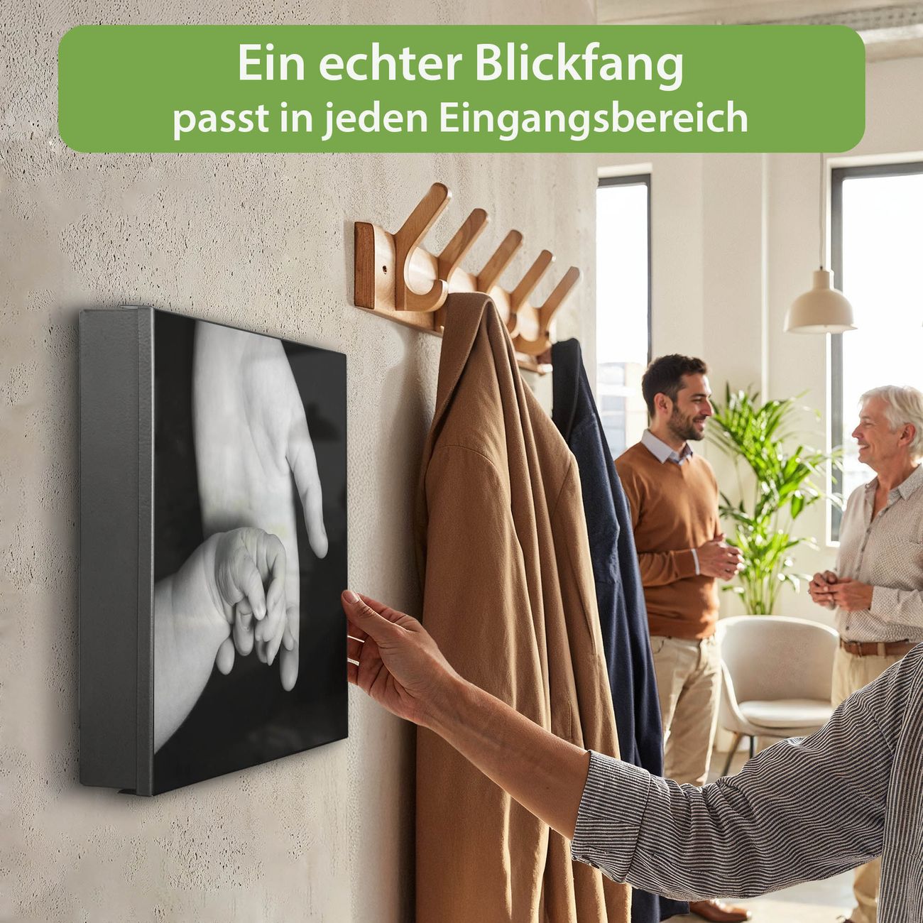 Bringe Ordnung und Eleganz in deinen Eingangsbereich mit dem banjado Schlüsselkasten Motiv Motiv Hands. Die moderne Schlüsselbox kombiniert funktionales Design mit hochwertiger Verarbeitung und wird so zu einem echten Hingucker in Flur, Büro oder Ferienwohnung. ✅ Stilvolle Schlüsselaufbewahrung mit Motiv Motiv Hands Der Design-Schlüsselkasten Motiv Motiv Hands bietet Platz für bis zu 32 Schlüssel, die auf 4 stabilen Reihen mit je 8 Haken übersichtlich verstaut werden. Mit seinen kompakten Maßen von 30 x 30 x 5 cm passt die Schlüsselbox perfekt auch in kleinere Räume. Der schwarz lackierte Stahlkorpus mit rechts angeschlagenem Türscharnier harmoniert mit gedruckten Folie auf der Front und fügt sich nahtlos in jedes Wohnambiente ein. Ob als Schlüsselorganizer für Zuhause oder als praktische Lösung für Büros, Praxen und Gewerbe, der banjado Schlüsselkasten sorgt für Ordnung und Übersicht. Dank der magnetischen, mit Kreidestiften beschreibbaren Folie auf der Front kannst du Notizen anheften oder Termine direkt auf der Oberfläche festhalten. Die Schlüsselbox Motiv Motiv Hands zur Wandmontage wird inklusive Befestigungsmaterial geliefert und ist schnell angebracht. So hast du deine Schlüssel jederzeit griffbereit und zugleich stilvoll verstaut. Mit diesem banjado Schlüsselkasten Motiv Motiv Hands kombinierst du praktische Aufbewahrung mit stilvollem Wohndesign. Ob privat oder geschäftlich, die Schlüsselbox sorgt für mehr Ordnung, Übersicht und ein wohnliches Ambiente.Vorteile im Überblick