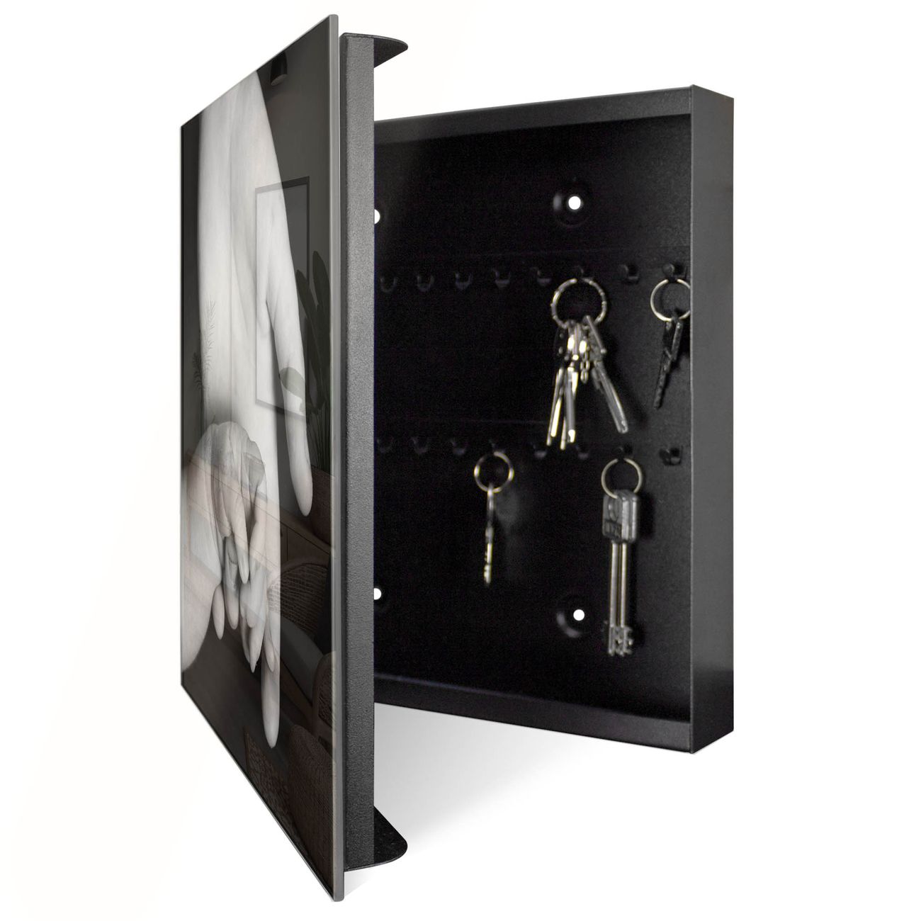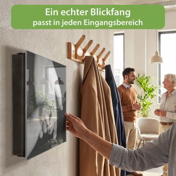 Bringe Ordnung und Eleganz in deinen Eingangsbereich mit dem banjado Schlüsselkasten Motiv Motiv Hands. Die moderne Schlüsselbox kombiniert funktionales Design mit hochwertiger Verarbeitung und wird so zu einem echten Hingucker in Flur, Büro oder Ferienwohnung. ✅ Stilvolle Schlüsselaufbewahrung mit Glasfront im Motiv Motiv Hands Der Design-Schlüsselkasten Motiv Motiv Hands bietet Platz für bis zu 50 Schlüssel, die auf 5 stabilen Reihen mit je 10 Haken übersichtlich verstaut werden. Mit seinen kompakten Maßen von 30 x 30 x 5 cm passt die Schlüsselbox perfekt auch in kleinere Räume. Der schwarz lackierte Stahlkorpus mit rechts angeschlagenem Türscharnier harmoniert mit der Glasfront und fügt sich nahtlos in jedes Wohnambiente ein. Ob als Schlüsselorganizer für Zuhause oder als praktische Lösung für Büros, Praxen und Gewerbe, der banjado Schlüsselkasten sorgt für Ordnung und Übersicht. Dank der magnetischen, mit Kreidestiften beschreibbaren Glasfront kannst du Notizen anheften oder Termine direkt auf der Oberfläche festhalten. Die Schlüsselbox Motiv Motiv Hands zur Wandmontage wird inklusive Befestigungsmaterial geliefert und ist schnell angebracht. So hast du deine Schlüssel jederzeit griffbereit und zugleich stilvoll verstaut. Mit diesem banjado Schlüsselkasten Motiv Motiv Hands kombinierst du praktische Aufbewahrung mit stilvollem Wohndesign. Ob privat oder geschäftlich, die Schlüsselbox sorgt für mehr Ordnung, Übersicht und ein wohnliches Ambiente.Vorteile im Überblick