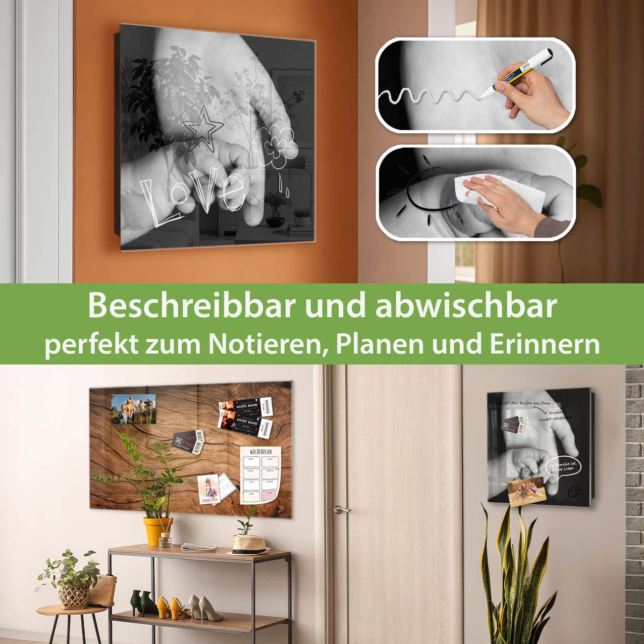✅ Magnetisch und mit Kreidestift beschreibbar, gehärtetes Glas, links angeschlagene TürOrdnung und Design in einem