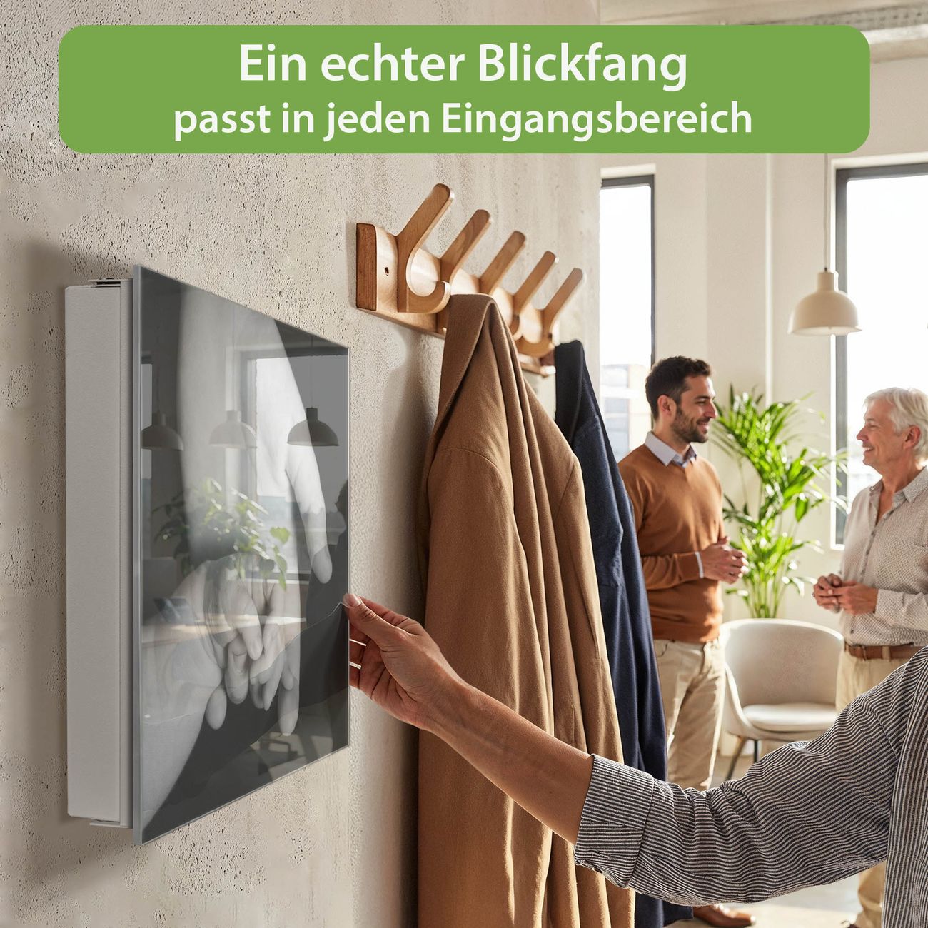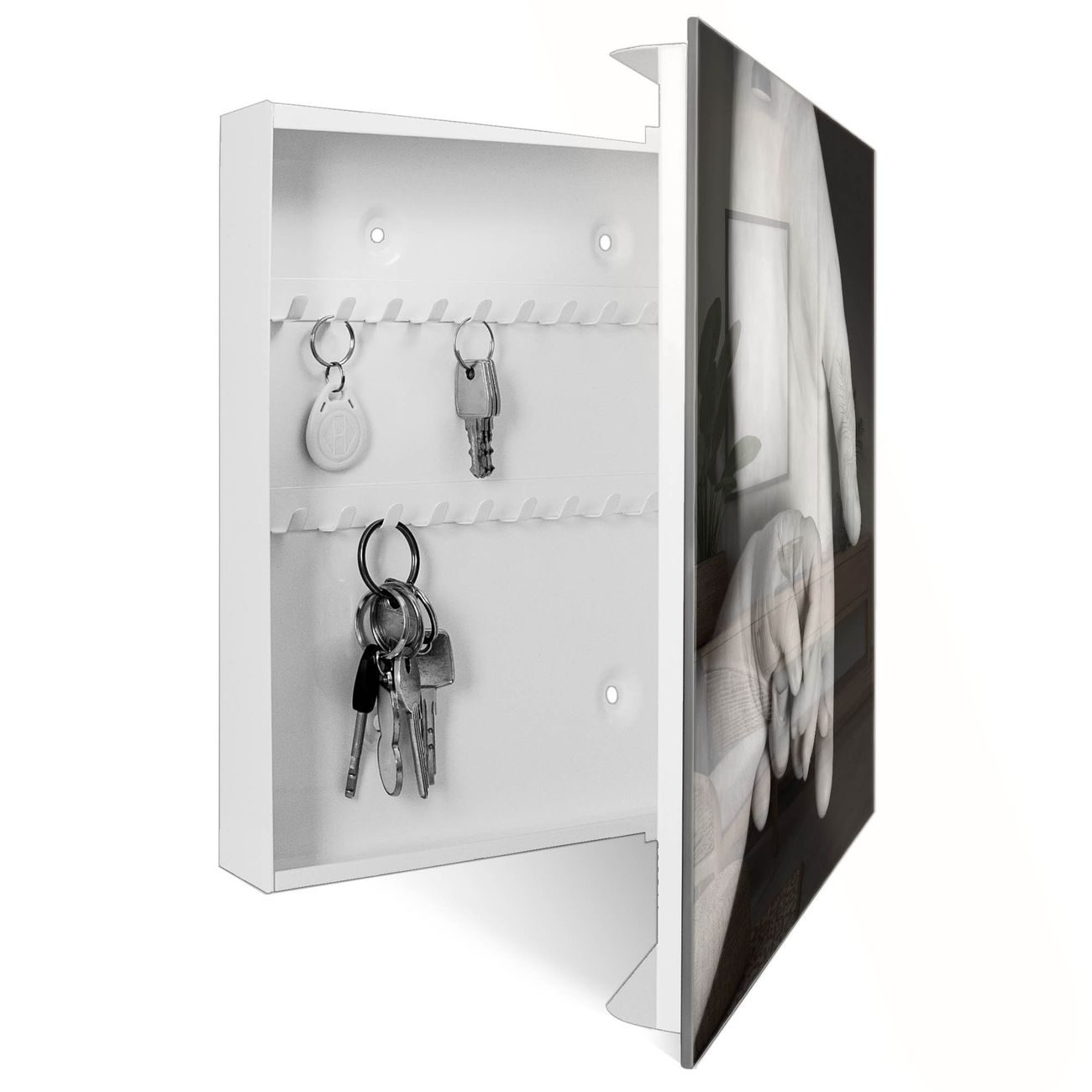 Bringe Ordnung und Eleganz in deinen Eingangsbereich mit dem banjado Schlüsselkasten Motiv Motiv Hands. Die moderne Schlüsselbox kombiniert funktionales Design mit hochwertiger Verarbeitung und wird so zu einem echten Hingucker in Flur, Büro oder Ferienwohnung. ✅ Stilvolle Schlüsselaufbewahrung mit Glasfront im Motiv Motiv Hands Der Design-Schlüsselkasten Motiv Motiv Hands bietet Platz für bis zu 50 Schlüssel, die auf 5 stabilen Reihen mit je 10 Haken übersichtlich verstaut werden. Mit seinen kompakten Maßen von 30 x 30 x 5 cm passt die Schlüsselbox perfekt auch in kleinere Räume. Der weiß lackierte Stahlkorpus mit rechts angeschlagenem Türscharnier harmoniert mit der Glasfront und fügt sich nahtlos in jedes Wohnambiente ein. Ob als Schlüsselorganizer für Zuhause oder als praktische Lösung für Büros, Praxen und Gewerbe, der banjado Schlüsselkasten sorgt für Ordnung und Übersicht. Dank der magnetischen, mit Kreidestiften beschreibbaren Glasfront kannst du Notizen anheften oder Termine direkt auf der Oberfläche festhalten. Die Schlüsselbox Motiv Motiv Hands zur Wandmontage wird inklusive Befestigungsmaterial geliefert und ist schnell angebracht. So hast du deine Schlüssel jederzeit griffbereit und zugleich stilvoll verstaut. Mit diesem banjado Schlüsselkasten Motiv Motiv Hands kombinierst du praktische Aufbewahrung mit stilvollem Wohndesign. Ob privat oder geschäftlich, die Schlüsselbox sorgt für mehr Ordnung, Übersicht und ein wohnliches Ambiente.Vorteile im Überblick