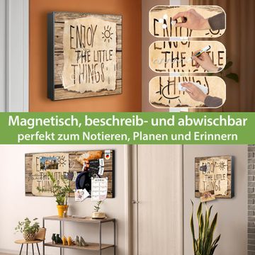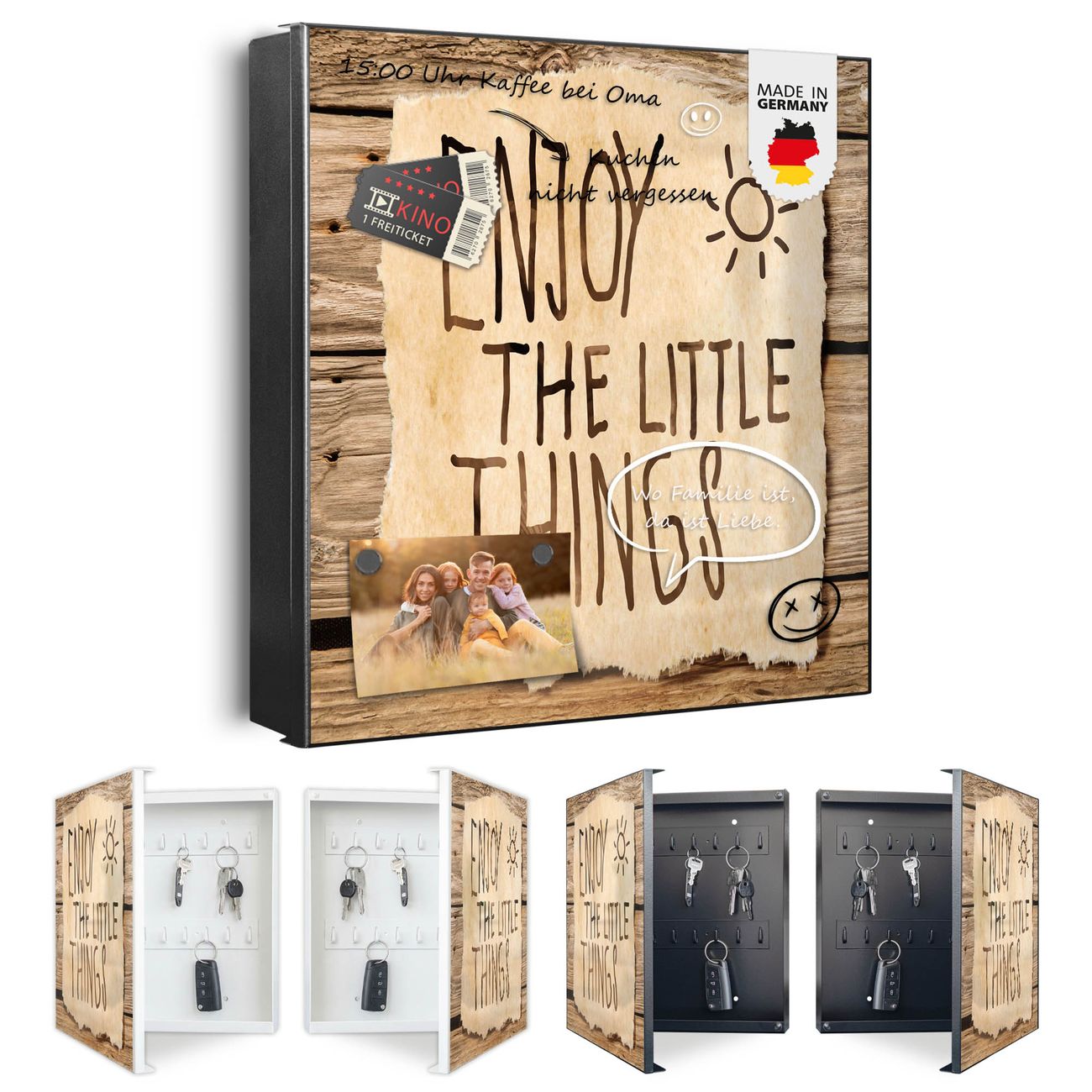 Bringe Ordnung und Eleganz in deinen Eingangsbereich mit dem banjado Schlüsselkasten Motiv Motiv Happy Day. Die moderne Schlüsselbox kombiniert funktionales Design mit hochwertiger Verarbeitung und wird so zu einem echten Hingucker in Flur, Büro oder Ferienwohnung. ✅ Stilvolle Schlüsselaufbewahrung mit Motiv Motiv Happy Day Der Design-Schlüsselkasten Motiv Motiv Happy Day bietet Platz für bis zu 32 Schlüssel, die auf 4 stabilen Reihen mit je 8 Haken übersichtlich verstaut werden. Mit seinen kompakten Maßen von 30 x 30 x 5 cm passt die Schlüsselbox perfekt auch in kleinere Räume. Der schwarz lackierte Stahlkorpus mit rechts angeschlagenem Türscharnier harmoniert mit gedruckten Folie auf der Front und fügt sich nahtlos in jedes Wohnambiente ein. Ob als Schlüsselorganizer für Zuhause oder als praktische Lösung für Büros, Praxen und Gewerbe, der banjado Schlüsselkasten sorgt für Ordnung und Übersicht. Dank der magnetischen, mit Kreidestiften beschreibbaren Folie auf der Front kannst du Notizen anheften oder Termine direkt auf der Oberfläche festhalten. Die Schlüsselbox Motiv Motiv Happy Day zur Wandmontage wird inklusive Befestigungsmaterial geliefert und ist schnell angebracht. So hast du deine Schlüssel jederzeit griffbereit und zugleich stilvoll verstaut. Mit diesem banjado Schlüsselkasten Motiv Motiv Happy Day kombinierst du praktische Aufbewahrung mit stilvollem Wohndesign. Ob privat oder geschäftlich, die Schlüsselbox sorgt für mehr Ordnung, Übersicht und ein wohnliches Ambiente.Vorteile im Überblick