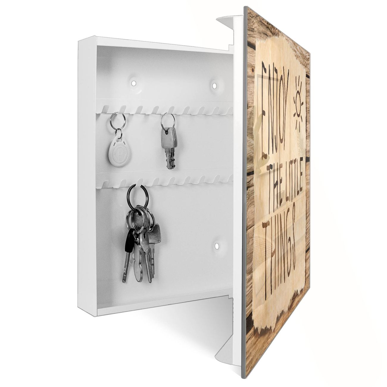Bringe Ordnung und Eleganz in deinen Eingangsbereich mit dem banjado Schlüsselkasten Motiv Motiv Happy Day. Die moderne Schlüsselbox kombiniert funktionales Design mit hochwertiger Verarbeitung und wird so zu einem echten Hingucker in Flur, Büro oder Ferienwohnung. ✅ Stilvolle Schlüsselaufbewahrung mit Glasfront im Motiv Motiv Happy Day Der Design-Schlüsselkasten Motiv Motiv Happy Day bietet Platz für bis zu 50 Schlüssel, die auf 5 stabilen Reihen mit je 10 Haken übersichtlich verstaut werden. Mit seinen kompakten Maßen von 30 x 30 x 5 cm passt die Schlüsselbox perfekt auch in kleinere Räume. Der weiß lackierte Stahlkorpus mit rechts angeschlagenem Türscharnier harmoniert mit der Glasfront und fügt sich nahtlos in jedes Wohnambiente ein. Ob als Schlüsselorganizer für Zuhause oder als praktische Lösung für Büros, Praxen und Gewerbe, der banjado Schlüsselkasten sorgt für Ordnung und Übersicht. Dank der magnetischen, mit Kreidestiften beschreibbaren Glasfront kannst du Notizen anheften oder Termine direkt auf der Oberfläche festhalten. Die Schlüsselbox Motiv Motiv Happy Day zur Wandmontage wird inklusive Befestigungsmaterial geliefert und ist schnell angebracht. So hast du deine Schlüssel jederzeit griffbereit und zugleich stilvoll verstaut. Mit diesem banjado Schlüsselkasten Motiv Motiv Happy Day kombinierst du praktische Aufbewahrung mit stilvollem Wohndesign. Ob privat oder geschäftlich, die Schlüsselbox sorgt für mehr Ordnung, Übersicht und ein wohnliches Ambiente.Vorteile im Überblick