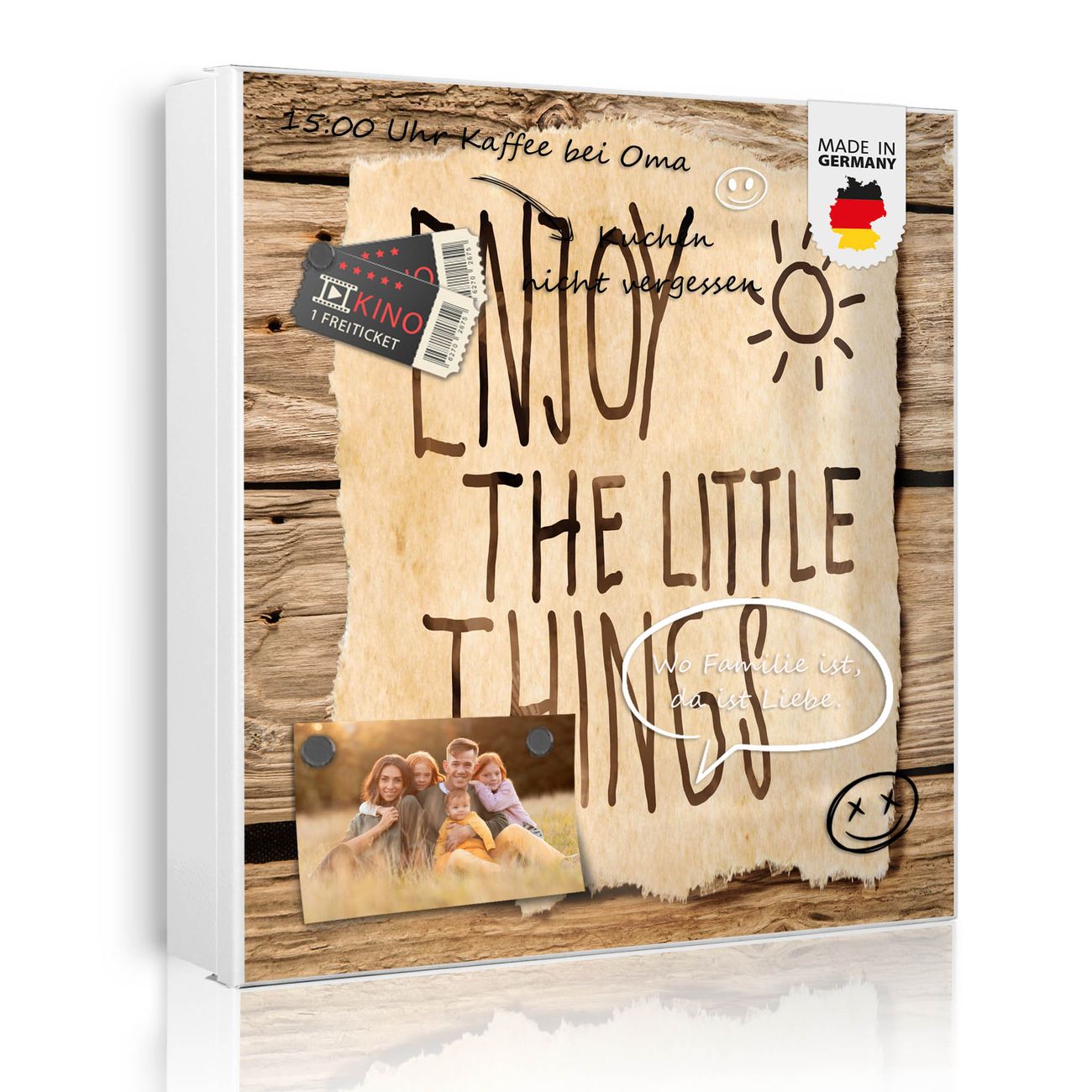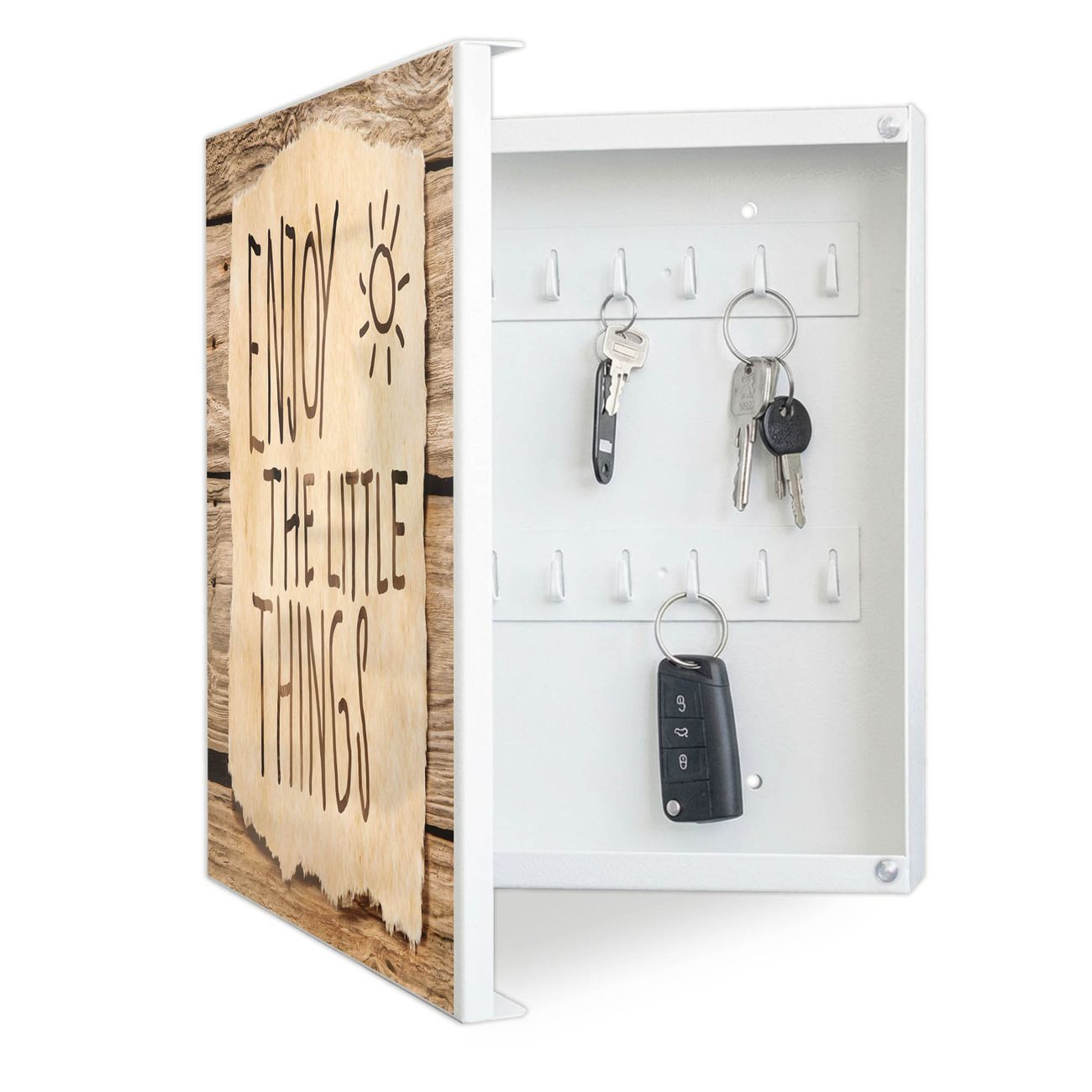 Bringe Ordnung und Eleganz in deinen Eingangsbereich mit dem banjado Schlüsselkasten Motiv Motiv Happy Day. Die moderne Schlüsselbox kombiniert funktionales Design mit hochwertiger Verarbeitung und wird so zu einem echten Hingucker in Flur, Büro oder Ferienwohnung. ✅ Stilvolle Schlüsselaufbewahrung mit Motiv Motiv Happy Day Der Design-Schlüsselkasten Motiv Motiv Happy Day bietet Platz für bis zu 32 Schlüssel, die auf 4 stabilen Reihen mit je 8 Haken übersichtlich verstaut werden. Mit seinen kompakten Maßen von 30 x 30 x 5 cm passt die Schlüsselbox perfekt auch in kleinere Räume. Der weiß lackierte Stahlkorpus mit links angeschlagenem Türscharnier harmoniert mit gedruckten Folie auf der Front und fügt sich nahtlos in jedes Wohnambiente ein. Ob als Schlüsselorganizer für Zuhause oder als praktische Lösung für Büros, Praxen und Gewerbe, der banjado Schlüsselkasten sorgt für Ordnung und Übersicht. Dank der magnetischen, mit Kreidestiften beschreibbaren Folie auf der Front kannst du Notizen anheften oder Termine direkt auf der Oberfläche festhalten. Die Schlüsselbox Motiv Motiv Happy Day zur Wandmontage wird inklusive Befestigungsmaterial geliefert und ist schnell angebracht. So hast du deine Schlüssel jederzeit griffbereit und zugleich stilvoll verstaut. Mit diesem banjado Schlüsselkasten Motiv Motiv Happy Day kombinierst du praktische Aufbewahrung mit stilvollem Wohndesign. Ob privat oder geschäftlich, die Schlüsselbox sorgt für mehr Ordnung, Übersicht und ein wohnliches Ambiente.Vorteile im Überblick