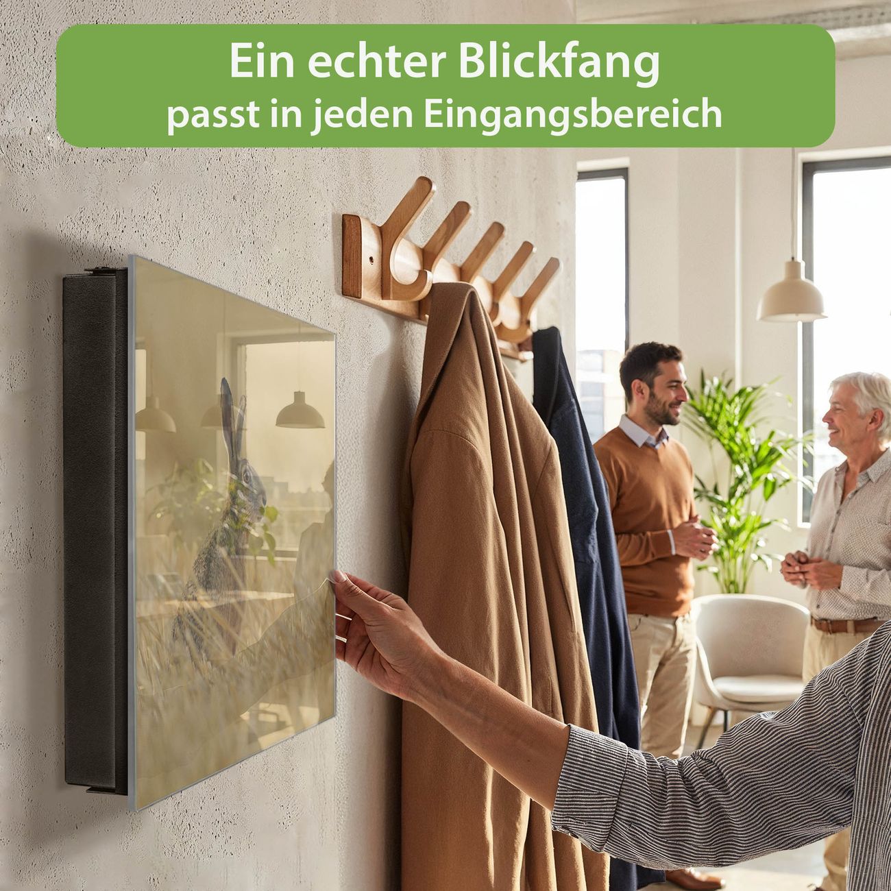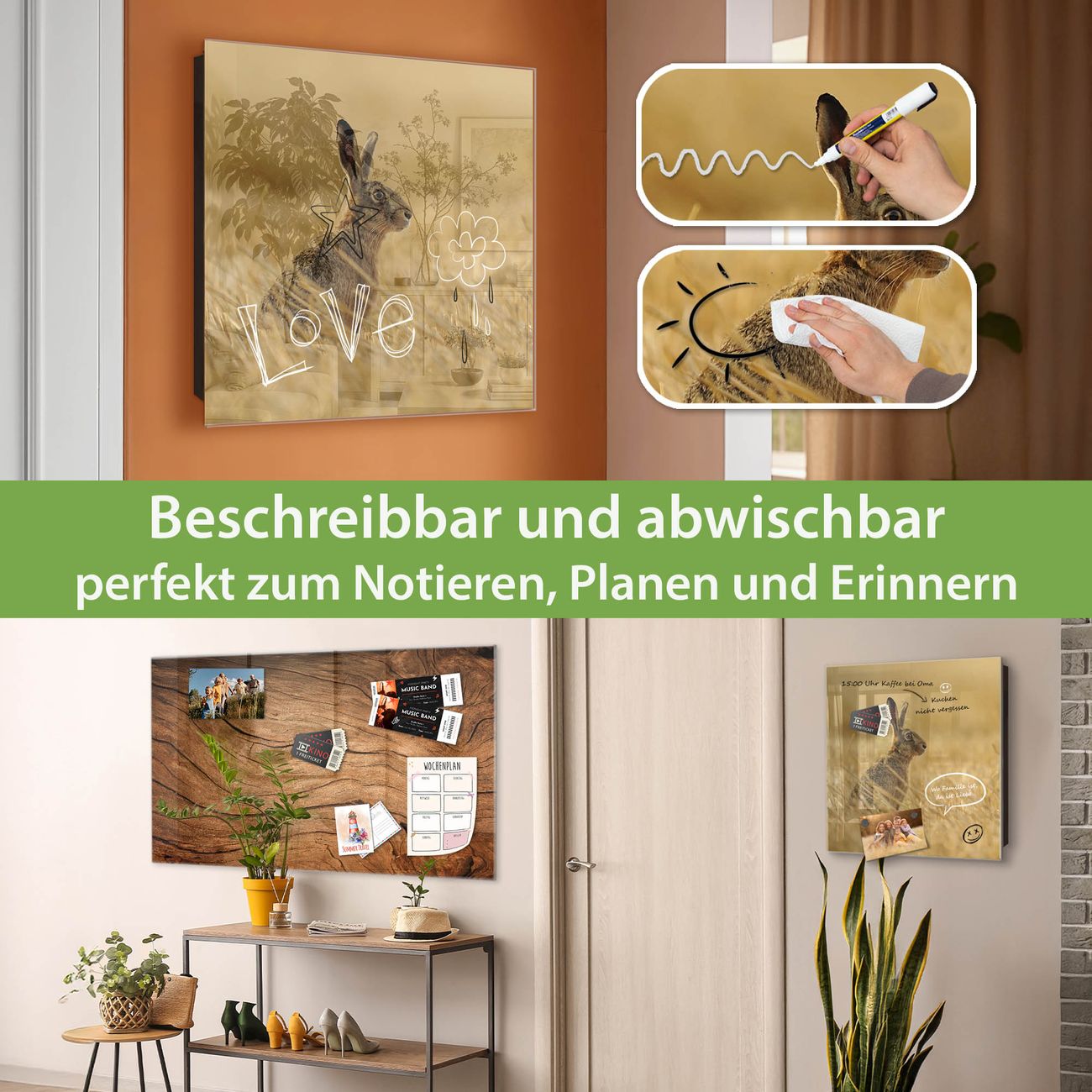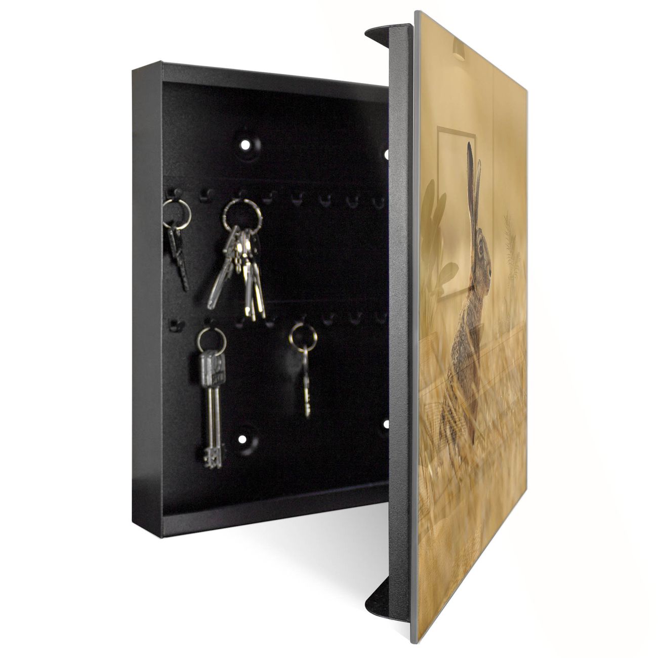 Bringe Ordnung und Eleganz in deinen Eingangsbereich mit dem banjado Schlüsselkasten Motiv Motiv Hase. Die moderne Schlüsselbox kombiniert funktionales Design mit hochwertiger Verarbeitung und wird so zu einem echten Hingucker in Flur, Büro oder Ferienwohnung. ✅ Stilvolle Schlüsselaufbewahrung mit Glasfront im Motiv Motiv Hase Der Design-Schlüsselkasten Motiv Motiv Hase bietet Platz für bis zu 50 Schlüssel, die auf 5 stabilen Reihen mit je 10 Haken übersichtlich verstaut werden. Mit seinen kompakten Maßen von 30 x 30 x 5 cm passt die Schlüsselbox perfekt auch in kleinere Räume. Der schwarz lackierte Stahlkorpus mit rechts angeschlagenem Türscharnier harmoniert mit der Glasfront und fügt sich nahtlos in jedes Wohnambiente ein. Ob als Schlüsselorganizer für Zuhause oder als praktische Lösung für Büros, Praxen und Gewerbe, der banjado Schlüsselkasten sorgt für Ordnung und Übersicht. Dank der magnetischen, mit Kreidestiften beschreibbaren Glasfront kannst du Notizen anheften oder Termine direkt auf der Oberfläche festhalten. Die Schlüsselbox Motiv Motiv Hase zur Wandmontage wird inklusive Befestigungsmaterial geliefert und ist schnell angebracht. So hast du deine Schlüssel jederzeit griffbereit und zugleich stilvoll verstaut. Mit diesem banjado Schlüsselkasten Motiv Motiv Hase kombinierst du praktische Aufbewahrung mit stilvollem Wohndesign. Ob privat oder geschäftlich, die Schlüsselbox sorgt für mehr Ordnung, Übersicht und ein wohnliches Ambiente.Vorteile im Überblick