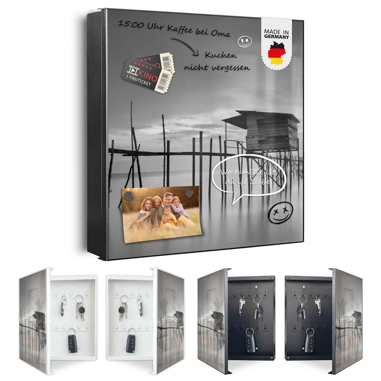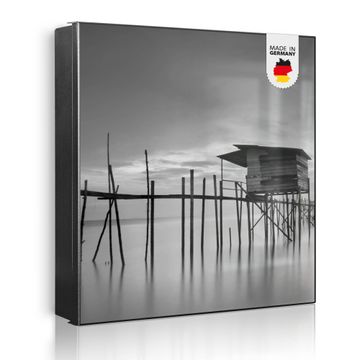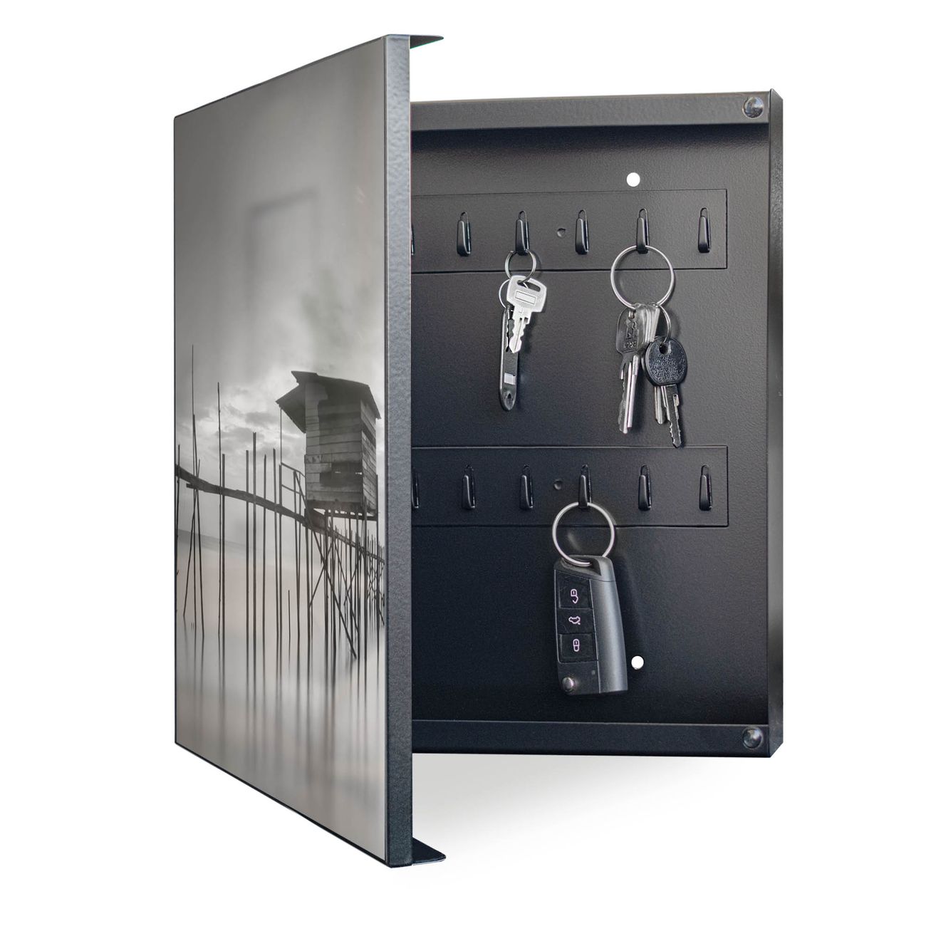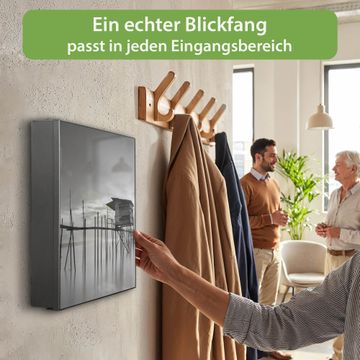 Bringe Ordnung und Eleganz in deinen Eingangsbereich mit dem banjado Schlüsselkasten Motiv Motiv Haus am See. Die moderne Schlüsselbox kombiniert funktionales Design mit hochwertiger Verarbeitung und wird so zu einem echten Hingucker in Flur, Büro oder Ferienwohnung. ✅ Stilvolle Schlüsselaufbewahrung mit Motiv Motiv Haus am See Der Design-Schlüsselkasten Motiv Motiv Haus am See bietet Platz für bis zu 32 Schlüssel, die auf 4 stabilen Reihen mit je 8 Haken übersichtlich verstaut werden. Mit seinen kompakten Maßen von 30 x 30 x 5 cm passt die Schlüsselbox perfekt auch in kleinere Räume. Der schwarz lackierte Stahlkorpus mit links angeschlagenem Türscharnier harmoniert mit gedruckten Folie auf der Front und fügt sich nahtlos in jedes Wohnambiente ein. Ob als Schlüsselorganizer für Zuhause oder als praktische Lösung für Büros, Praxen und Gewerbe, der banjado Schlüsselkasten sorgt für Ordnung und Übersicht. Dank der magnetischen, mit Kreidestiften beschreibbaren Folie auf der Front kannst du Notizen anheften oder Termine direkt auf der Oberfläche festhalten. Die Schlüsselbox Motiv Motiv Haus am See zur Wandmontage wird inklusive Befestigungsmaterial geliefert und ist schnell angebracht. So hast du deine Schlüssel jederzeit griffbereit und zugleich stilvoll verstaut. Mit diesem banjado Schlüsselkasten Motiv Motiv Haus am See kombinierst du praktische Aufbewahrung mit stilvollem Wohndesign. Ob privat oder geschäftlich, die Schlüsselbox sorgt für mehr Ordnung, Übersicht und ein wohnliches Ambiente.Vorteile im Überblick