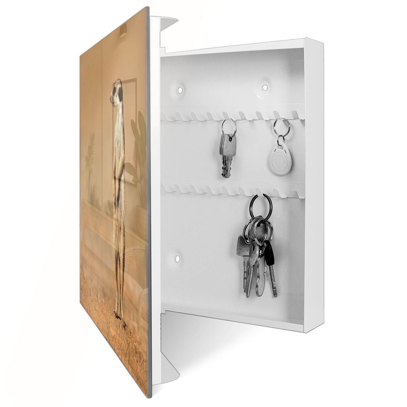 Bringe Ordnung und Eleganz in deinen Eingangsbereich mit dem banjado Schlüsselkasten Motiv Motiv Henryk 2. Die moderne Schlüsselbox kombiniert funktionales Design mit hochwertiger Verarbeitung und wird so zu einem echten Hingucker in Flur, Büro oder Ferienwohnung. ✅ Stilvolle Schlüsselaufbewahrung mit Glasfront im Motiv Motiv Henryk 2 Der Design-Schlüsselkasten Motiv Motiv Henryk 2 bietet Platz für bis zu 50 Schlüssel, die auf 5 stabilen Reihen mit je 10 Haken übersichtlich verstaut werden. Mit seinen kompakten Maßen von 30 x 30 x 5 cm passt die Schlüsselbox perfekt auch in kleinere Räume. Der weiß lackierte Stahlkorpus mit rechts angeschlagenem Türscharnier harmoniert mit der Glasfront und fügt sich nahtlos in jedes Wohnambiente ein. Ob als Schlüsselorganizer für Zuhause oder als praktische Lösung für Büros, Praxen und Gewerbe, der banjado Schlüsselkasten sorgt für Ordnung und Übersicht. Dank der magnetischen, mit Kreidestiften beschreibbaren Glasfront kannst du Notizen anheften oder Termine direkt auf der Oberfläche festhalten. Die Schlüsselbox Motiv Motiv Henryk 2 zur Wandmontage wird inklusive Befestigungsmaterial geliefert und ist schnell angebracht. So hast du deine Schlüssel jederzeit griffbereit und zugleich stilvoll verstaut. Mit diesem banjado Schlüsselkasten Motiv Motiv Henryk 2 kombinierst du praktische Aufbewahrung mit stilvollem Wohndesign. Ob privat oder geschäftlich, die Schlüsselbox sorgt für mehr Ordnung, Übersicht und ein wohnliches Ambiente.Vorteile im Überblick