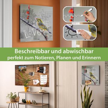 Bringe Ordnung und Eleganz in deinen Eingangsbereich mit dem banjado Schlüsselkasten Motiv Motiv Herbst Vogel. Die moderne Schlüsselbox kombiniert funktionales Design mit hochwertiger Verarbeitung und wird so zu einem echten Hingucker in Flur, Büro oder Ferienwohnung. ✅ Stilvolle Schlüsselaufbewahrung mit Glasfront im Motiv Motiv Herbst Vogel Der Design-Schlüsselkasten Motiv Motiv Herbst Vogel bietet Platz für bis zu 50 Schlüssel, die auf 5 stabilen Reihen mit je 10 Haken übersichtlich verstaut werden. Mit seinen kompakten Maßen von 30 x 30 x 5 cm passt die Schlüsselbox perfekt auch in kleinere Räume. Der schwarz lackierte Stahlkorpus mit rechts angeschlagenem Türscharnier harmoniert mit der Glasfront und fügt sich nahtlos in jedes Wohnambiente ein. Ob als Schlüsselorganizer für Zuhause oder als praktische Lösung für Büros, Praxen und Gewerbe, der banjado Schlüsselkasten sorgt für Ordnung und Übersicht. Dank der magnetischen, mit Kreidestiften beschreibbaren Glasfront kannst du Notizen anheften oder Termine direkt auf der Oberfläche festhalten. Die Schlüsselbox Motiv Motiv Herbst Vogel zur Wandmontage wird inklusive Befestigungsmaterial geliefert und ist schnell angebracht. So hast du deine Schlüssel jederzeit griffbereit und zugleich stilvoll verstaut. Mit diesem banjado Schlüsselkasten Motiv Motiv Herbst Vogel kombinierst du praktische Aufbewahrung mit stilvollem Wohndesign. Ob privat oder geschäftlich, die Schlüsselbox sorgt für mehr Ordnung, Übersicht und ein wohnliches Ambiente.Vorteile im Überblick