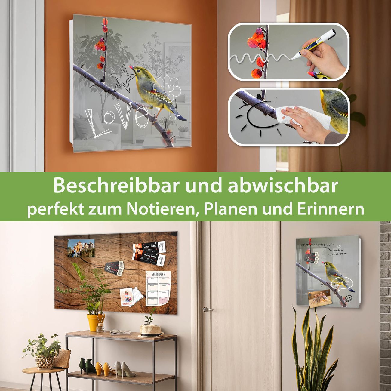 ✅ Magnetisch und mit Kreidestift beschreibbar, gehärtetes Glas, links angeschlagene TürOrdnung und Design in einem