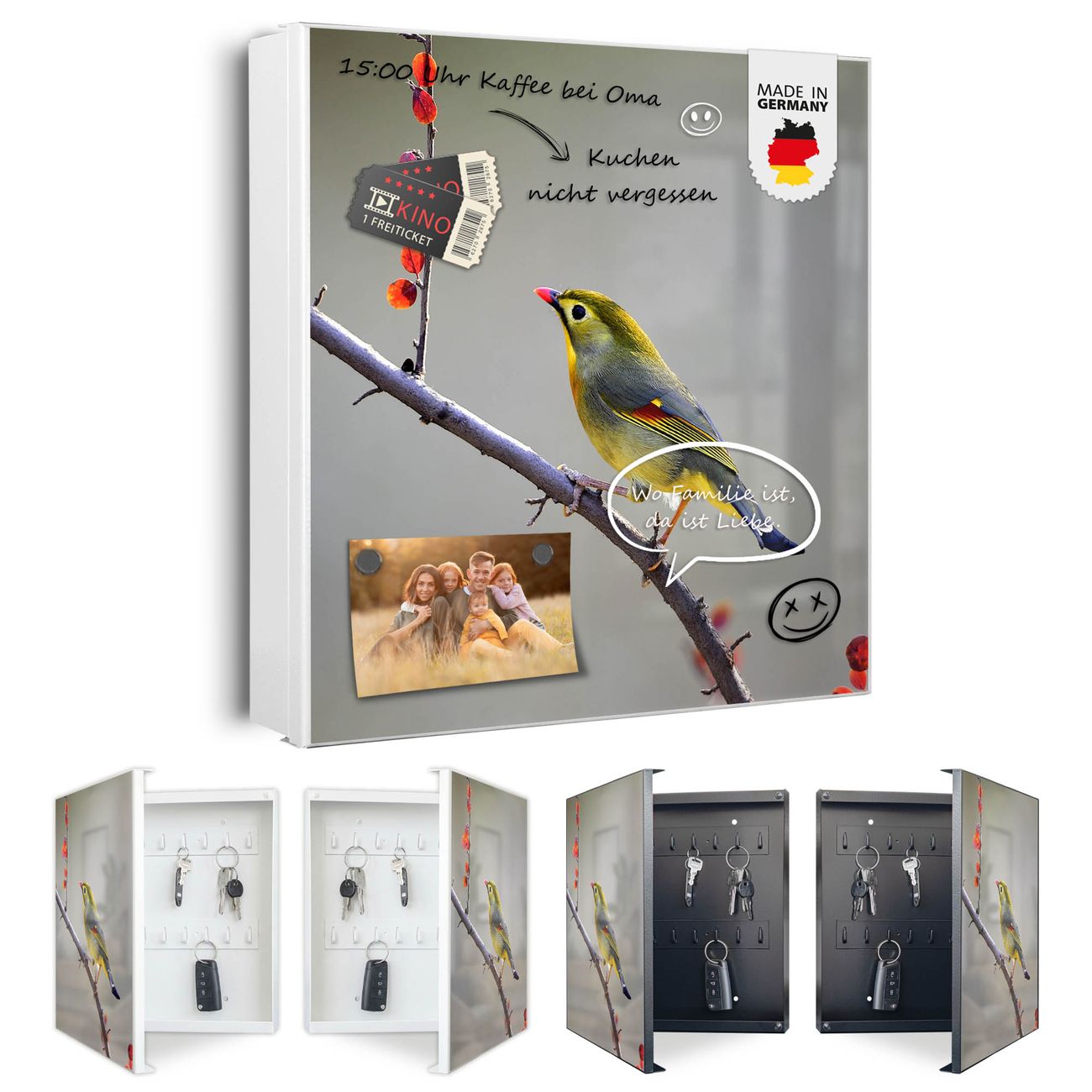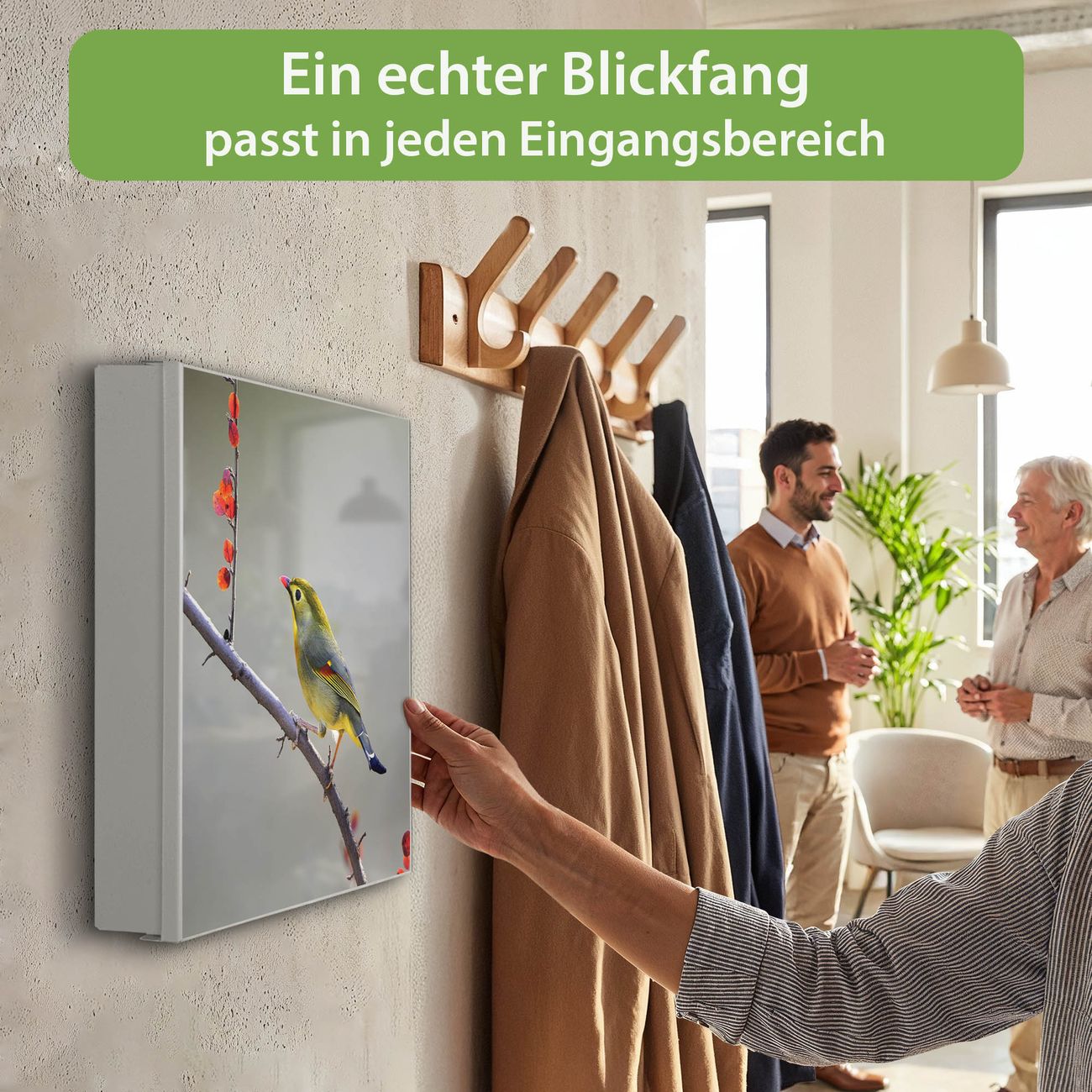 Bringe Ordnung und Eleganz in deinen Eingangsbereich mit dem banjado Schlüsselkasten Motiv Motiv Herbst Vogel. Die moderne Schlüsselbox kombiniert funktionales Design mit hochwertiger Verarbeitung und wird so zu einem echten Hingucker in Flur, Büro oder Ferienwohnung. ✅ Stilvolle Schlüsselaufbewahrung mit Motiv Motiv Herbst Vogel Der Design-Schlüsselkasten Motiv Motiv Herbst Vogel bietet Platz für bis zu 32 Schlüssel, die auf 4 stabilen Reihen mit je 8 Haken übersichtlich verstaut werden. Mit seinen kompakten Maßen von 30 x 30 x 5 cm passt die Schlüsselbox perfekt auch in kleinere Räume. Der weiß lackierte Stahlkorpus mit links angeschlagenem Türscharnier harmoniert mit gedruckten Folie auf der Front und fügt sich nahtlos in jedes Wohnambiente ein. Ob als Schlüsselorganizer für Zuhause oder als praktische Lösung für Büros, Praxen und Gewerbe, der banjado Schlüsselkasten sorgt für Ordnung und Übersicht. Dank der magnetischen, mit Kreidestiften beschreibbaren Folie auf der Front kannst du Notizen anheften oder Termine direkt auf der Oberfläche festhalten. Die Schlüsselbox Motiv Motiv Herbst Vogel zur Wandmontage wird inklusive Befestigungsmaterial geliefert und ist schnell angebracht. So hast du deine Schlüssel jederzeit griffbereit und zugleich stilvoll verstaut. Mit diesem banjado Schlüsselkasten Motiv Motiv Herbst Vogel kombinierst du praktische Aufbewahrung mit stilvollem Wohndesign. Ob privat oder geschäftlich, die Schlüsselbox sorgt für mehr Ordnung, Übersicht und ein wohnliches Ambiente.Vorteile im Überblick