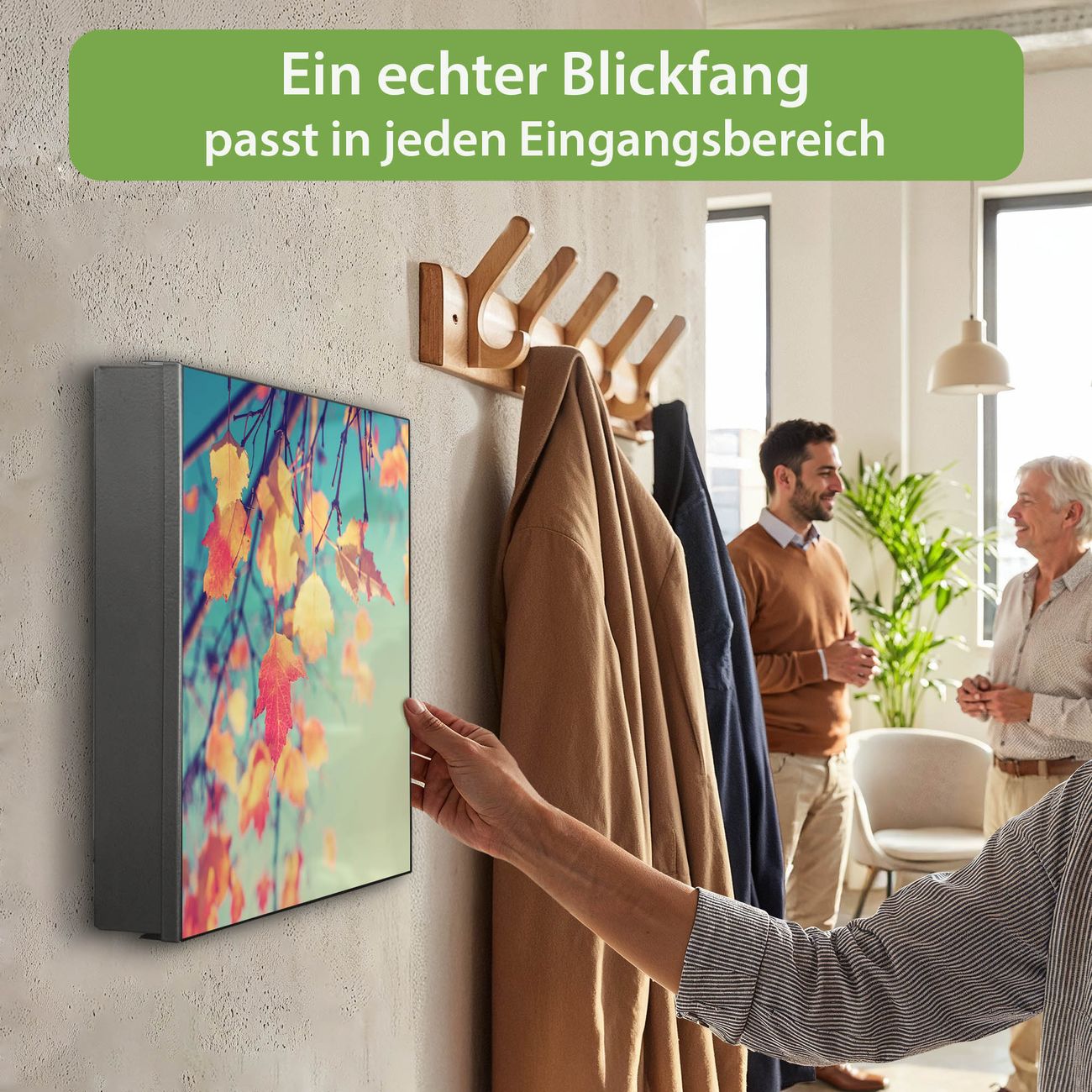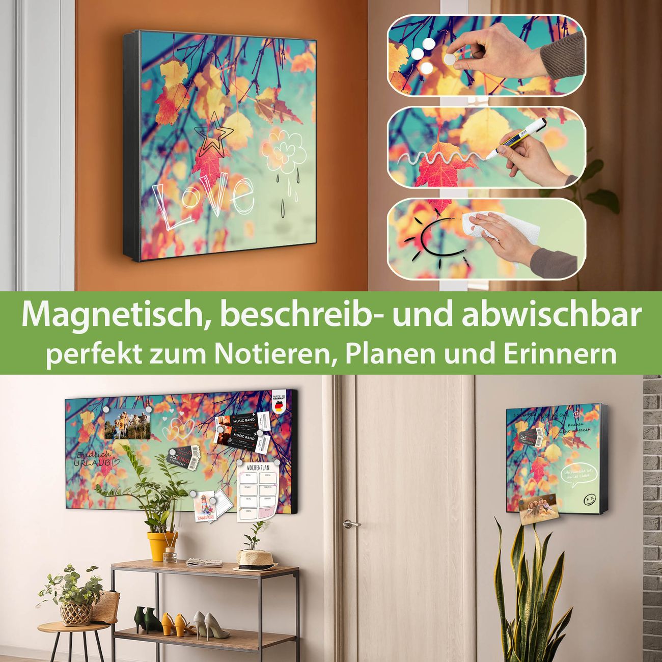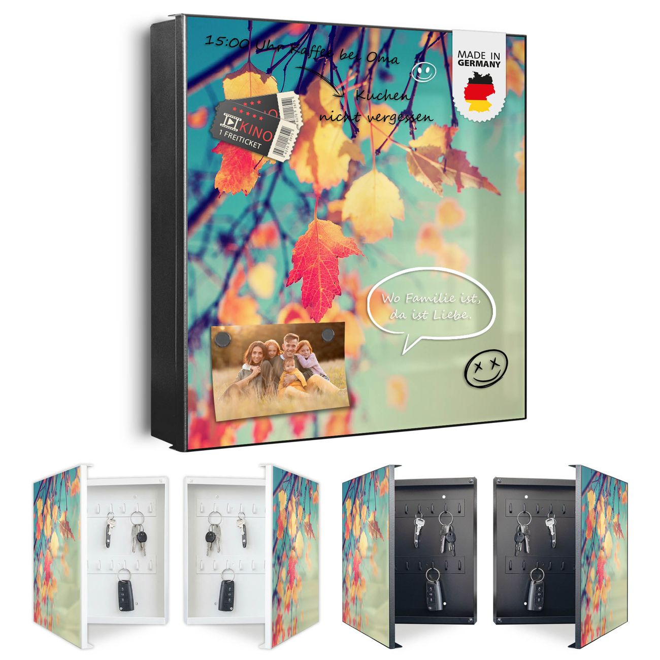 Bringe Ordnung und Eleganz in deinen Eingangsbereich mit dem banjado Schlüsselkasten Motiv Motiv Herbst. Die moderne Schlüsselbox kombiniert funktionales Design mit hochwertiger Verarbeitung und wird so zu einem echten Hingucker in Flur, Büro oder Ferienwohnung. ✅ Stilvolle Schlüsselaufbewahrung mit Motiv Motiv Herbst Der Design-Schlüsselkasten Motiv Motiv Herbst bietet Platz für bis zu 32 Schlüssel, die auf 4 stabilen Reihen mit je 8 Haken übersichtlich verstaut werden. Mit seinen kompakten Maßen von 30 x 30 x 5 cm passt die Schlüsselbox perfekt auch in kleinere Räume. Der schwarz lackierte Stahlkorpus mit rechts angeschlagenem Türscharnier harmoniert mit gedruckten Folie auf der Front und fügt sich nahtlos in jedes Wohnambiente ein. Ob als Schlüsselorganizer für Zuhause oder als praktische Lösung für Büros, Praxen und Gewerbe, der banjado Schlüsselkasten sorgt für Ordnung und Übersicht. Dank der magnetischen, mit Kreidestiften beschreibbaren Folie auf der Front kannst du Notizen anheften oder Termine direkt auf der Oberfläche festhalten. Die Schlüsselbox Motiv Motiv Herbst zur Wandmontage wird inklusive Befestigungsmaterial geliefert und ist schnell angebracht. So hast du deine Schlüssel jederzeit griffbereit und zugleich stilvoll verstaut. Mit diesem banjado Schlüsselkasten Motiv Motiv Herbst kombinierst du praktische Aufbewahrung mit stilvollem Wohndesign. Ob privat oder geschäftlich, die Schlüsselbox sorgt für mehr Ordnung, Übersicht und ein wohnliches Ambiente.Vorteile im Überblick