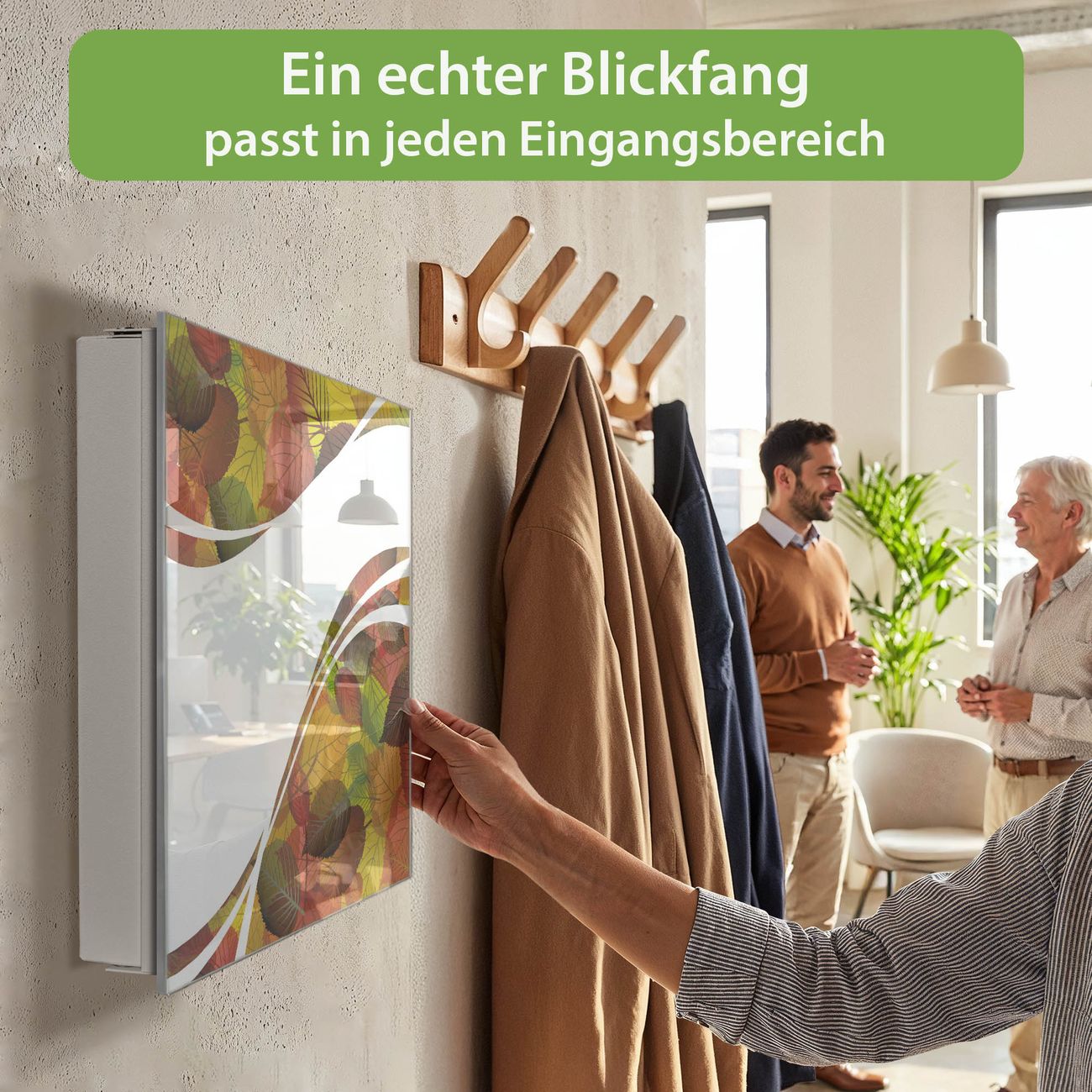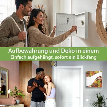 Bringe Ordnung und Eleganz in deinen Eingangsbereich mit dem banjado Schlüsselkasten Motiv Motiv Herbstlaub. Die moderne Schlüsselbox kombiniert funktionales Design mit hochwertiger Verarbeitung und wird so zu einem echten Hingucker in Flur, Büro oder Ferienwohnung. ✅ Stilvolle Schlüsselaufbewahrung mit Glasfront im Motiv Motiv Herbstlaub Der Design-Schlüsselkasten Motiv Motiv Herbstlaub bietet Platz für bis zu 50 Schlüssel, die auf 5 stabilen Reihen mit je 10 Haken übersichtlich verstaut werden. Mit seinen kompakten Maßen von 30 x 30 x 5 cm passt die Schlüsselbox perfekt auch in kleinere Räume. Der weiß lackierte Stahlkorpus mit rechts angeschlagenem Türscharnier harmoniert mit der Glasfront und fügt sich nahtlos in jedes Wohnambiente ein. Ob als Schlüsselorganizer für Zuhause oder als praktische Lösung für Büros, Praxen und Gewerbe, der banjado Schlüsselkasten sorgt für Ordnung und Übersicht. Dank der magnetischen, mit Kreidestiften beschreibbaren Glasfront kannst du Notizen anheften oder Termine direkt auf der Oberfläche festhalten. Die Schlüsselbox Motiv Motiv Herbstlaub zur Wandmontage wird inklusive Befestigungsmaterial geliefert und ist schnell angebracht. So hast du deine Schlüssel jederzeit griffbereit und zugleich stilvoll verstaut. Mit diesem banjado Schlüsselkasten Motiv Motiv Herbstlaub kombinierst du praktische Aufbewahrung mit stilvollem Wohndesign. Ob privat oder geschäftlich, die Schlüsselbox sorgt für mehr Ordnung, Übersicht und ein wohnliches Ambiente.Vorteile im Überblick