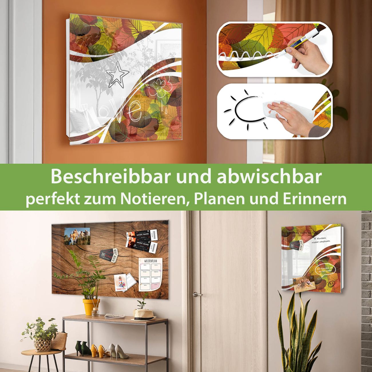 ✅ Magnetisch und mit Kreidestift beschreibbar, gehärtetes Glas, links angeschlagene TürOrdnung und Design in einem