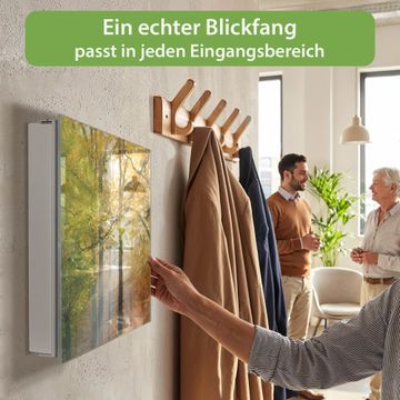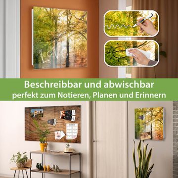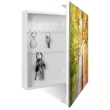 Bringe Ordnung und Eleganz in deinen Eingangsbereich mit dem banjado Schlüsselkasten Motiv Motiv Herbstwald. Die moderne Schlüsselbox kombiniert funktionales Design mit hochwertiger Verarbeitung und wird so zu einem echten Hingucker in Flur, Büro oder Ferienwohnung. ✅ Stilvolle Schlüsselaufbewahrung mit Glasfront im Motiv Motiv Herbstwald Der Design-Schlüsselkasten Motiv Motiv Herbstwald bietet Platz für bis zu 50 Schlüssel, die auf 5 stabilen Reihen mit je 10 Haken übersichtlich verstaut werden. Mit seinen kompakten Maßen von 30 x 30 x 5 cm passt die Schlüsselbox perfekt auch in kleinere Räume. Der weiß lackierte Stahlkorpus mit rechts angeschlagenem Türscharnier harmoniert mit der Glasfront und fügt sich nahtlos in jedes Wohnambiente ein. Ob als Schlüsselorganizer für Zuhause oder als praktische Lösung für Büros, Praxen und Gewerbe, der banjado Schlüsselkasten sorgt für Ordnung und Übersicht. Dank der magnetischen, mit Kreidestiften beschreibbaren Glasfront kannst du Notizen anheften oder Termine direkt auf der Oberfläche festhalten. Die Schlüsselbox Motiv Motiv Herbstwald zur Wandmontage wird inklusive Befestigungsmaterial geliefert und ist schnell angebracht. So hast du deine Schlüssel jederzeit griffbereit und zugleich stilvoll verstaut. Mit diesem banjado Schlüsselkasten Motiv Motiv Herbstwald kombinierst du praktische Aufbewahrung mit stilvollem Wohndesign. Ob privat oder geschäftlich, die Schlüsselbox sorgt für mehr Ordnung, Übersicht und ein wohnliches Ambiente.Vorteile im Überblick