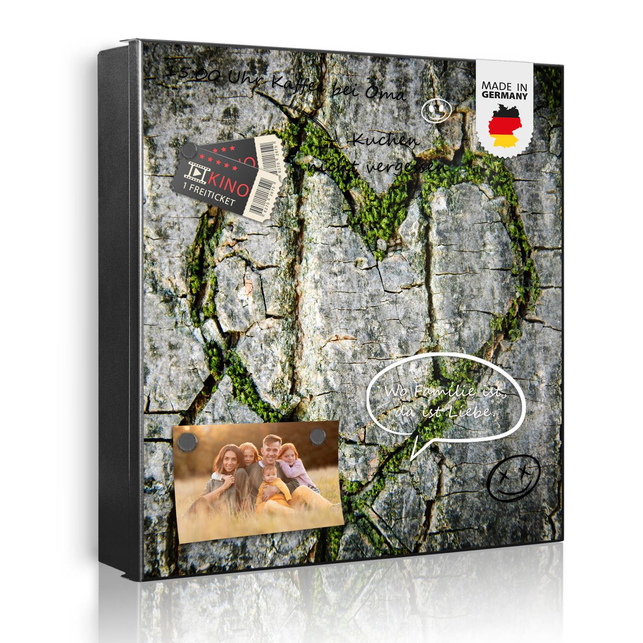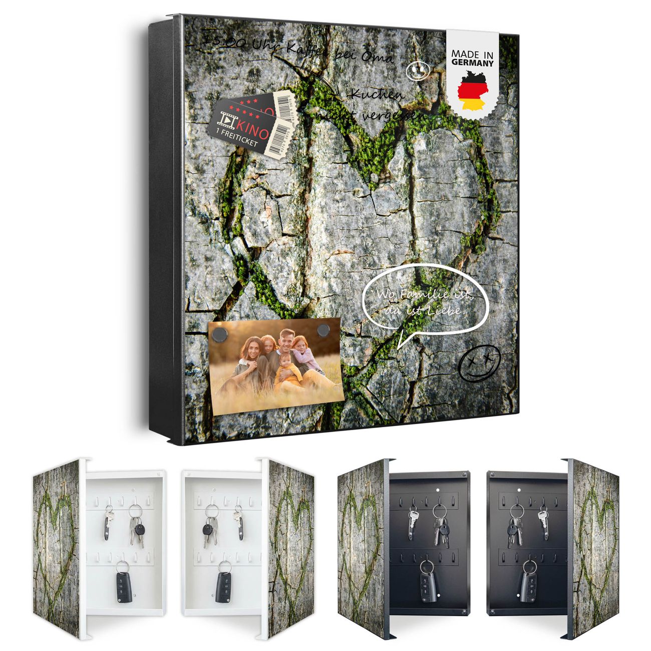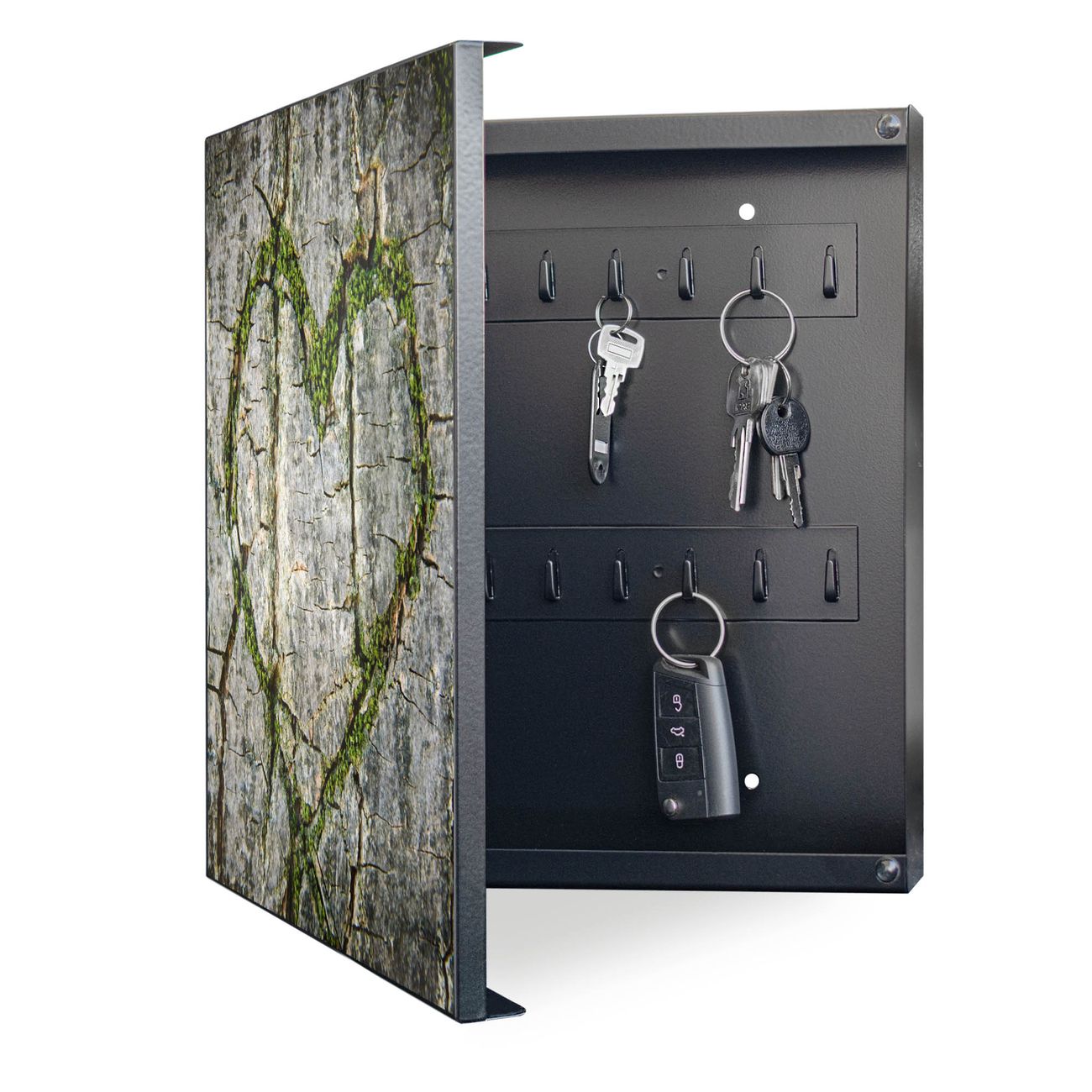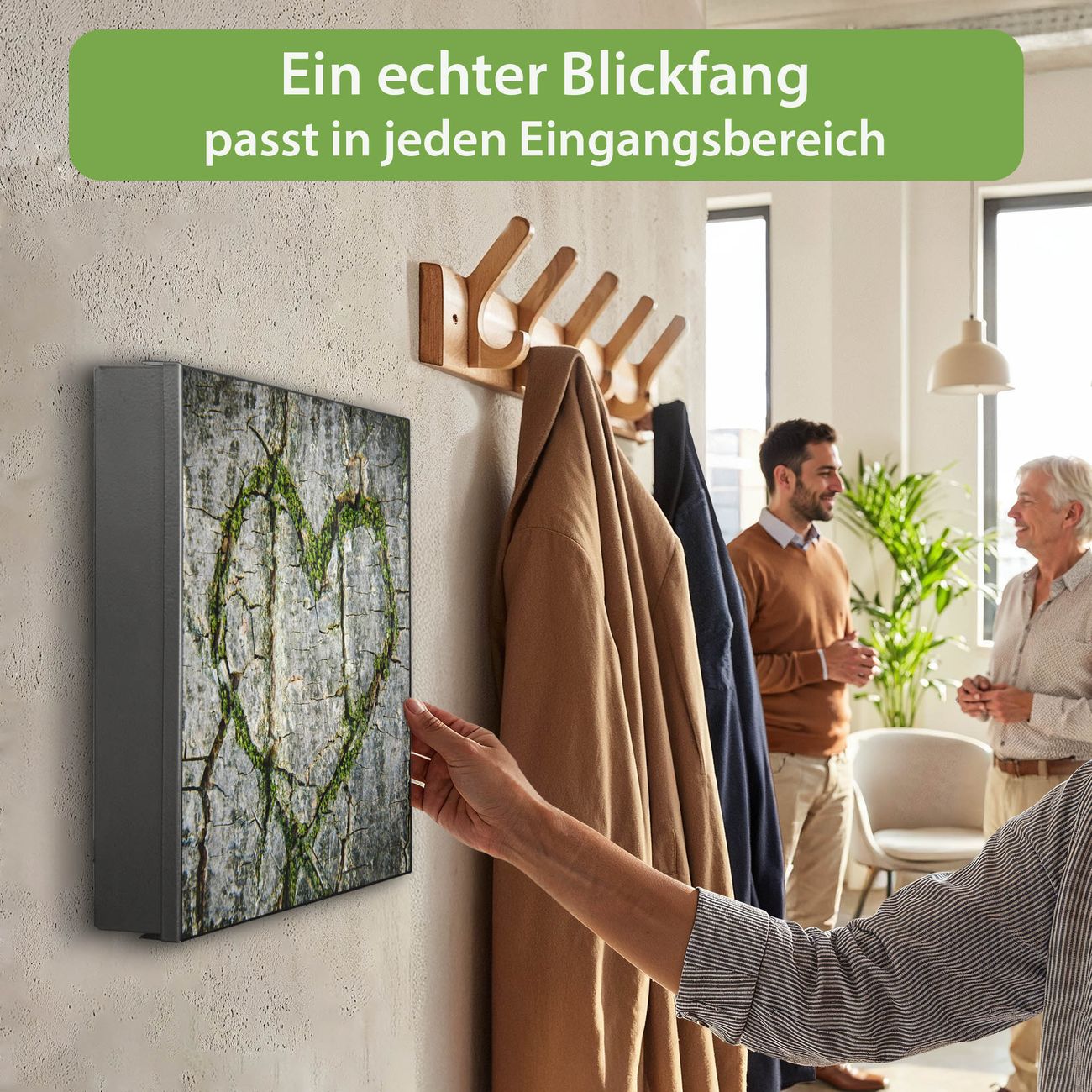 Bringe Ordnung und Eleganz in deinen Eingangsbereich mit dem banjado Schlüsselkasten Motiv Motiv Herz Aus Moos . Die moderne Schlüsselbox kombiniert funktionales Design mit hochwertiger Verarbeitung und wird so zu einem echten Hingucker in Flur, Büro oder Ferienwohnung. ✅ Stilvolle Schlüsselaufbewahrung mit Motiv Motiv Herz Aus Moos Der Design-Schlüsselkasten Motiv Motiv Herz Aus Moos bietet Platz für bis zu 32 Schlüssel, die auf 4 stabilen Reihen mit je 8 Haken übersichtlich verstaut werden. Mit seinen kompakten Maßen von 30 x 30 x 5 cm passt die Schlüsselbox perfekt auch in kleinere Räume. Der schwarz lackierte Stahlkorpus mit links angeschlagenem Türscharnier harmoniert mit gedruckten Folie auf der Front und fügt sich nahtlos in jedes Wohnambiente ein. Ob als Schlüsselorganizer für Zuhause oder als praktische Lösung für Büros, Praxen und Gewerbe, der banjado Schlüsselkasten sorgt für Ordnung und Übersicht. Dank der magnetischen, mit Kreidestiften beschreibbaren Folie auf der Front kannst du Notizen anheften oder Termine direkt auf der Oberfläche festhalten. Die Schlüsselbox Motiv Motiv Herz Aus Moos zur Wandmontage wird inklusive Befestigungsmaterial geliefert und ist schnell angebracht. So hast du deine Schlüssel jederzeit griffbereit und zugleich stilvoll verstaut. Mit diesem banjado Schlüsselkasten Motiv Motiv Herz Aus Moos kombinierst du praktische Aufbewahrung mit stilvollem Wohndesign. Ob privat oder geschäftlich, die Schlüsselbox sorgt für mehr Ordnung, Übersicht und ein wohnliches Ambiente.Vorteile im Überblick