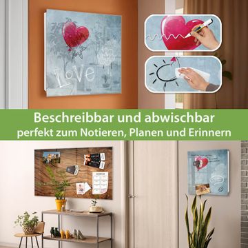 Bringe Ordnung und Eleganz in deinen Eingangsbereich mit dem banjado Schlüsselkasten Motiv Motiv Herzballon. Die moderne Schlüsselbox kombiniert funktionales Design mit hochwertiger Verarbeitung und wird so zu einem echten Hingucker in Flur, Büro oder Ferienwohnung. ✅ Stilvolle Schlüsselaufbewahrung mit Glasfront im Motiv Motiv Herzballon Der Design-Schlüsselkasten Motiv Motiv Herzballon bietet Platz für bis zu 50 Schlüssel, die auf 5 stabilen Reihen mit je 10 Haken übersichtlich verstaut werden. Mit seinen kompakten Maßen von 30 x 30 x 5 cm passt die Schlüsselbox perfekt auch in kleinere Räume. Der weiß lackierte Stahlkorpus mit rechts angeschlagenem Türscharnier harmoniert mit der Glasfront und fügt sich nahtlos in jedes Wohnambiente ein. Ob als Schlüsselorganizer für Zuhause oder als praktische Lösung für Büros, Praxen und Gewerbe, der banjado Schlüsselkasten sorgt für Ordnung und Übersicht. Dank der magnetischen, mit Kreidestiften beschreibbaren Glasfront kannst du Notizen anheften oder Termine direkt auf der Oberfläche festhalten. Die Schlüsselbox Motiv Motiv Herzballon zur Wandmontage wird inklusive Befestigungsmaterial geliefert und ist schnell angebracht. So hast du deine Schlüssel jederzeit griffbereit und zugleich stilvoll verstaut. Mit diesem banjado Schlüsselkasten Motiv Motiv Herzballon kombinierst du praktische Aufbewahrung mit stilvollem Wohndesign. Ob privat oder geschäftlich, die Schlüsselbox sorgt für mehr Ordnung, Übersicht und ein wohnliches Ambiente.Vorteile im Überblick