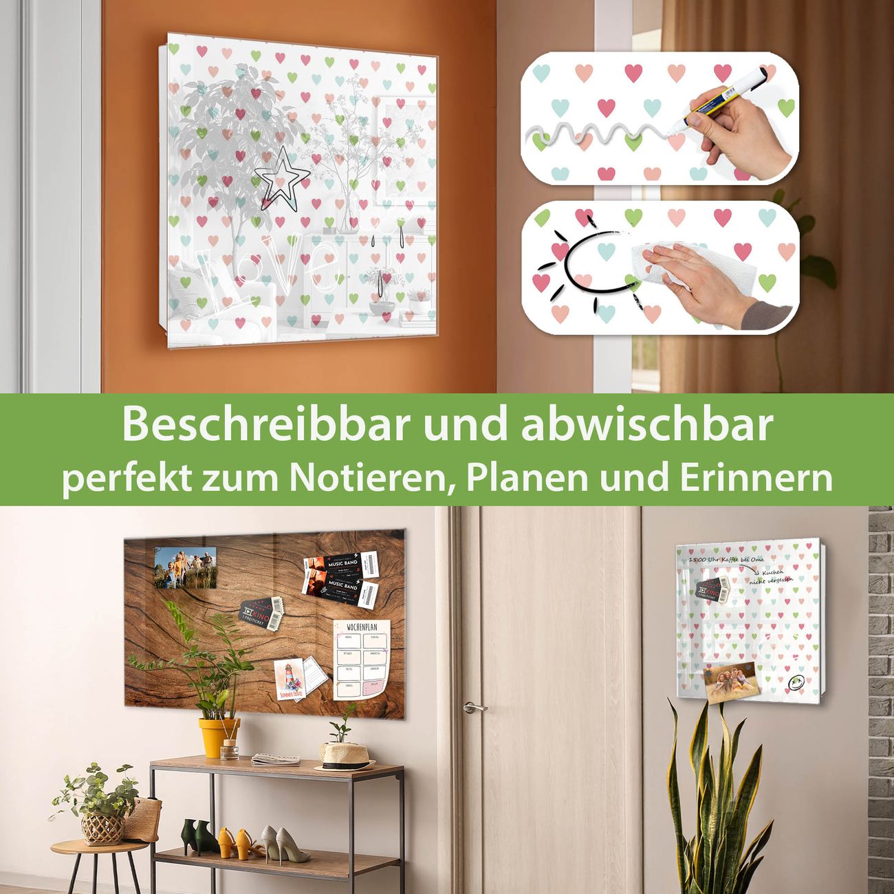Bringe Ordnung und Eleganz in deinen Eingangsbereich mit dem banjado Schlüsselkasten Motiv Motiv Herzen Auf Weiß. Die moderne Schlüsselbox kombiniert funktionales Design mit hochwertiger Verarbeitung und wird so zu einem echten Hingucker in Flur, Büro oder Ferienwohnung. ✅ Stilvolle Schlüsselaufbewahrung mit Glasfront im Motiv Motiv Herzen Auf Weiß Der Design-Schlüsselkasten Motiv Motiv Herzen Auf Weiß bietet Platz für bis zu 50 Schlüssel, die auf 5 stabilen Reihen mit je 10 Haken übersichtlich verstaut werden. Mit seinen kompakten Maßen von 30 x 30 x 5 cm passt die Schlüsselbox perfekt auch in kleinere Räume. Der weiß lackierte Stahlkorpus mit rechts angeschlagenem Türscharnier harmoniert mit der Glasfront und fügt sich nahtlos in jedes Wohnambiente ein. Ob als Schlüsselorganizer für Zuhause oder als praktische Lösung für Büros, Praxen und Gewerbe, der banjado Schlüsselkasten sorgt für Ordnung und Übersicht. Dank der magnetischen, mit Kreidestiften beschreibbaren Glasfront kannst du Notizen anheften oder Termine direkt auf der Oberfläche festhalten. Die Schlüsselbox Motiv Motiv Herzen Auf Weiß zur Wandmontage wird inklusive Befestigungsmaterial geliefert und ist schnell angebracht. So hast du deine Schlüssel jederzeit griffbereit und zugleich stilvoll verstaut. Mit diesem banjado Schlüsselkasten Motiv Motiv Herzen Auf Weiß kombinierst du praktische Aufbewahrung mit stilvollem Wohndesign. Ob privat oder geschäftlich, die Schlüsselbox sorgt für mehr Ordnung, Übersicht und ein wohnliches Ambiente.Vorteile im Überblick