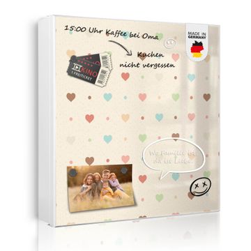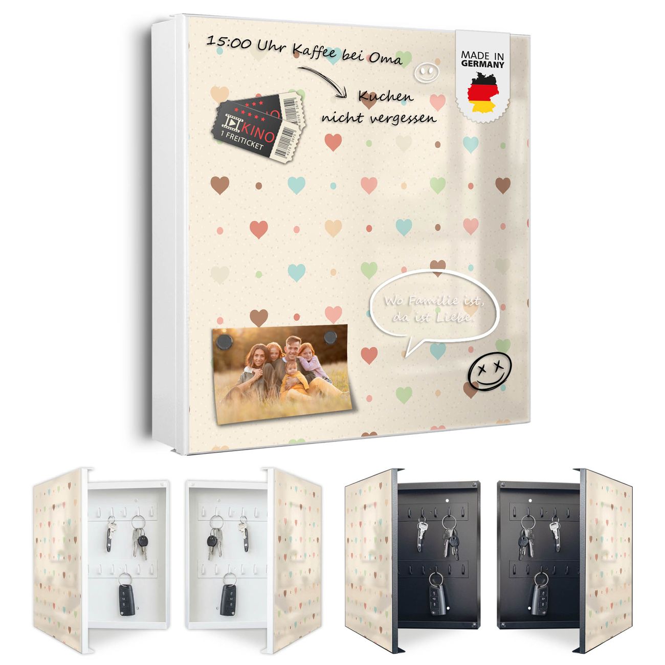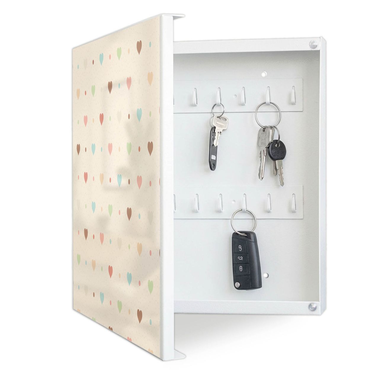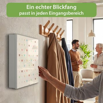 Bringe Ordnung und Eleganz in deinen Eingangsbereich mit dem banjado Schlüsselkasten Motiv Motiv Herzen bunt. Die moderne Schlüsselbox kombiniert funktionales Design mit hochwertiger Verarbeitung und wird so zu einem echten Hingucker in Flur, Büro oder Ferienwohnung. ✅ Stilvolle Schlüsselaufbewahrung mit Motiv Motiv Herzen bunt Der Design-Schlüsselkasten Motiv Motiv Herzen bunt bietet Platz für bis zu 32 Schlüssel, die auf 4 stabilen Reihen mit je 8 Haken übersichtlich verstaut werden. Mit seinen kompakten Maßen von 30 x 30 x 5 cm passt die Schlüsselbox perfekt auch in kleinere Räume. Der weiß lackierte Stahlkorpus mit links angeschlagenem Türscharnier harmoniert mit gedruckten Folie auf der Front und fügt sich nahtlos in jedes Wohnambiente ein. Ob als Schlüsselorganizer für Zuhause oder als praktische Lösung für Büros, Praxen und Gewerbe, der banjado Schlüsselkasten sorgt für Ordnung und Übersicht. Dank der magnetischen, mit Kreidestiften beschreibbaren Folie auf der Front kannst du Notizen anheften oder Termine direkt auf der Oberfläche festhalten. Die Schlüsselbox Motiv Motiv Herzen bunt zur Wandmontage wird inklusive Befestigungsmaterial geliefert und ist schnell angebracht. So hast du deine Schlüssel jederzeit griffbereit und zugleich stilvoll verstaut. Mit diesem banjado Schlüsselkasten Motiv Motiv Herzen bunt kombinierst du praktische Aufbewahrung mit stilvollem Wohndesign. Ob privat oder geschäftlich, die Schlüsselbox sorgt für mehr Ordnung, Übersicht und ein wohnliches Ambiente.Vorteile im Überblick