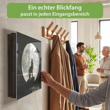 Bringe Ordnung und Eleganz in deinen Eingangsbereich mit dem banjado Schlüsselkasten Motiv Motiv Heulender Wolf SW. Die moderne Schlüsselbox kombiniert funktionales Design mit hochwertiger Verarbeitung und wird so zu einem echten Hingucker in Flur, Büro oder Ferienwohnung. ✅ Stilvolle Schlüsselaufbewahrung mit Glasfront im Motiv Motiv Heulender Wolf SW Der Design-Schlüsselkasten Motiv Motiv Heulender Wolf SW bietet Platz für bis zu 50 Schlüssel, die auf 5 stabilen Reihen mit je 10 Haken übersichtlich verstaut werden. Mit seinen kompakten Maßen von 30 x 30 x 5 cm passt die Schlüsselbox perfekt auch in kleinere Räume. Der schwarz lackierte Stahlkorpus mit rechts angeschlagenem Türscharnier harmoniert mit der Glasfront und fügt sich nahtlos in jedes Wohnambiente ein. Ob als Schlüsselorganizer für Zuhause oder als praktische Lösung für Büros, Praxen und Gewerbe, der banjado Schlüsselkasten sorgt für Ordnung und Übersicht. Dank der magnetischen, mit Kreidestiften beschreibbaren Glasfront kannst du Notizen anheften oder Termine direkt auf der Oberfläche festhalten. Die Schlüsselbox Motiv Motiv Heulender Wolf SW zur Wandmontage wird inklusive Befestigungsmaterial geliefert und ist schnell angebracht. So hast du deine Schlüssel jederzeit griffbereit und zugleich stilvoll verstaut. Mit diesem banjado Schlüsselkasten Motiv Motiv Heulender Wolf SW kombinierst du praktische Aufbewahrung mit stilvollem Wohndesign. Ob privat oder geschäftlich, die Schlüsselbox sorgt für mehr Ordnung, Übersicht und ein wohnliches Ambiente.Vorteile im Überblick
